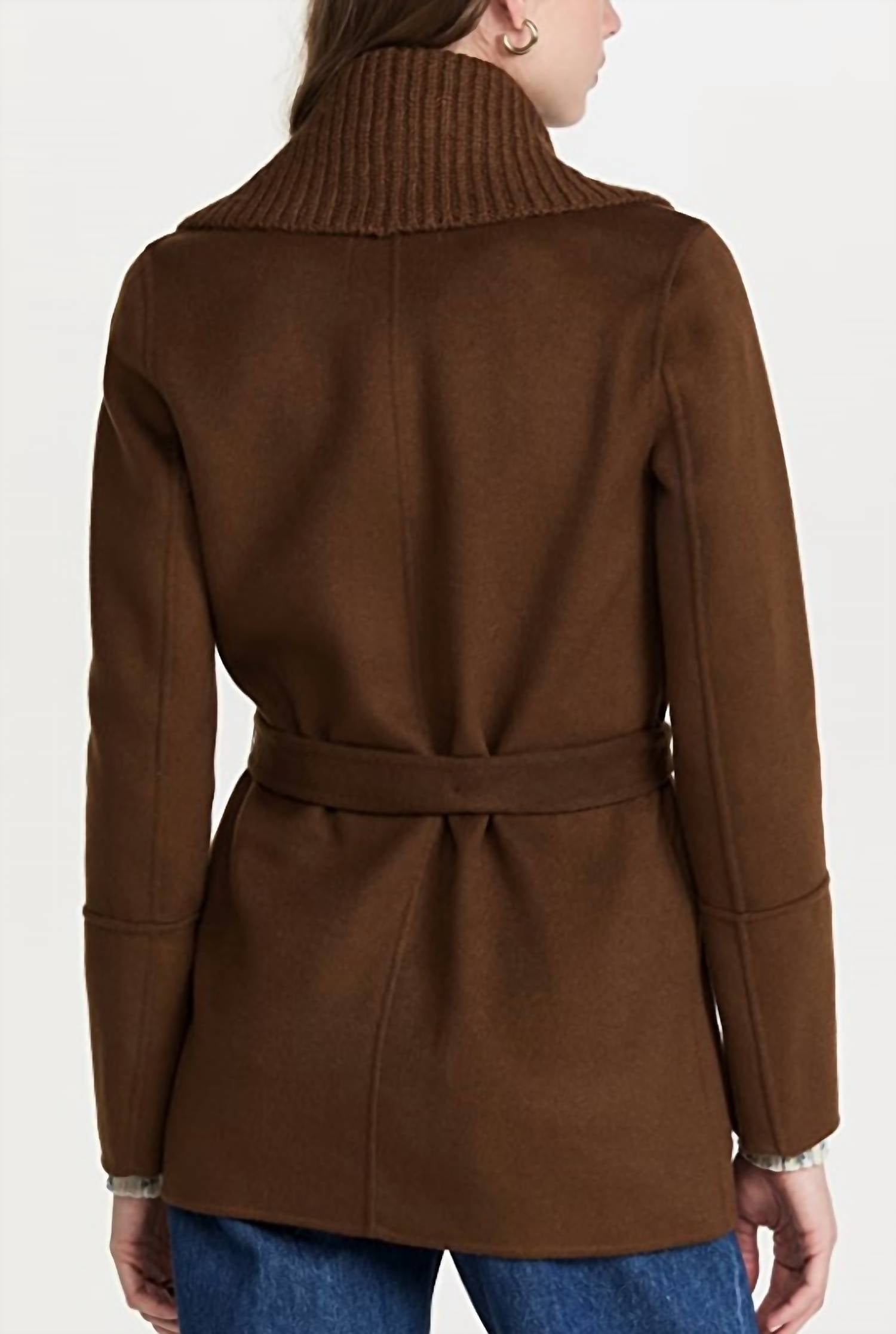 Semi-fitted. Mid-thigh length. Notch collar (under rib collar). Detachable chunky rib knit shawl collar. Belted. Angled welt pockets with stitch around. Unlined. Hand-finished seams. Dry clean only.