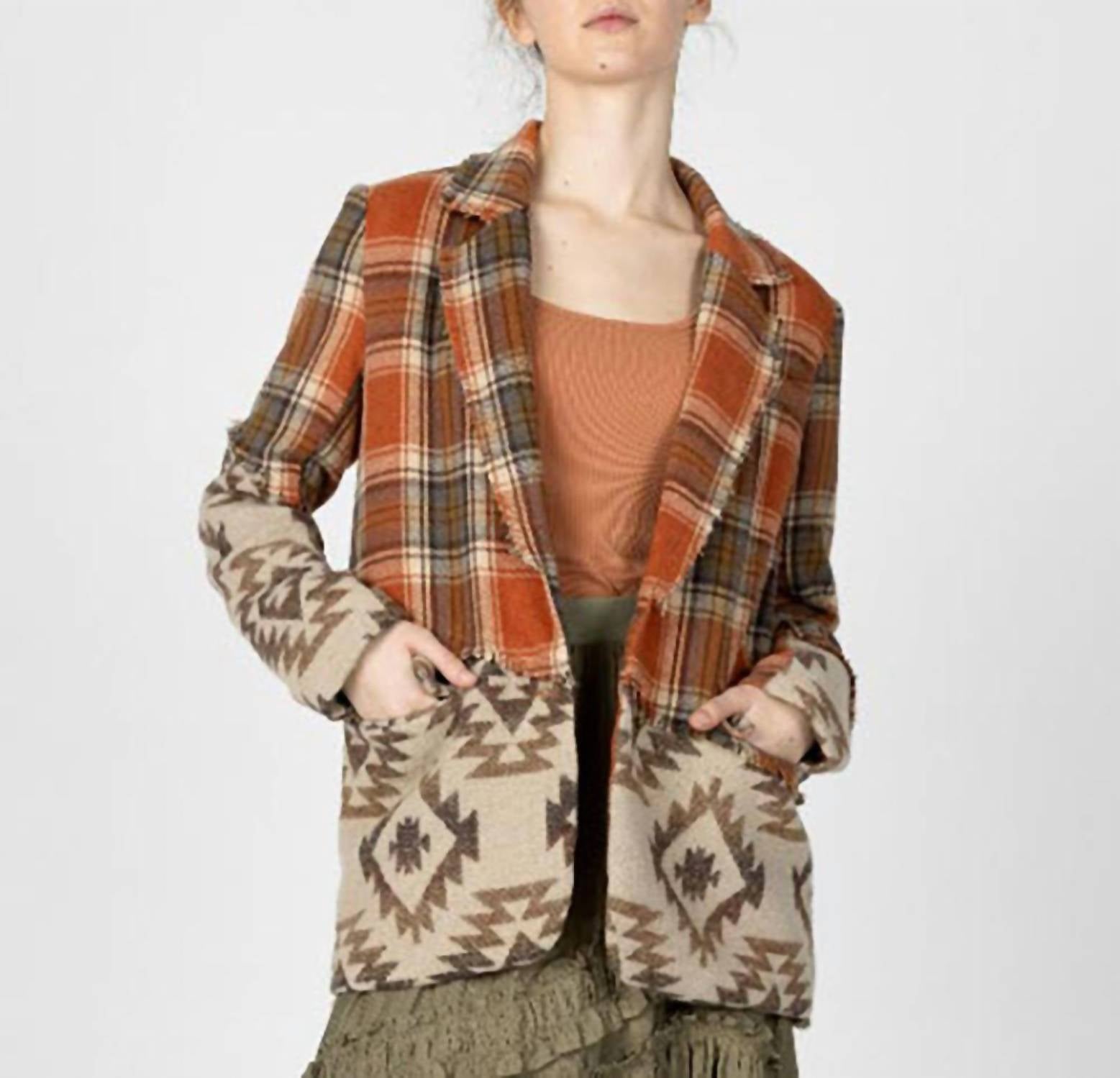 Miss Me - Women's Plaid Mixed Aztec Print Blazer