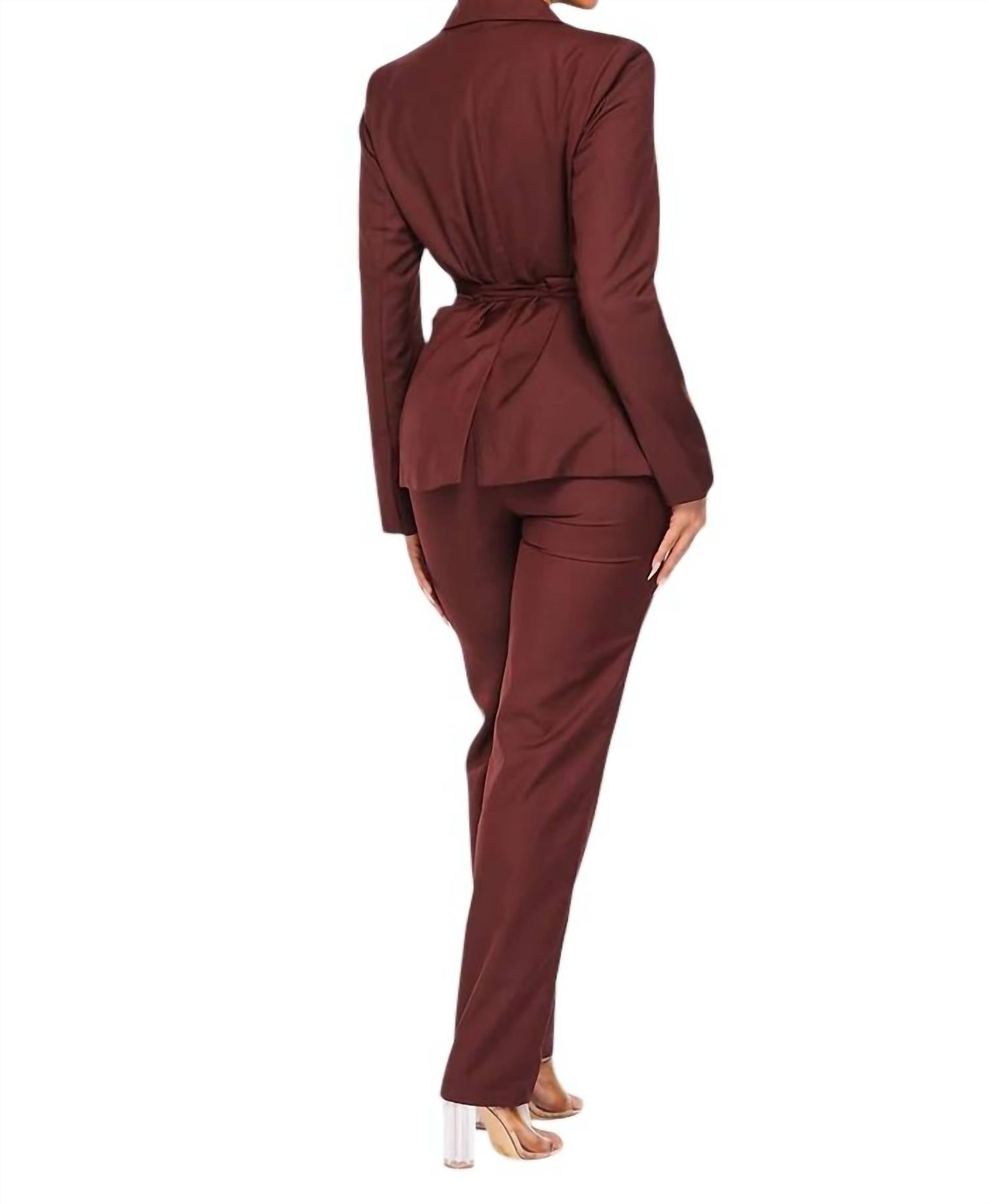 Introducing the Solid Jacket and Pants Set by RIVIR, an epitome of chic versatility in a rich brown hue. This stylish ensemble features a blazer-style jacket with long sleeves, designed with convenient front pocket flaps and a waist tie for a tailored fit. Crafted from a comfortable cotton blend composed of 65% cotton and 35% polyester, it ensures both durability and breathability. The set is completed with long-leg pants featuring front ties, making it a perfect blend of fashion-forward style and practicality.