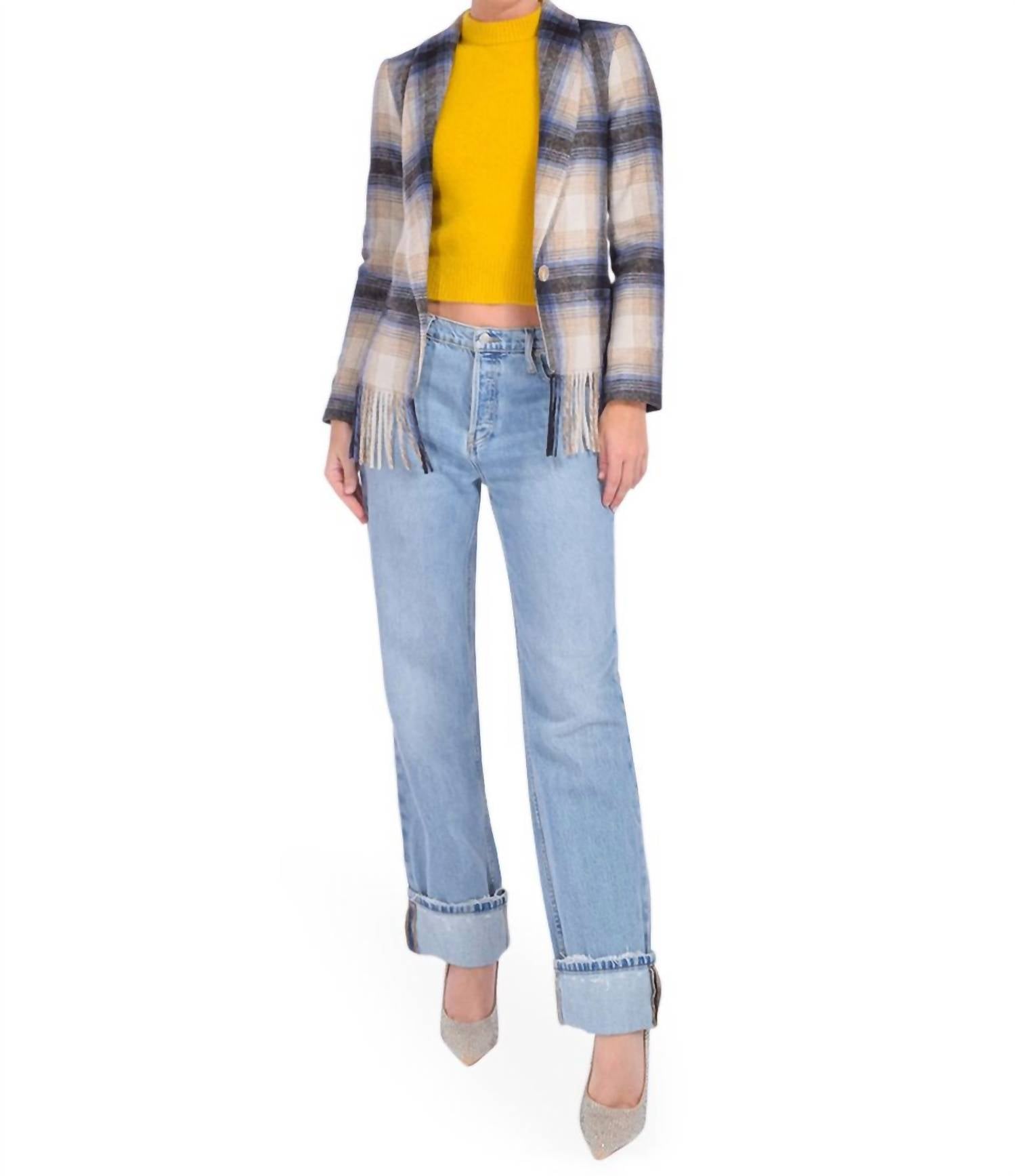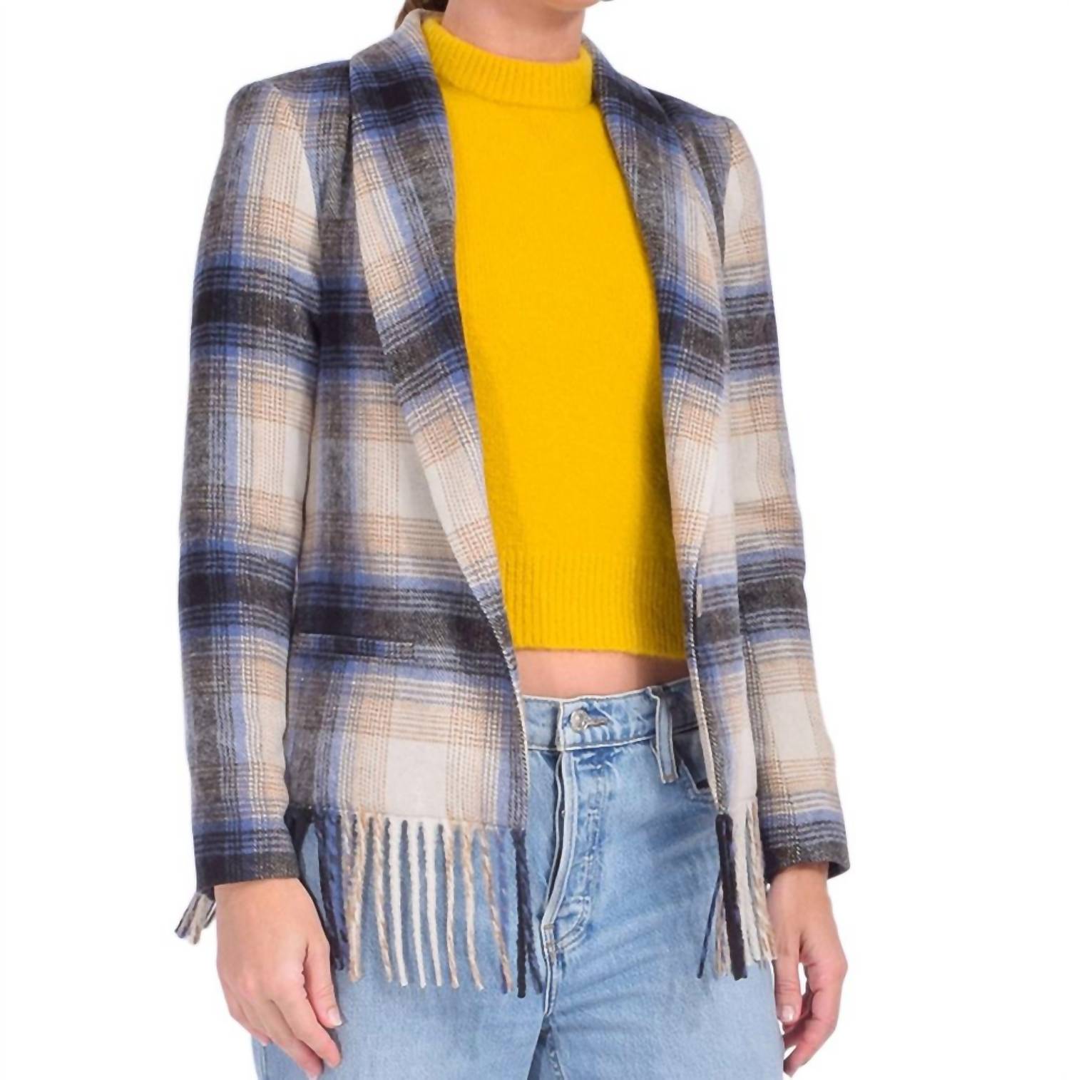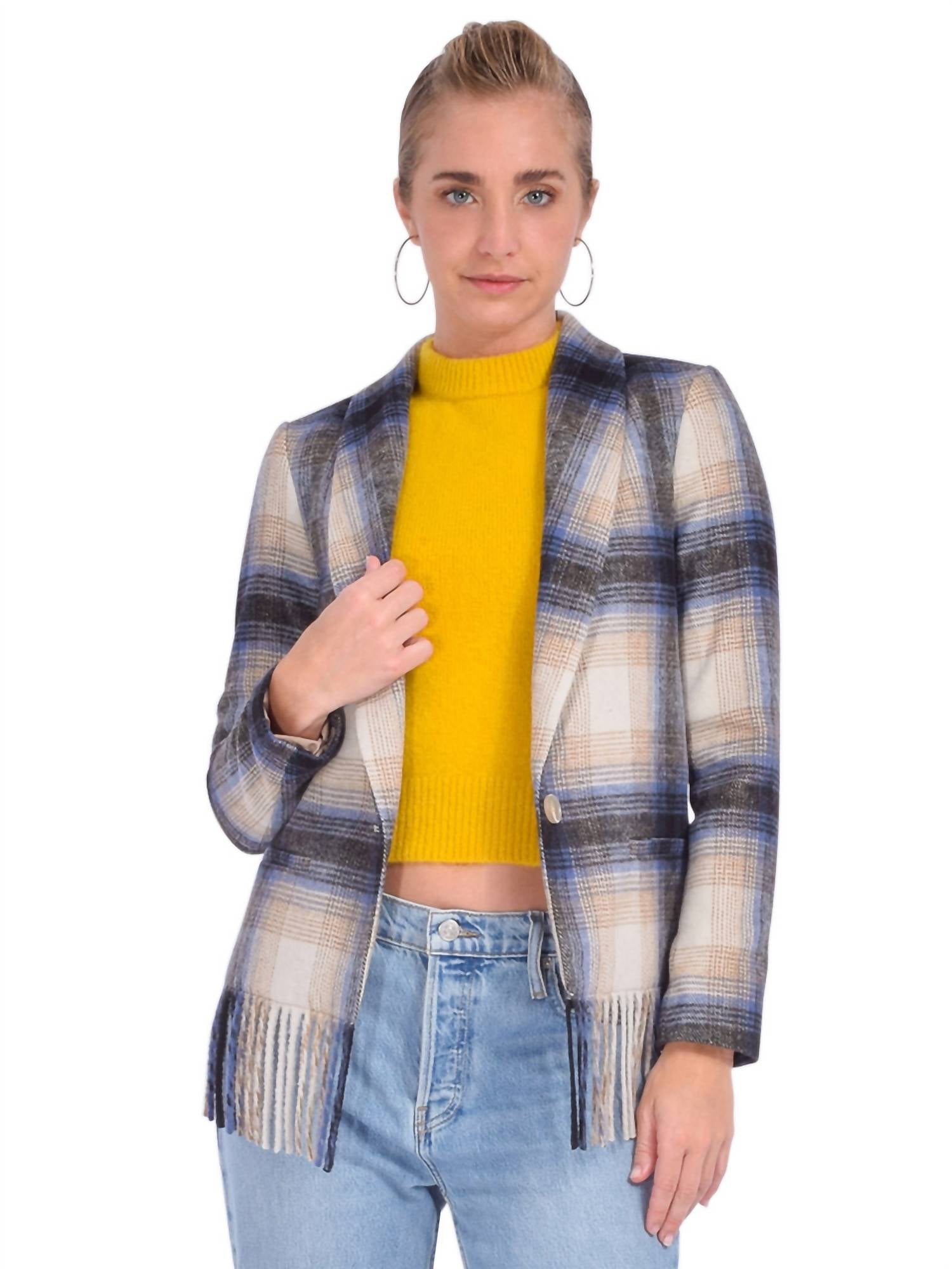 An elevated version of your favorite classic blazer. Introducing the Prince Blazer by DREW, a sophisticated choice in denim plaid perfect for your autumn outings. This women's blazer features long sleeves and a stylish collar, offering effortless elegance for any dinner party or Thanksgiving occasion. Crafted from a blend of 80% polyester, 10% nylon, and 10% acrylic, it includes functional pockets and a comfortable lining.