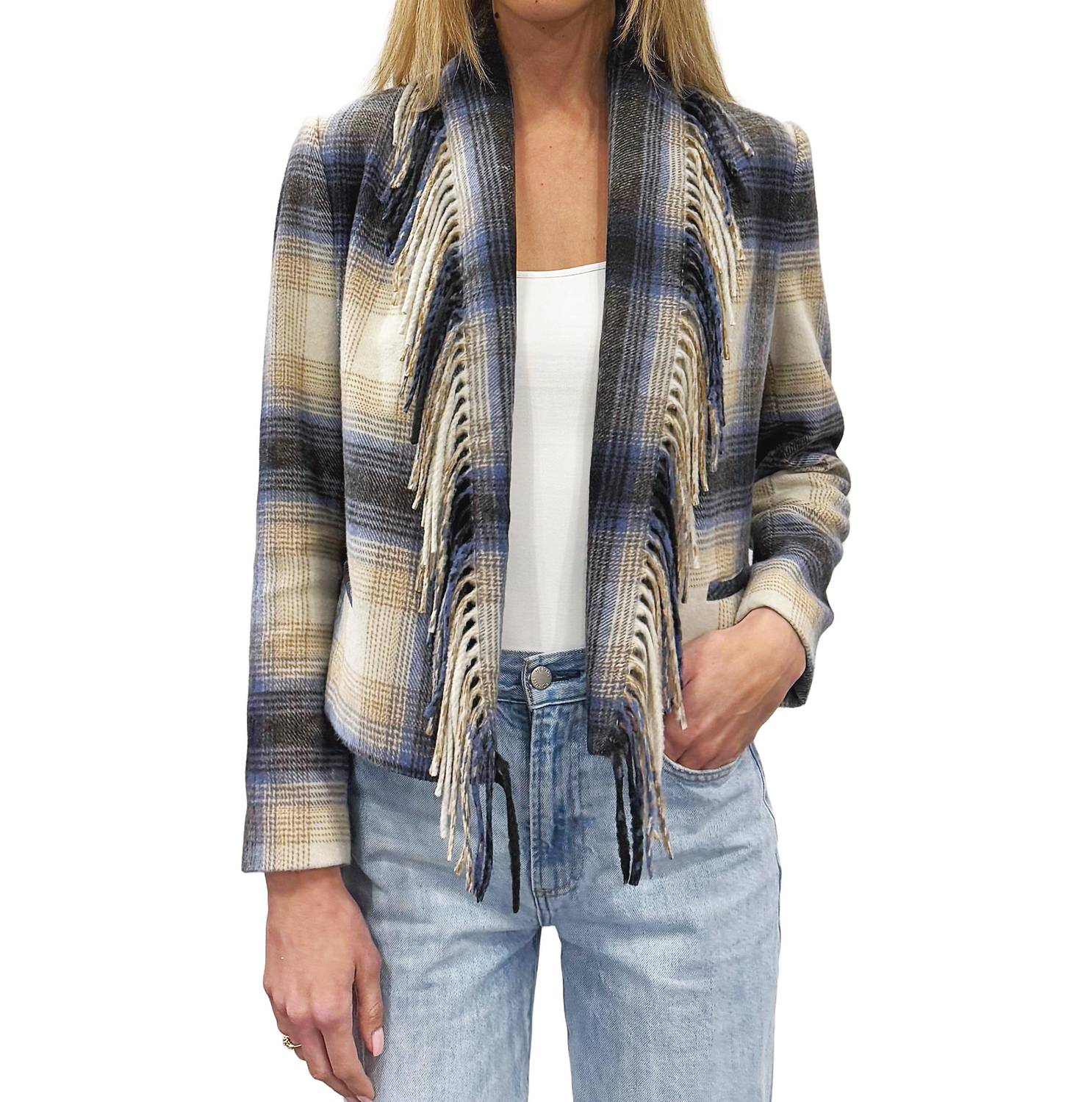 A blazer so versatile you can wear it to the office or pair it with jeans for a more casual look. Elevate your summer streetwear with the Warren Open Front Knit Blazer by DREW in a striking indigo plaid and check pattern. This women's blazer boasts long sleeves and a classic collar neckline, crafted from 100% durable polyester. Designed with a convenient pull-on closure, it’s perfect for holiday parties, especially Mother's Day. Notably, it’s unlined and pocketless for a streamlined silhouette, so care instructions are not applicable.