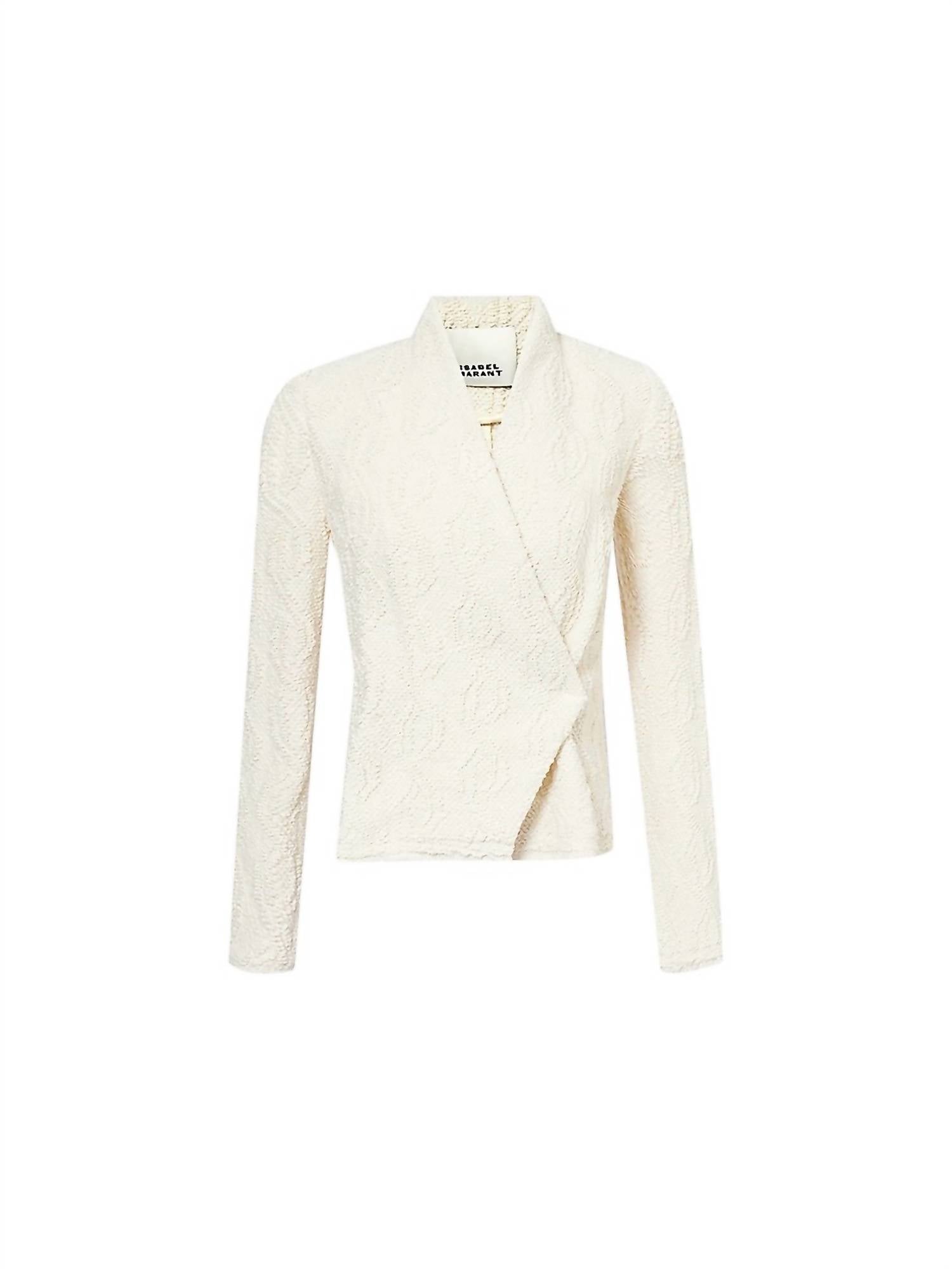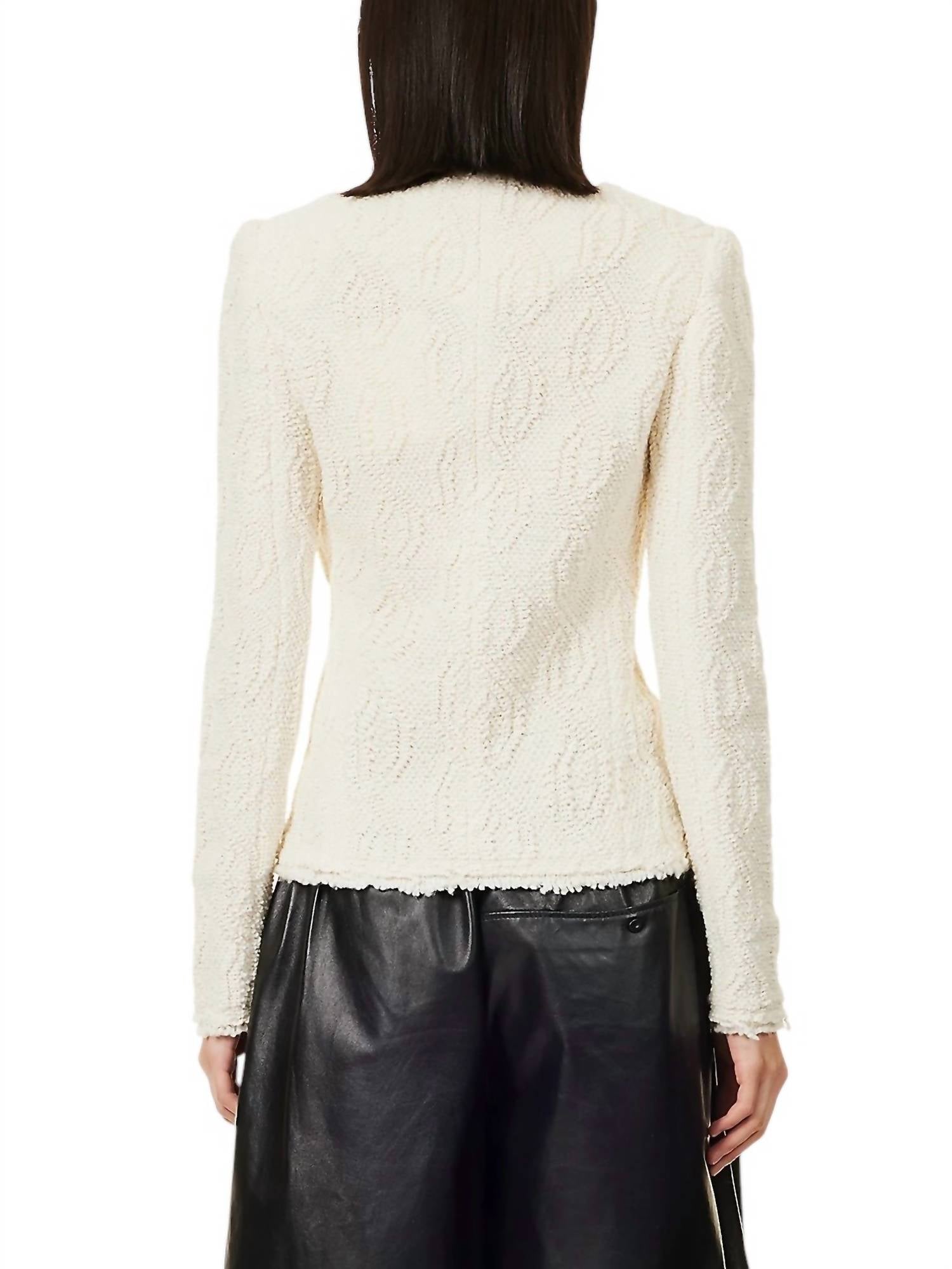Introducing the LOYONA BOUCLE SWEATER JACKET by ISABEL MARANT, a versatile blend of elegance and comfort in a creamy hue. With long sleeves and crafted from a luxurious mix of 54% wool, 30% acrylic, 8% polyester, 6% polyamide, and 2% aluminium, this jacket provides a midweight, stretchy feel perfect for layering. Its slim fit is accentuated by a V neck, double-breasted design with padded shoulders, featuring a cable-knit pattern and fringed trims for added texture. The jacket fastens with a snap closure, ensuring a true-to-size fit that is best maintained by dry cleaning.