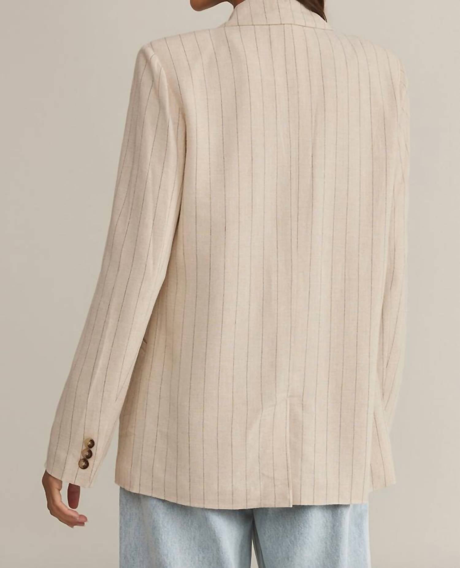 A blazer so versatile you can wear it to the office or pair it with jeans for a more casual look. Elevate your workwear with the Livingston Pinstripe Blazer by Z Supply, tailored for women who appreciate refined style. Crafted with long sleeves and a classic collar, this relaxed fit blazer boasts a button front closure and convenient welt pocket, adding functional flair. Made from a textured blend of 80% Viscose and 20% Linen, it offers a midweight feel with a heavy soft wash, ensuring comfort throughout the fall season. Embrace the flax-colored pinstripe pattern for sophisticated occasions like Thanksgiving dinners.