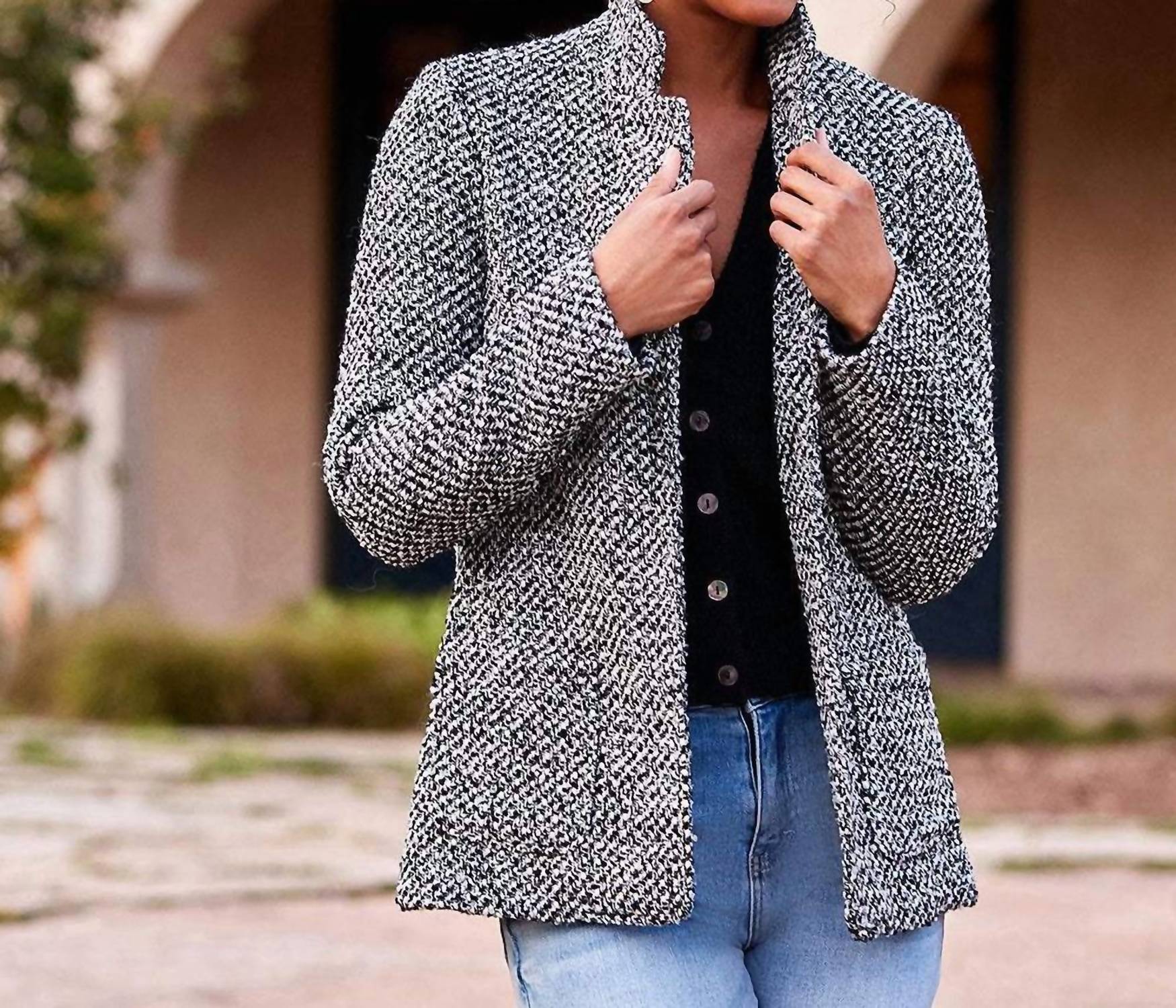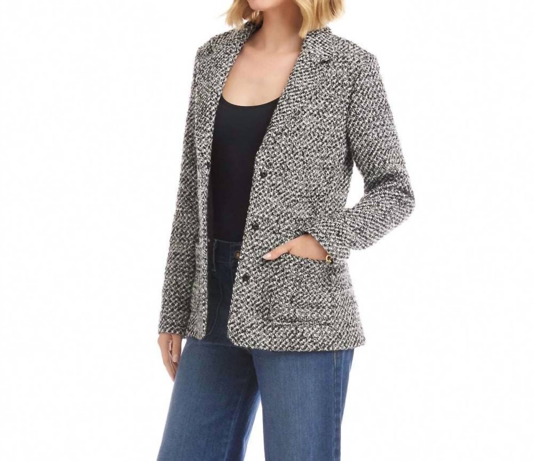 A blazer so versatile you can wear it to the office or pair it with jeans for a more casual look. Elevate your wardrobe with the Black With Off White Tweed Blazer by Karen Kane, a chic essential for any occasion. This tailored blazer features long sleeves and a classic collared neckline, designed in a textured woven fabric for a sophisticated look. Its composition includes 50% Acrylic, 30% Wool, and 20% Polyester, with a fully lined interior made of 97% Polyester and 3% Spandex for a comfortable fit. Closure: Front snap closures. Care: Dry clean only. Length: 27 3/4 inches (Size M), with functional front pockets for added convenience. Made in an imported design that hits right at the hip.