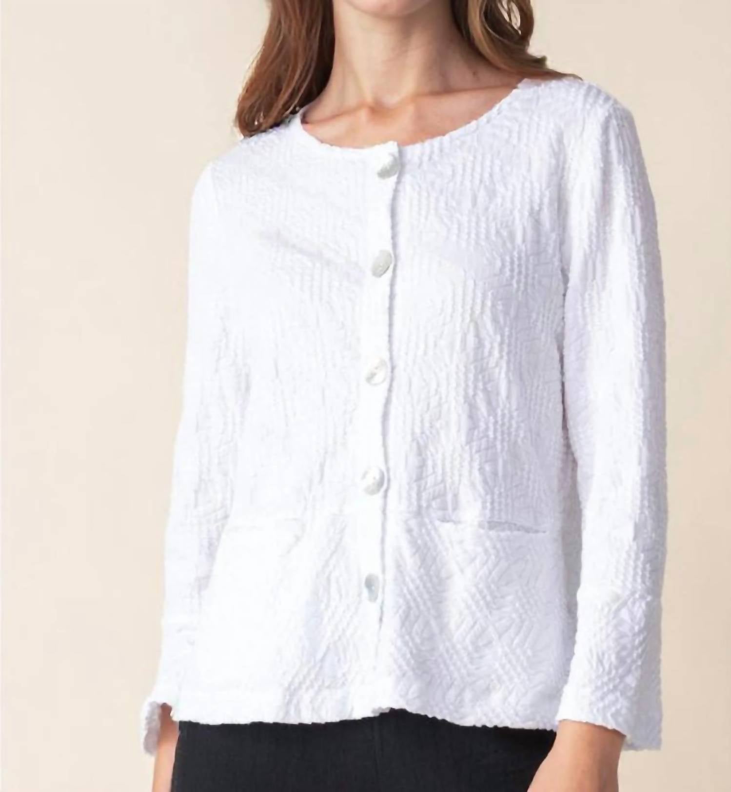 A blazer so versatile you can wear it to the office or pair it with jeans for a more casual look. The Sunburst Knit pattern of this versatile jacket adds interest and style. It features a button front closure, long sleeves with a flared cuff and a little extra peplum flounce above the hem with a little stretch. Front pockets complete the utility of this wardrobe must. Machine wash cold gentle, tumble dry low Small measures 40" bust, 22" length Medium measures 42" bust, 22" length XL measures 46" bust, 23" length