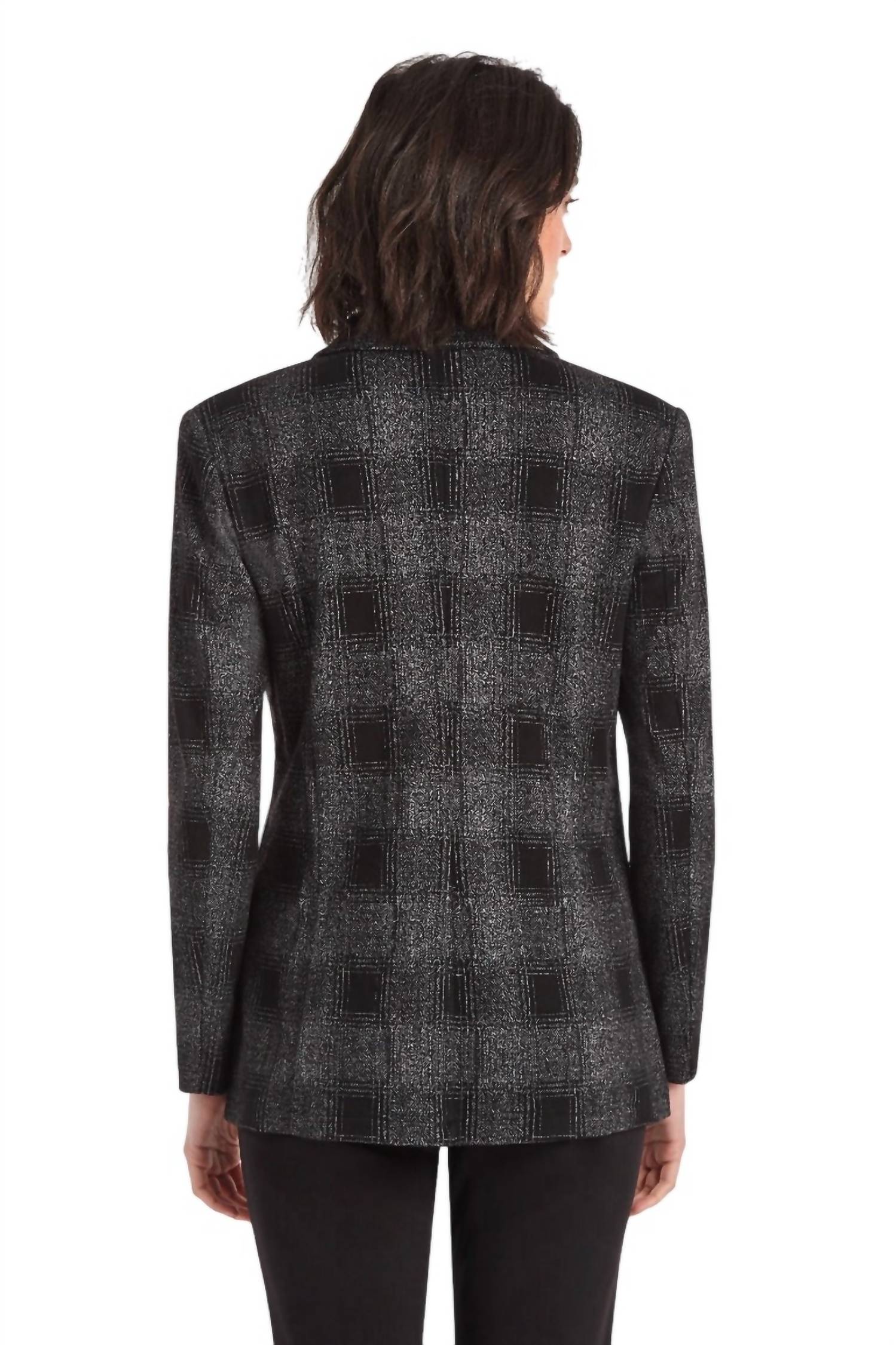 All-knit blazer with stretch. Slightly oversized and has removable shoulder pads. Blazer Fit Type - Comfort Fit. Model is 5'11" and wearing a size small. 49% Rayon, 48% Polyester, 3% Spandex. Machine Wash Cold, Do Not Bleach, Lay Flat To Dry, Cool Iron If Needed, Or Dry Clean. Imported.