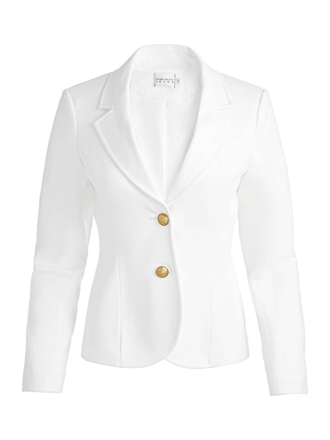 Tailored to perfection, this blazer will be your go-to jacket for years to come. Introducing the Iana Denim Sculpted Blazer by alice + olivia, a sophisticated piece in solid off-white with a peplum fit that defines the waist. Crafted from a premium cotton blend composition of 94% cotton, 5% elastomultiester, and 1% elastane, this long-sleeve blazer features a stylish collar and practical button closure. With a length from the shoulder of 23.5 inches, it offers a true-to-size fit and is a chic addition to any wardrobe. Care for this elegant piece by following the dry clean only instructions. Model is 5'10" and wearing a size 0.
