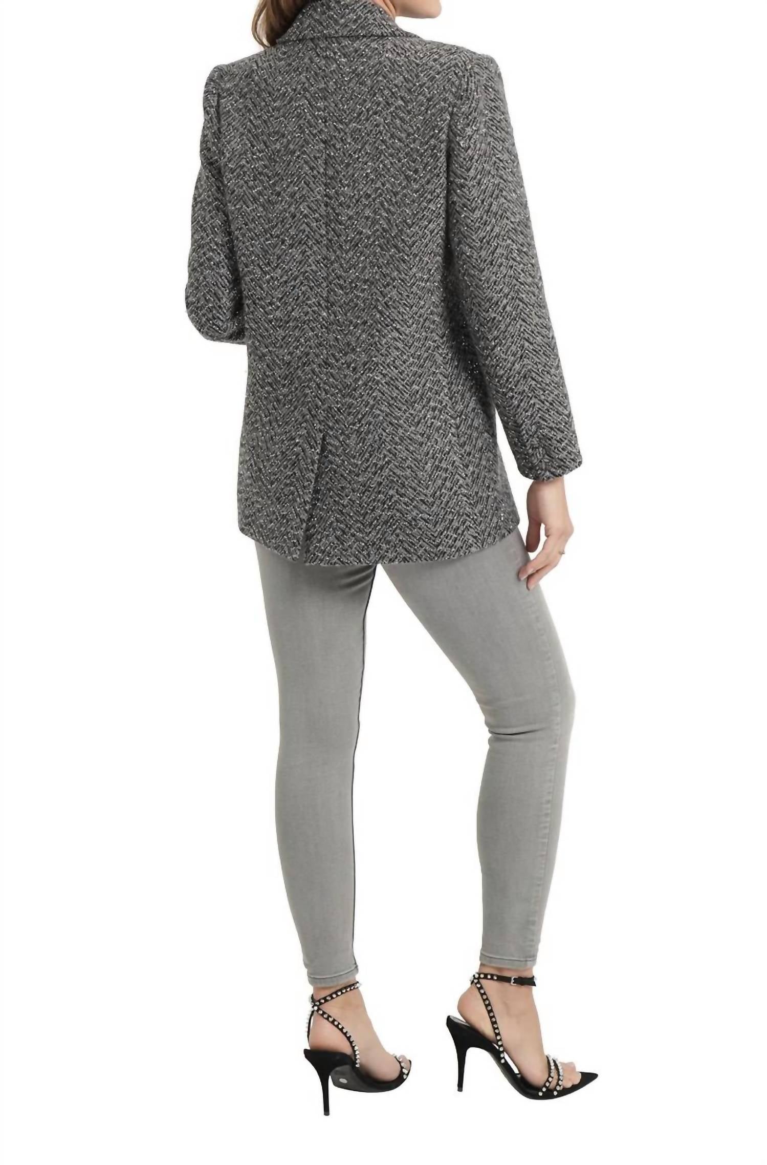 Tailored to perfection, this blazer will be your go-to jacket for years to come. Introducing the Marcus Jeweled Boyfriend Blazer by LOVE TOKEN, a stylish addition for any minimalist wardrobe this fall. Featuring long sleeves and a luxurious blend of 60% Nylon and 40% Cotton with a 100% Polyester lining, this blazer offers a comfortable straight fit. The blazer is designed with a notched lapel collar, button closure, and convenient front flap pockets. Whether for a holiday party or Thanksgiving, this charcoal-hued piece is a perfect choice. Model is 5'9" and wearing a size small.