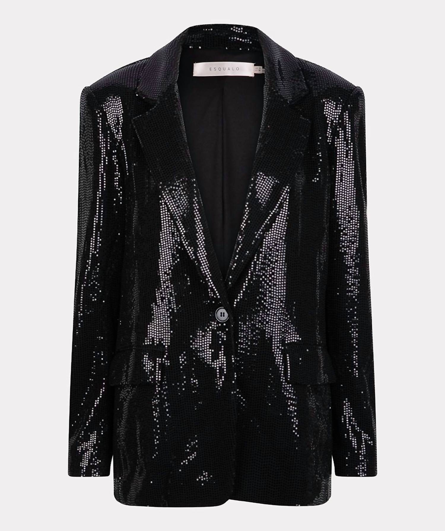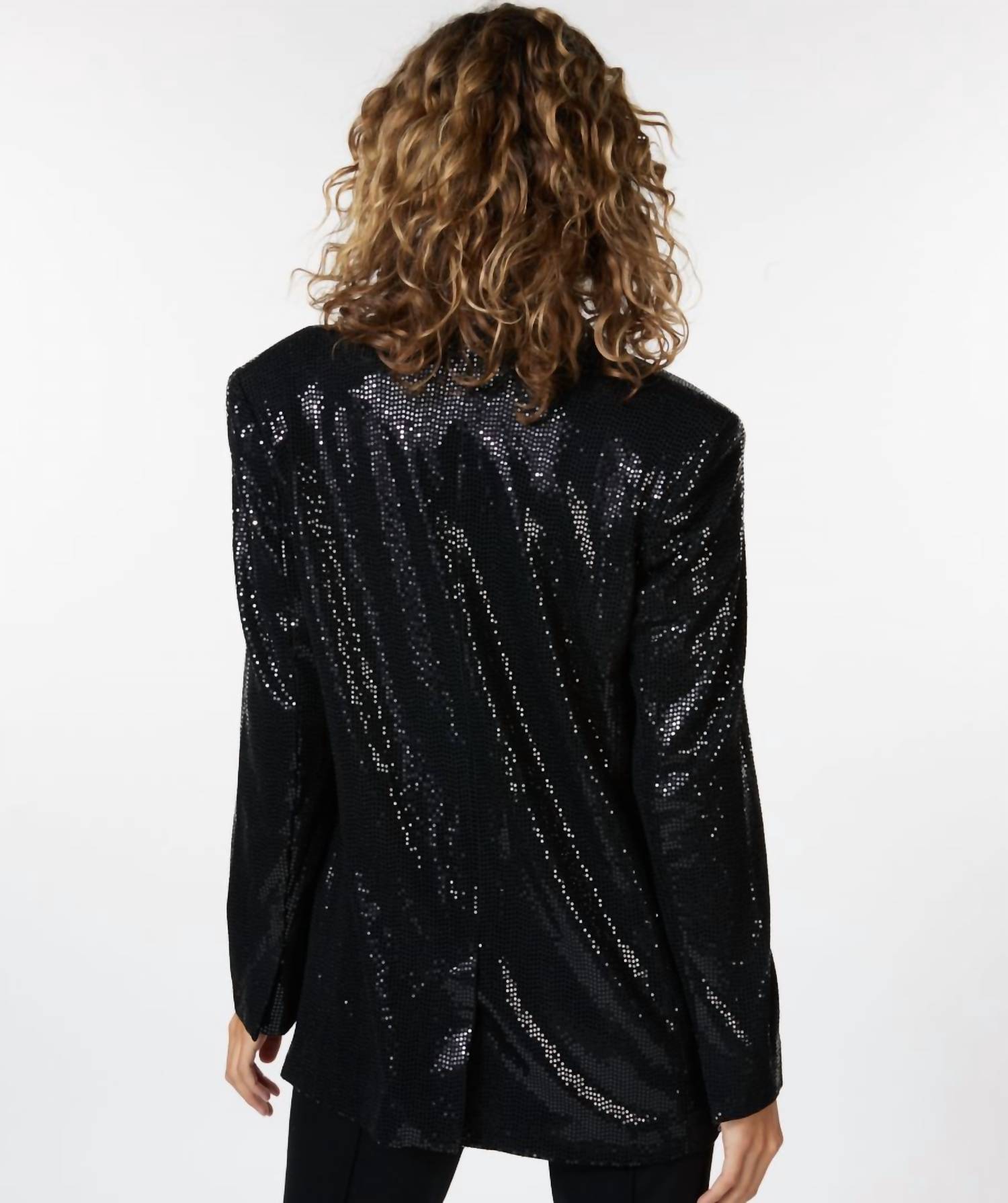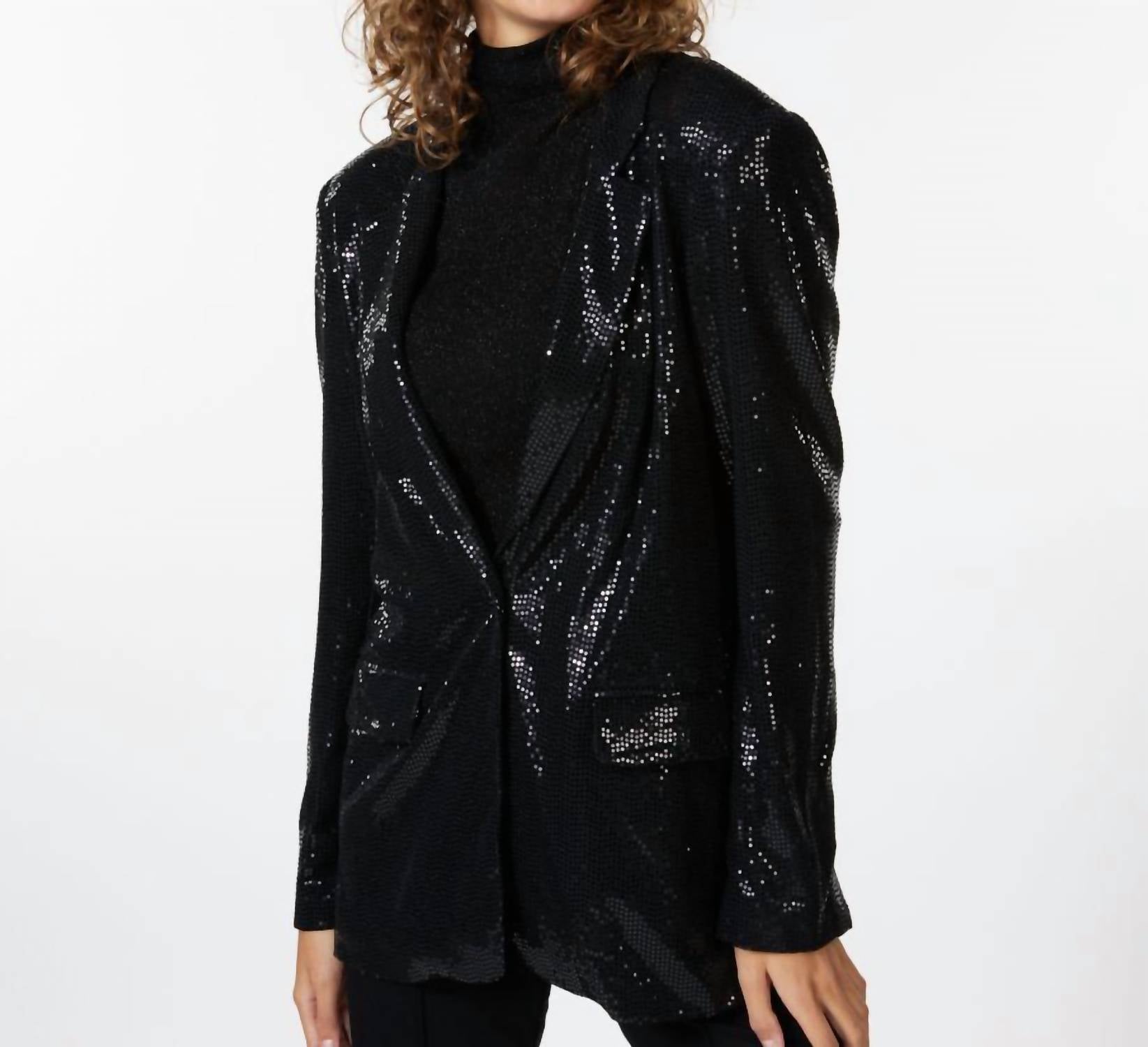 This black blazer showcases long sleeves and a classic lapel collar, designed with an all-over sequin finish for a touch of glamour. Crafted from a blend of 70% Rayon, 26% Nylon, and 4% Spandex, it ensures a comfortable fit while running true to size. Completed with a button closure and lined interior.