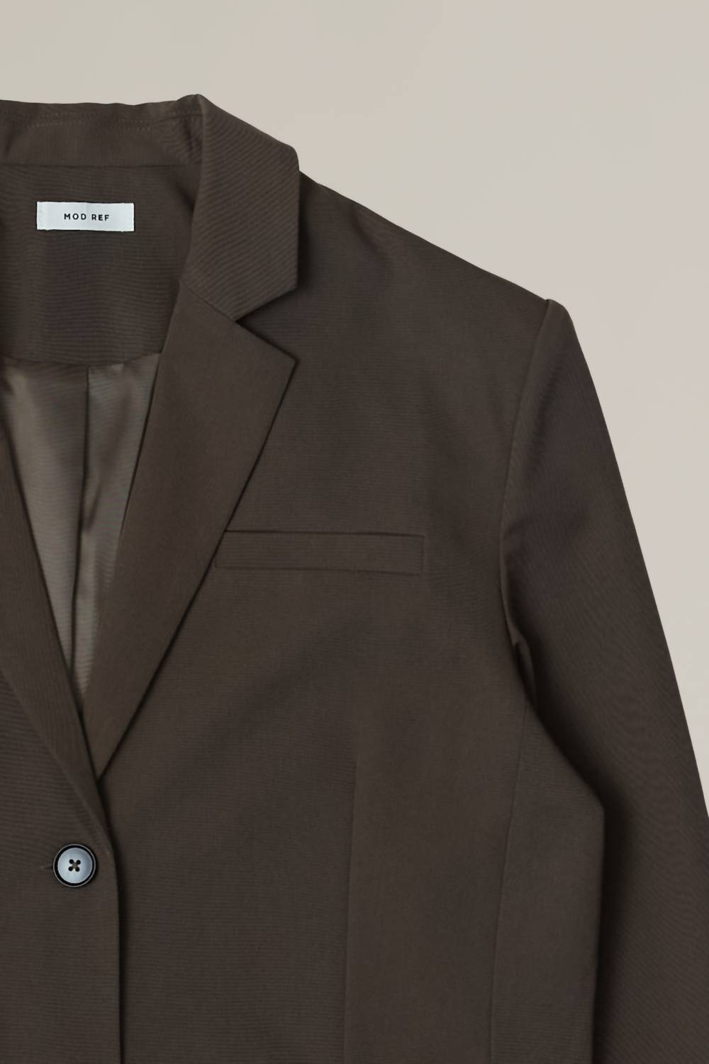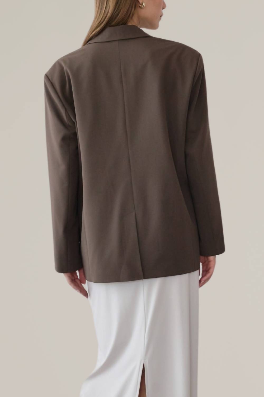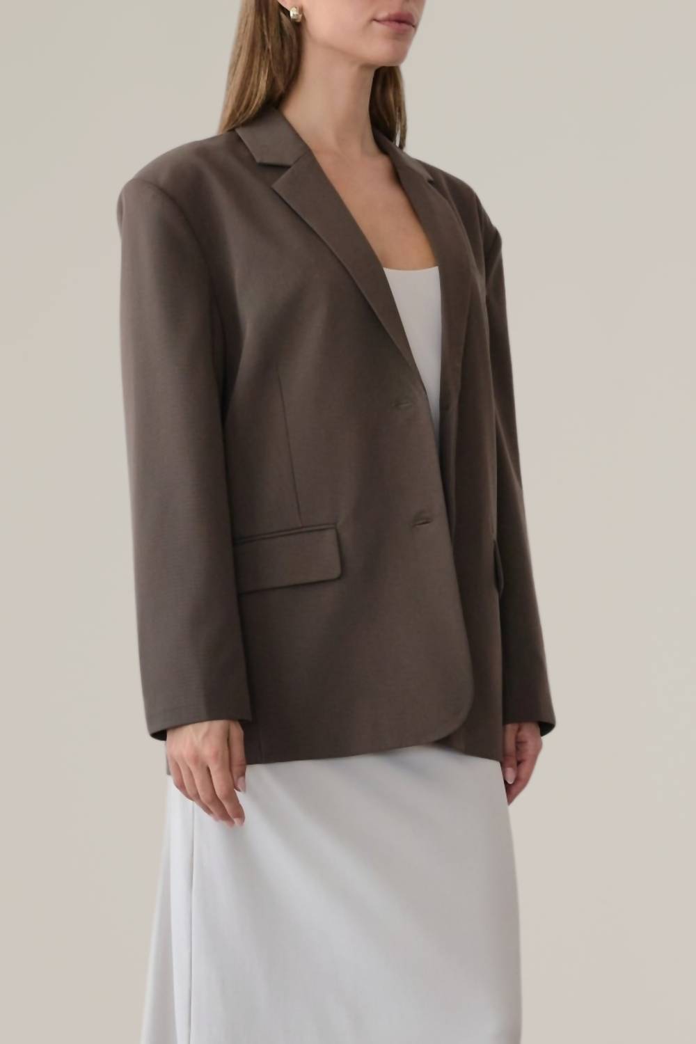 Introducing the Classic Two Button Front Blazer by MOD REF, a versatile staple for any wardrobe. With long sleeves and an oversized fit featuring shoulder pads, this brown blazer offers a chic structured silhouette. Composition: self is 80% polyester, 16% rayon, and 4% spandex; lining is 100% polyester. Closure: Button. Pockets: Two front flap pockets and a welt pocket. Detail: Back slit. Care: Dry clean only. Lined for a polished finish, it pairs effortlessly with dress pants or denim for a sophisticated look. Model is wearing a size small.