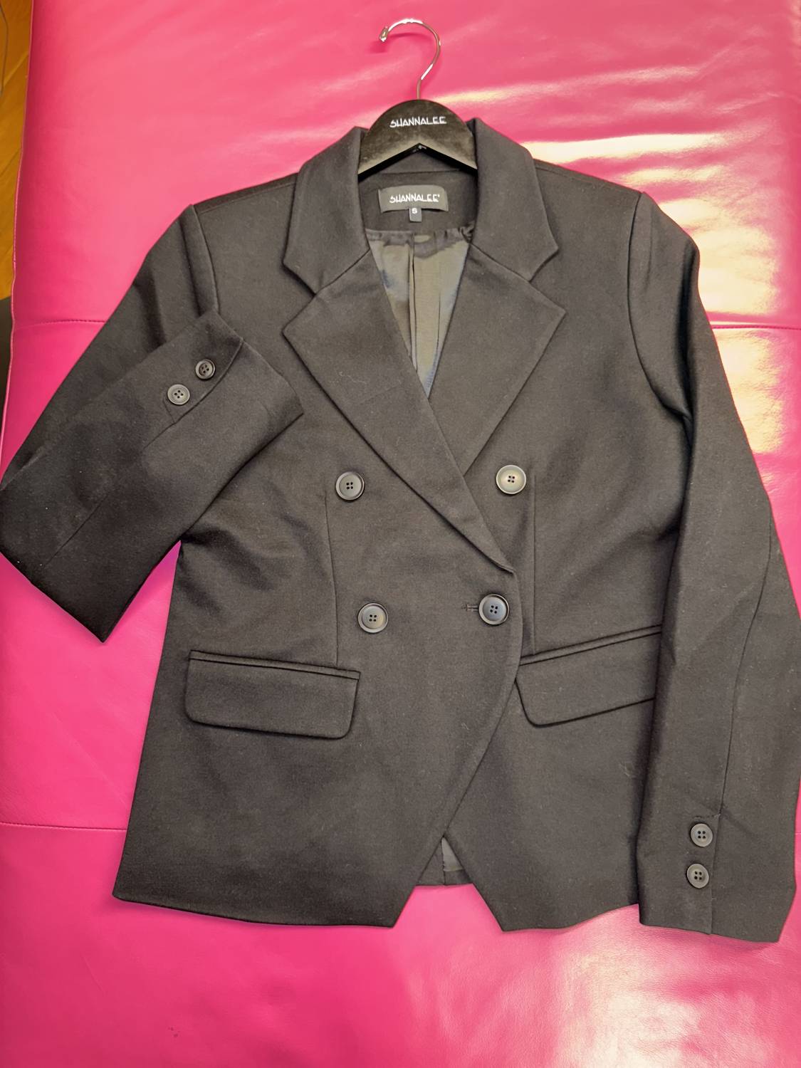 An elevated version of your favorite classic blazer. THIS PONTE BLAZER IS THE QUALITY OF YOUR DREAMS. IT FITS BEAUTIFULLY WITH A UNIQUE CUT OUT AT THE HEM FOR SITTING. BACK KICK PLEAT GIVES FLATTERING BACK AS WELL. 2 FUNCTIONAL OUTSIDE FLAP POCKETS AND DOUBLE BREASTED CLOSURE. VERY BEAUTIFUL AND A LONG TIME PIECE, PAIRS BACK PERFECTLY WITH THE BLACK PONTE SKIRT.