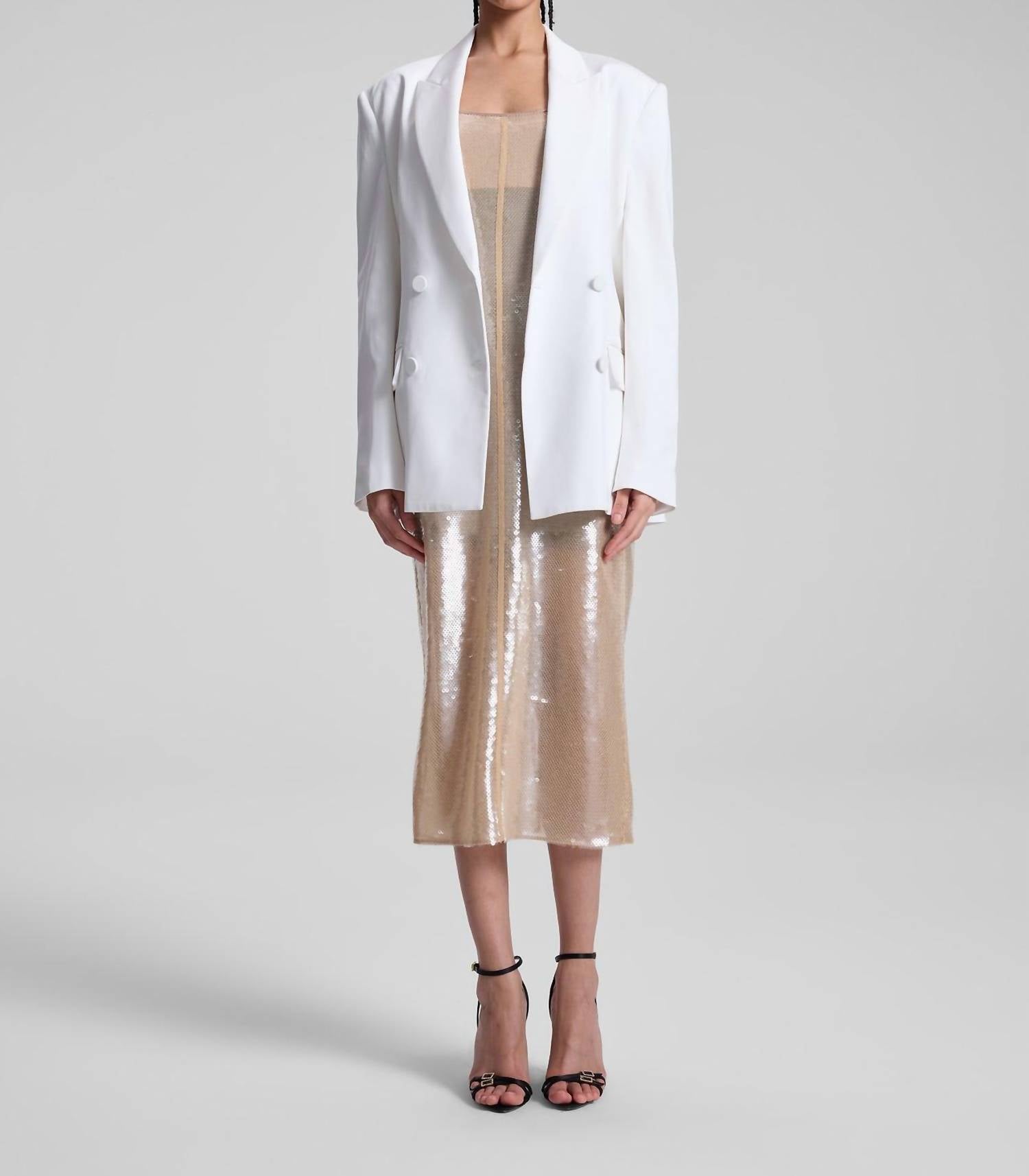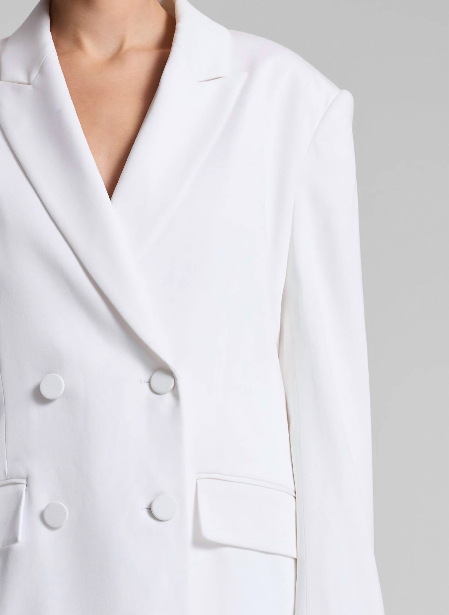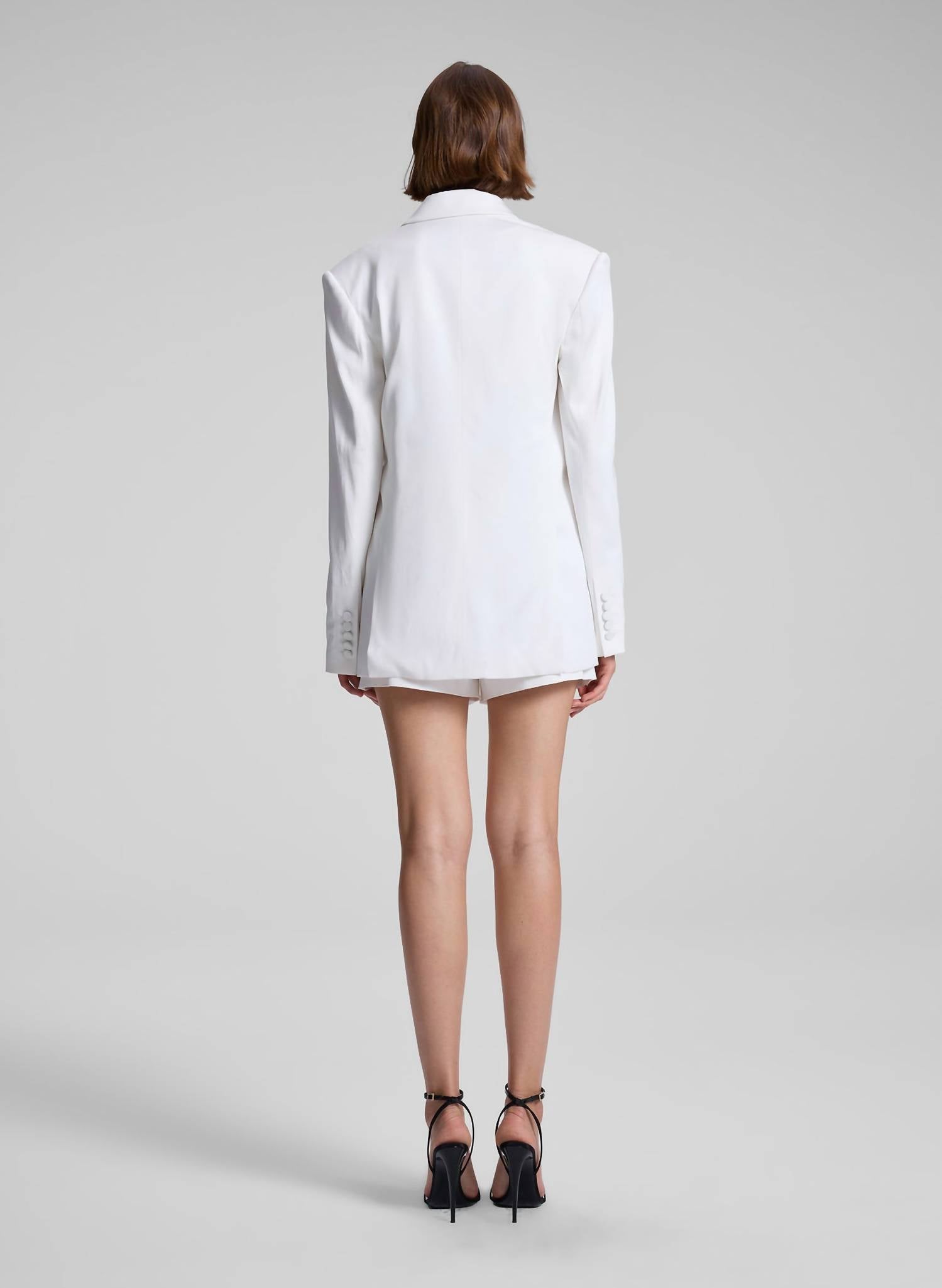 A blazer so versatile you can wear it to the office or pair it with jeans for a more casual look. Introducing the A.L.C. Caleb Soft Suiting Jacket, a sophisticated addition to your wardrobe, perfect for holiday parties. Crafted from a luxurious viscose blend, this long sleeve, white blazer extends to a length of 30.5 inches, offering a minimalist design with sharp, structured shoulders. Featuring a button closure and front flap pockets, it is fully lined for comfort and made to be dry cleaned. Model is 5'10" and wears a size 4, with bust and waist measurements of 31" and 23", respectively.