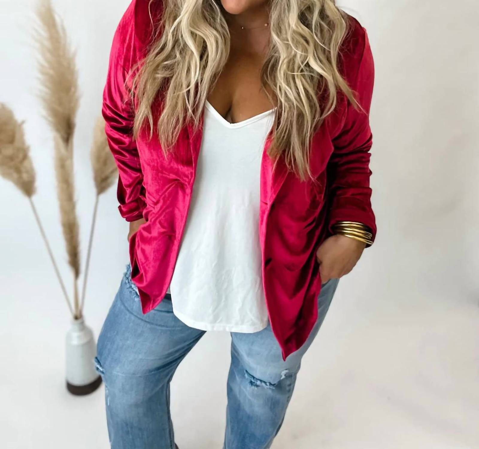 An elevated version of your favorite classic blazer. Elevate your wardrobe with the Everything We Knew Velvet Blazer by BLAKELEY, an eye-catching statement piece in sumptuous Red Wine. Featuring long sleeves, this blazer is crafted from a blend of 95% Polyester and 5% Spandex for added stretch and comfort. It comes with functional front buttons and side pockets, complete with a stretchy soft lining that ensures a comfortable fit. Perfect for adding a touch of sophistication to any look, the blazer also features a classic collar and a solid pattern.