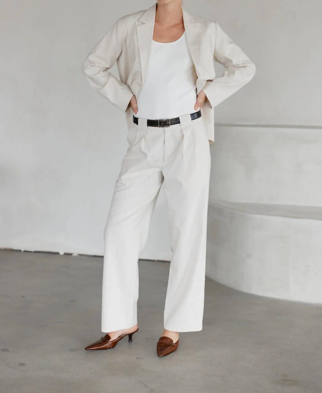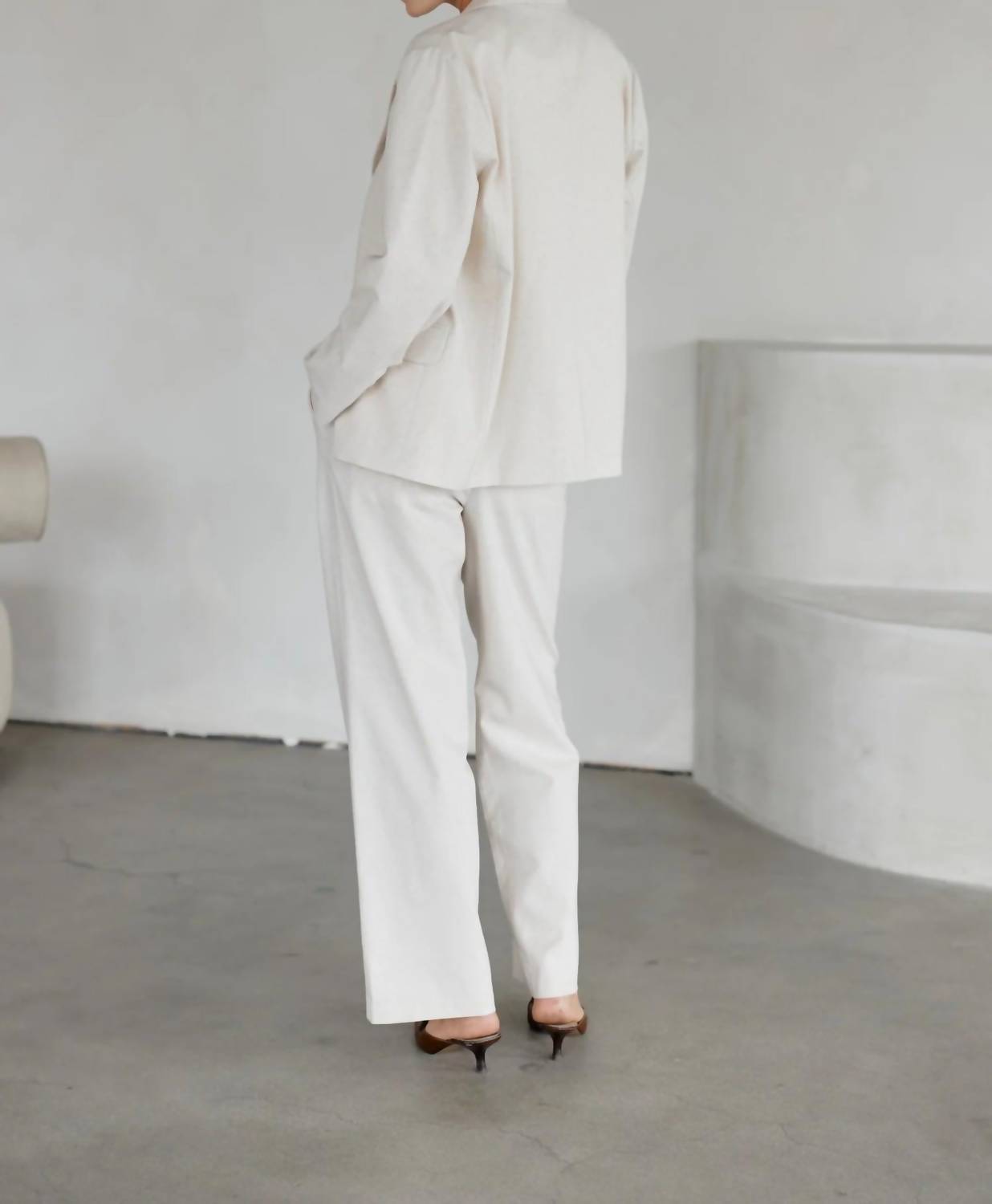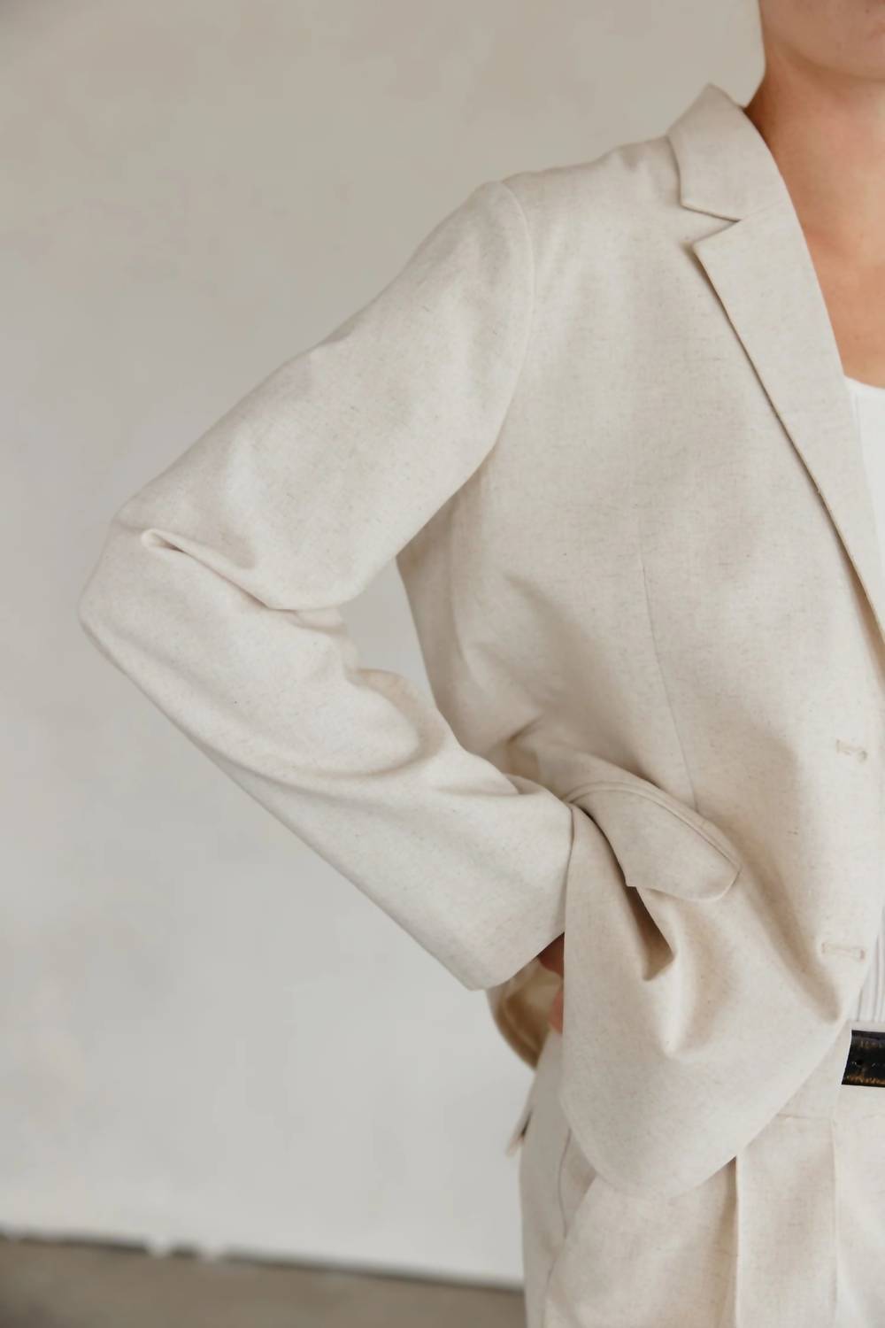 Tailored to perfection, this blazer will be your go-to jacket for years to come. Elevate your style with the Claudia Linen Mix Blazer by MOD REF, crafted in a breathable blend of 70% cotton and 30% linen, lined with 100% cotton for added comfort. This natural, long-sleeve blazer sports a collar neckline and pull-on closure, perfect for evening events where sophistication meets ease. With its practical front flap pockets and stunning button detailing, this single-breasted blazer offers a relaxed fit while keeping pace with preppy trends. Care instructions: Machine wash and line dry to maintain its timeless appeal. Riley, standing at 5'10", wears a size S with measurements of 32" bust, 24" waist, and 35" hips.