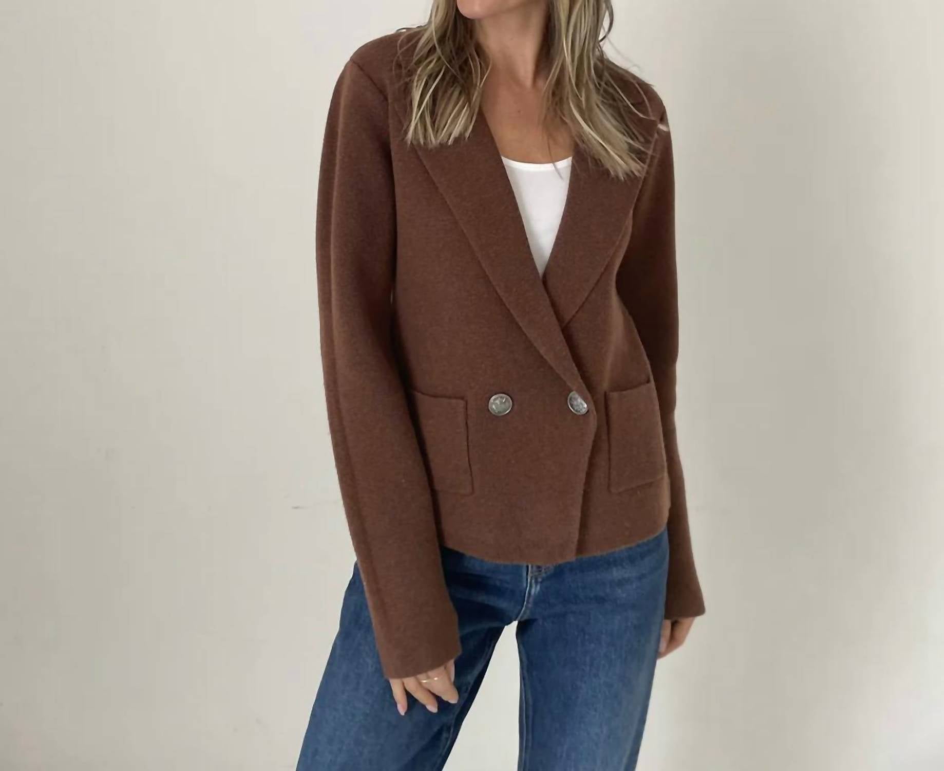 A blazer so versatile you can wear it to the office or pair it with jeans for a more casual look. The Heller Knit Blazer by SIX/FIFTY is designed for year-round wear with its comfortable long sleeves and versatile button closure. Crafted from 88% polyester and 12% nylon, this blazer in brown is as cozy as it is stylish, making it perfect for layering or wearing as a lightweight jacket. It features a classic collar and handy pockets, adding both flair and functionality to your wardrobe. For care, hand wash and lay flat to dry. Model is wearing a size S.