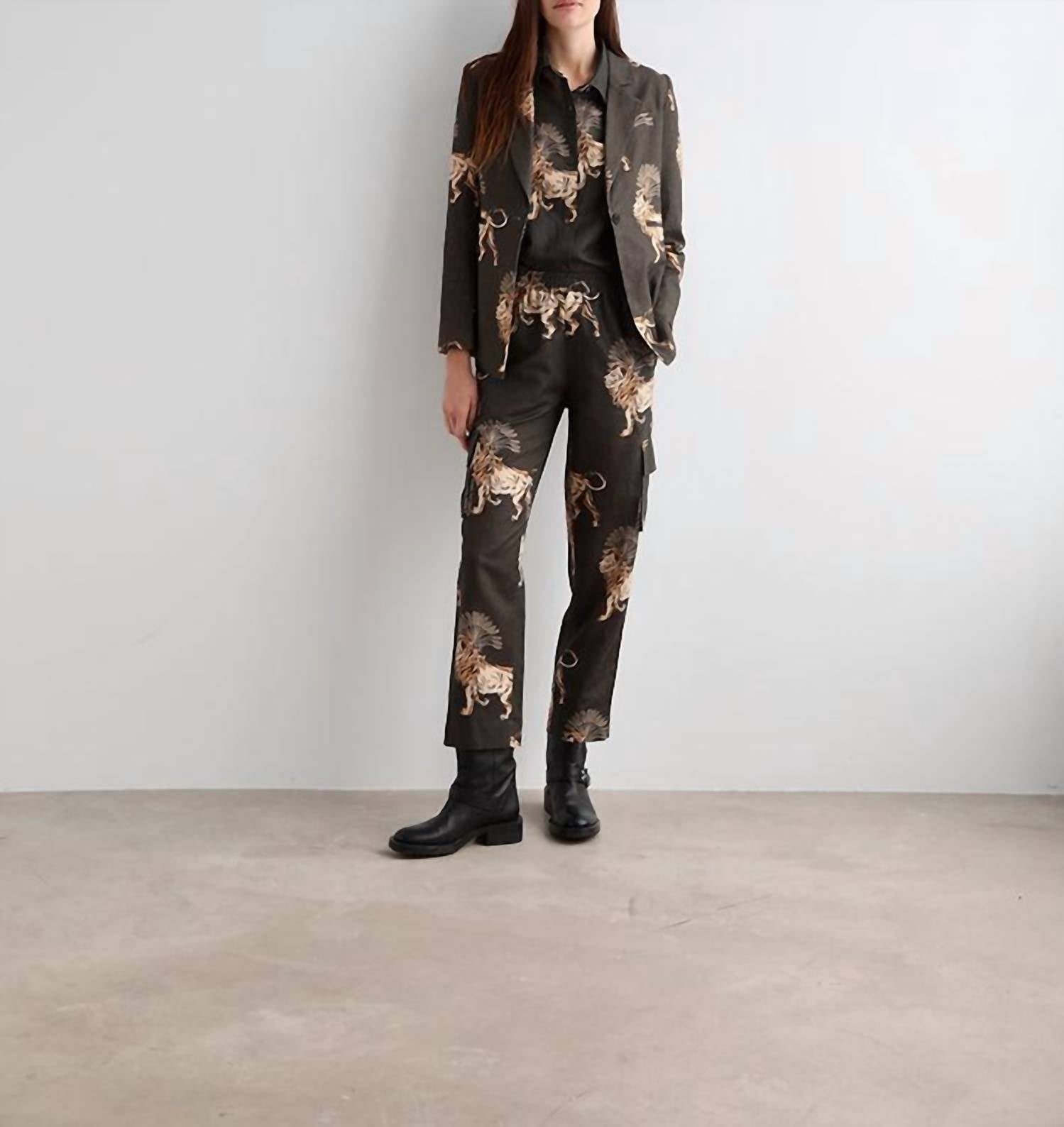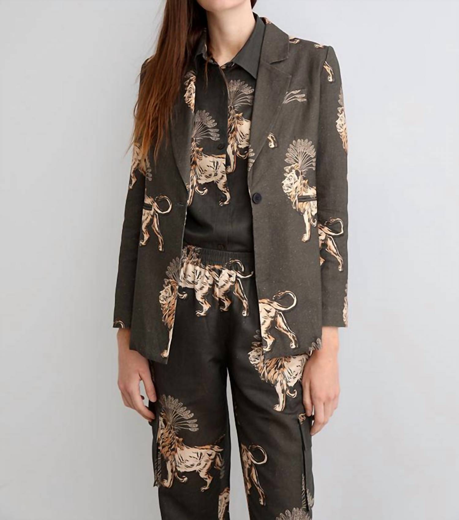 An elevated version of your favorite classic blazer. Elevate your dinner party look with the Lion Palms Blazer by Las Sureñas, designed for the maximalist in mind. This grey, long-sleeve blazer is crafted from a mid-weight linen blend, featuring a striking lion print and lightly padded shoulders for added structure. With a collared neck, notched lapels, and a single-button closure, it combines style with functionality through its welt front and breast pockets. Composition: 55% Linen, 45% Cotton, and lined for comfort. Care: Machine wash cold.