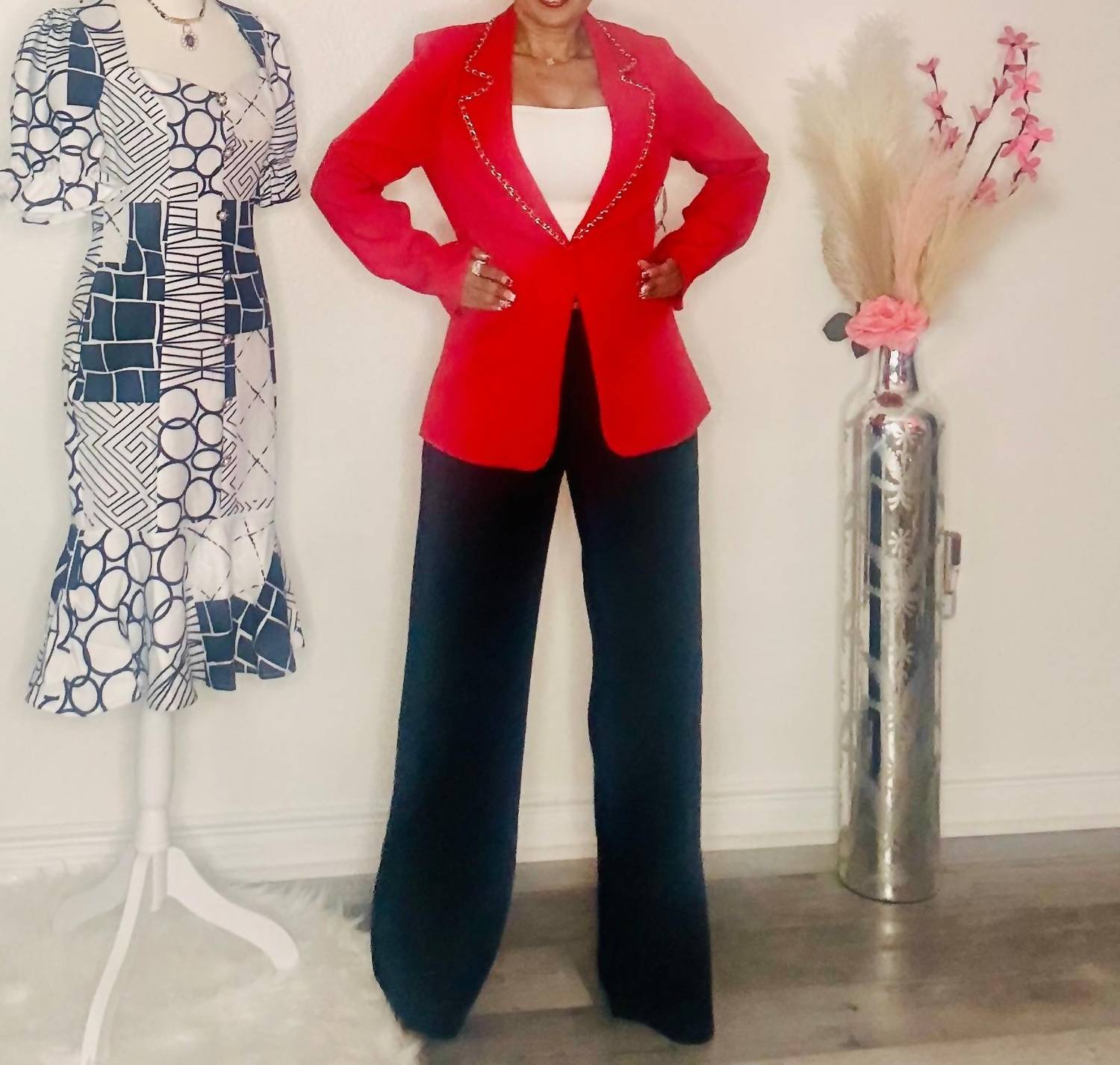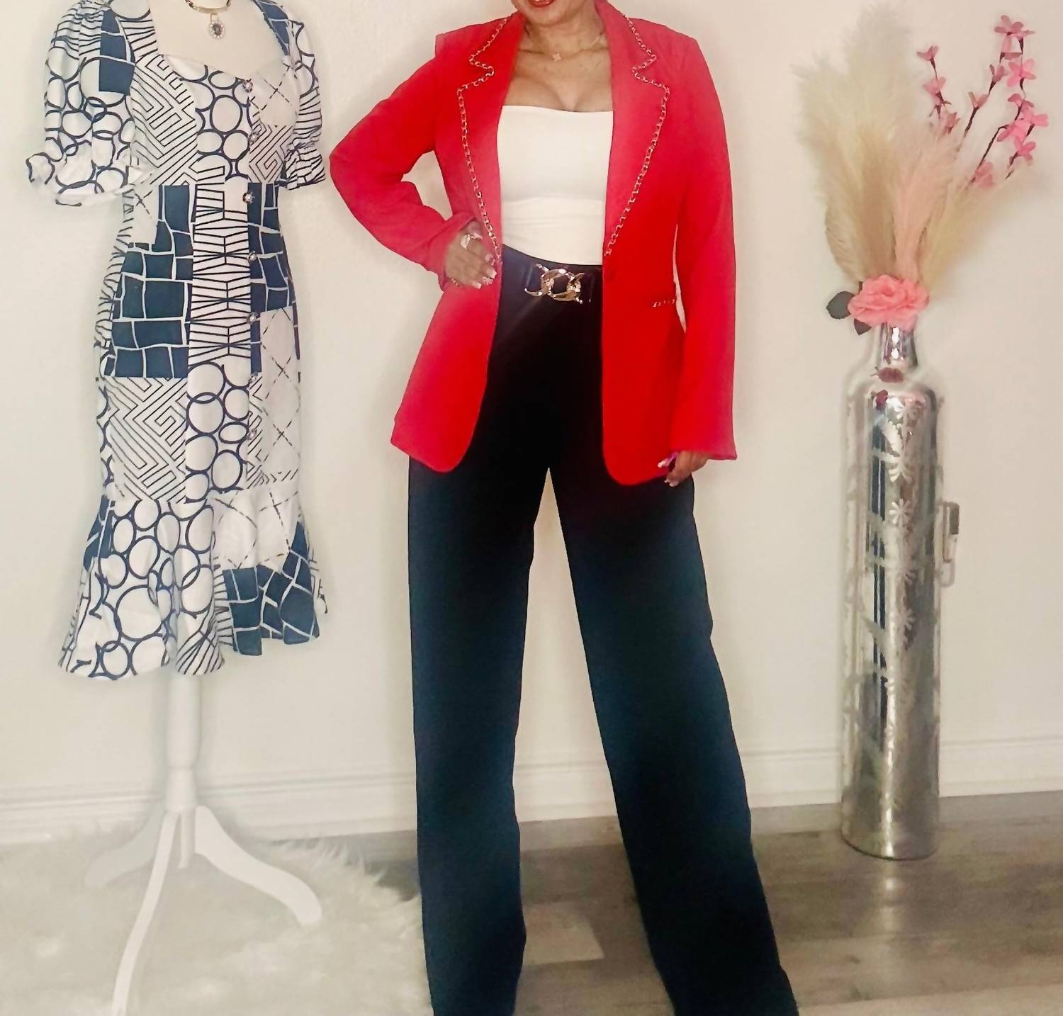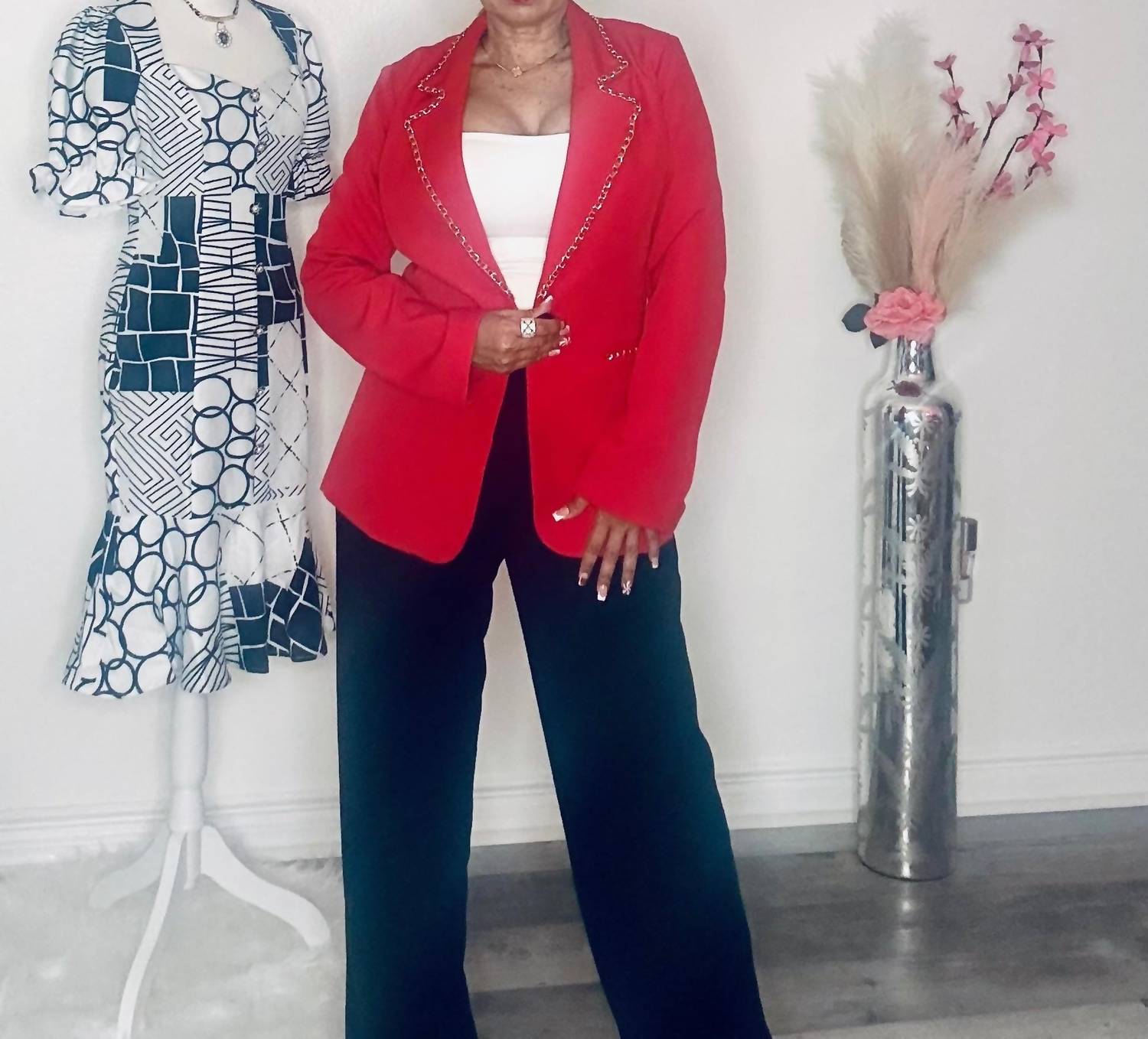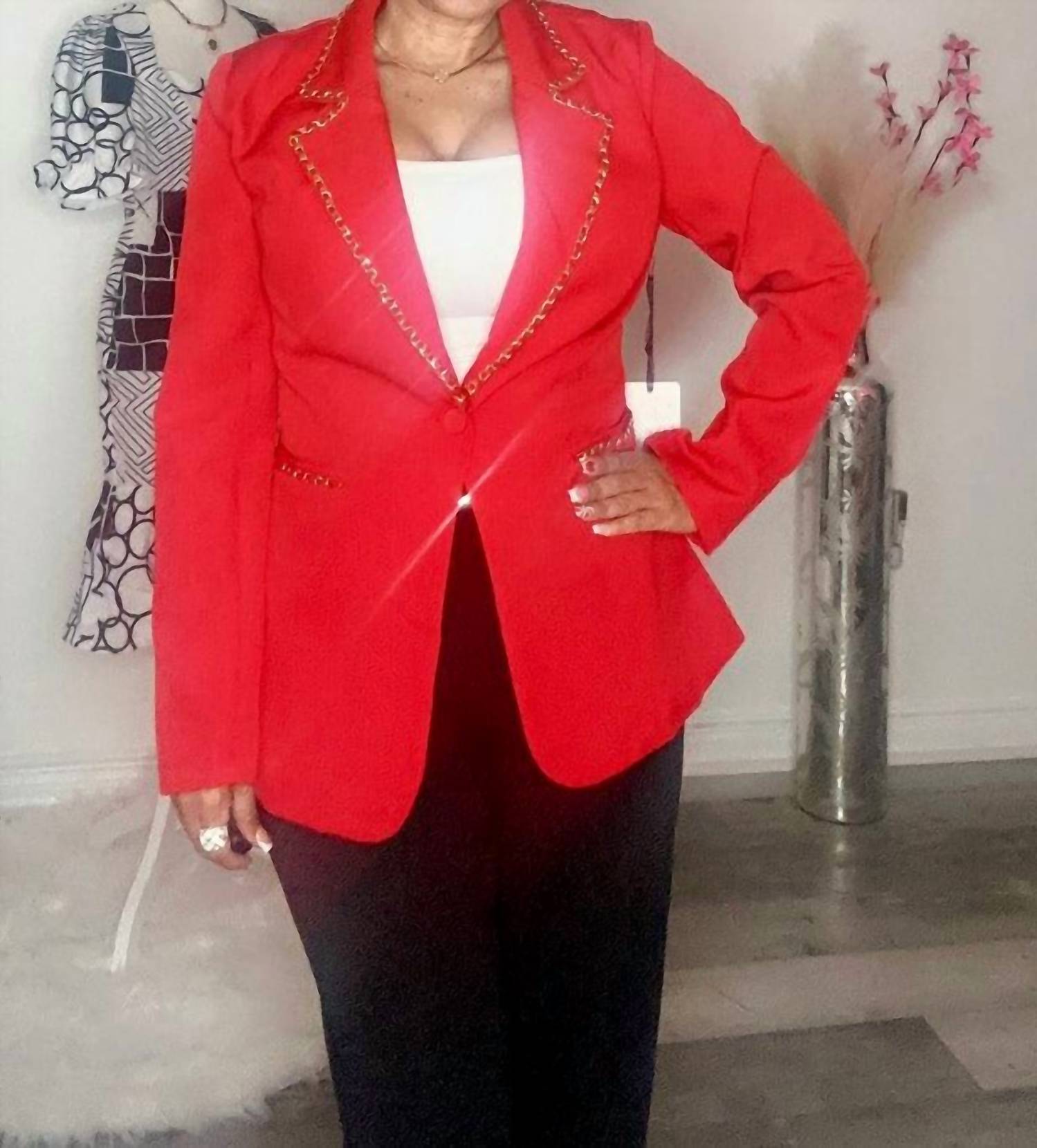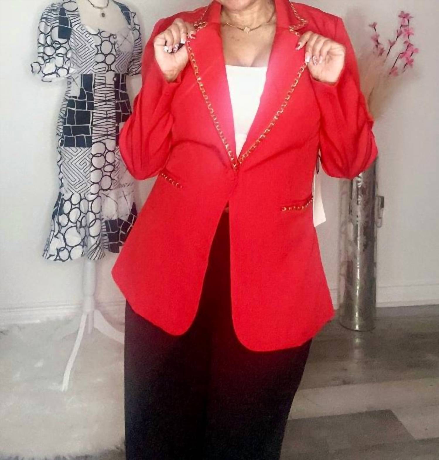 An elevated version of your favorite classic blazer. Elevate your winter wardrobe with the Chain Detail Blazer by milk & honey, a striking piece in vibrant red. This blazer features long sleeves and is crafted from a blend of 96% Polyester and 4% Spandex, offering both comfort and elegance. Designed with a solid pattern, it includes convenient pockets and a classic button closure. Ideal for sophisticated layering, this piece is suited for women seeking stylish warmth during the season.