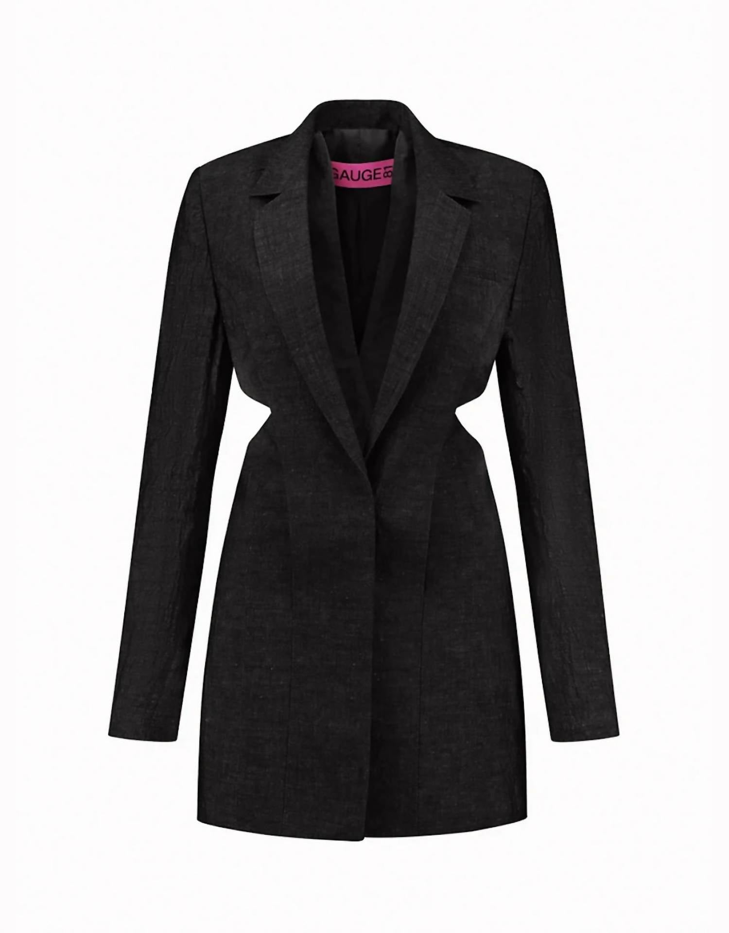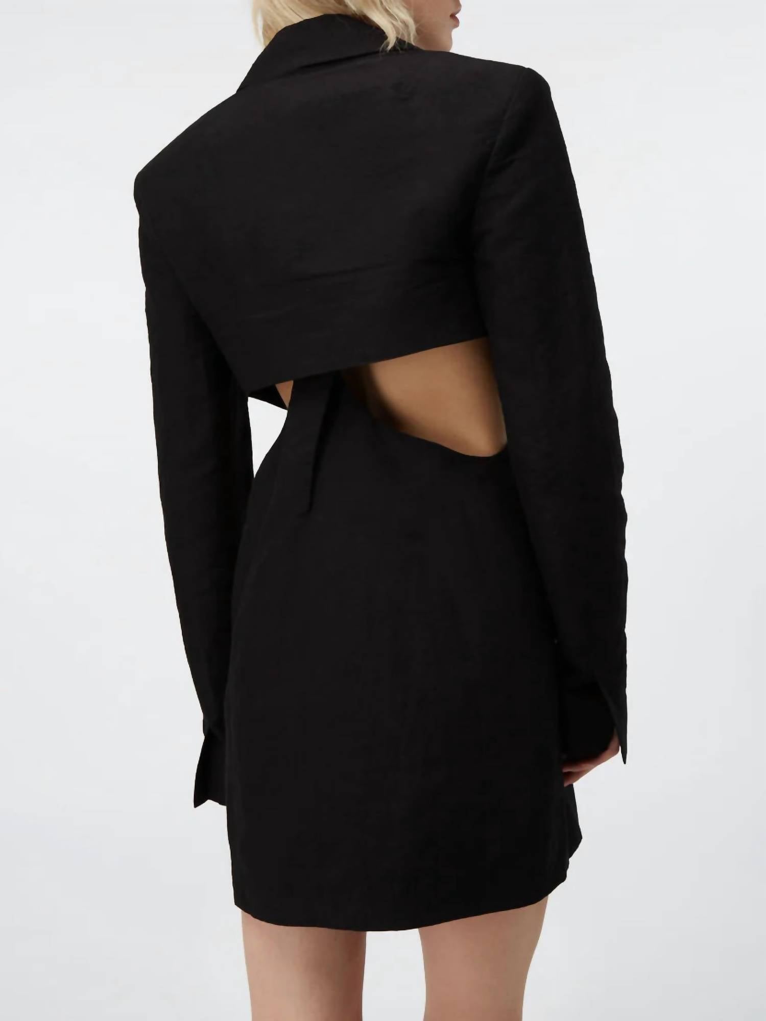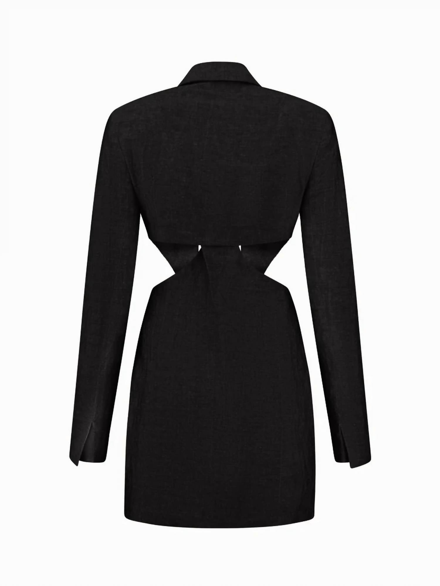 This blazer dress features notched lapels and a single-breasted button placket for a tailored look. It has padded shoulders and a unique cutout waist with a crisscross back design. The long sleeves are accented with split cuffs. The dress is made from a blend of 71% linen and 29% cotton, with a lining composed of 60% acetate and 40% cupro. The length is 31.5 inches (size 36), and the model, who is 5'8", is wearing a size 36. Dry clean only.