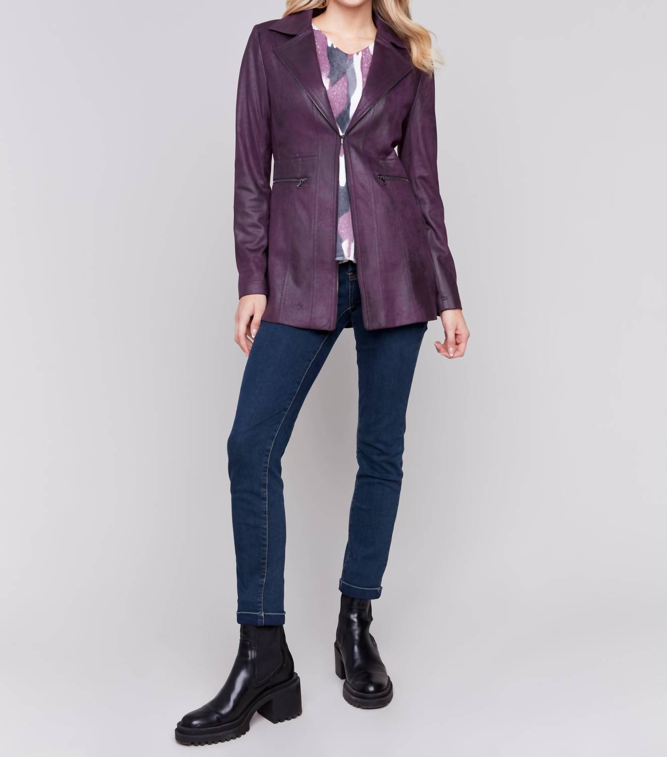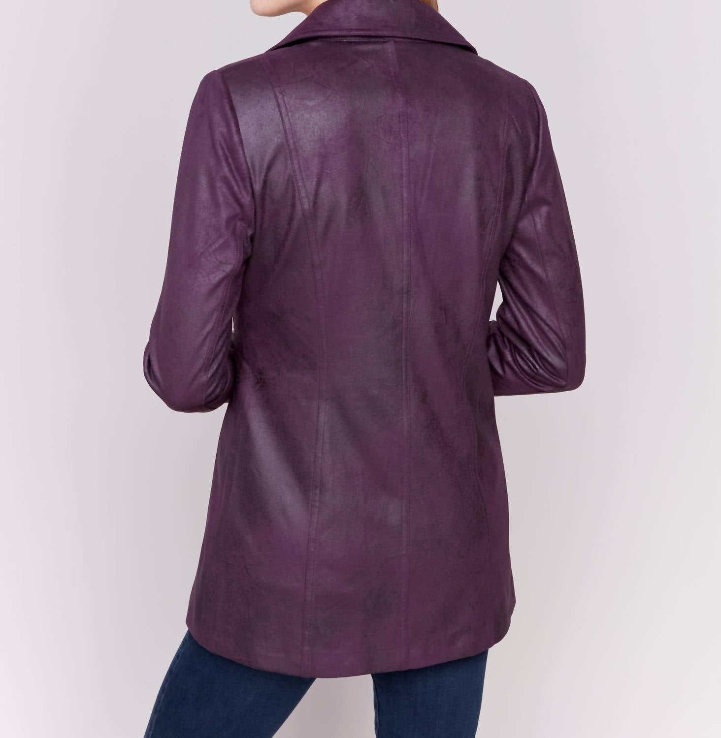 An elevated version of your favorite classic blazer. Discover the Long Faux Suede Moto Jacket by CHARLIE B, a stylish addition to any wardrobe in a striking plum hue. This long jacket, crafted from 92% Polyester and 8% Spandex, boasts a vintage texture with distinctive zipper details and pockets. Closure is secure with a zip, and it measures 30" in length at the back. Designed for easy care, simply hand wash in cold water, avoid bleach, hang to dry, and do not iron; dry cleaning is optional when needed.
