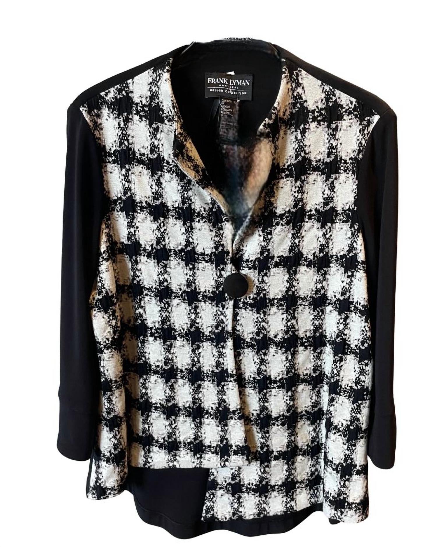Introducing the Checkered Button Front Jacket by Frank Lyman, a chic blend of modern style and classic pattern. This women's jacket flaunts long sleeves and a striking checkered pattern on the front panel, contrasted by solid black sleeves and back. With its textured fabric, this piece offers a structured yet slightly relaxed fit, perfect for both casual and semi-formal occasions. Single large button. Hand wash and line dry.