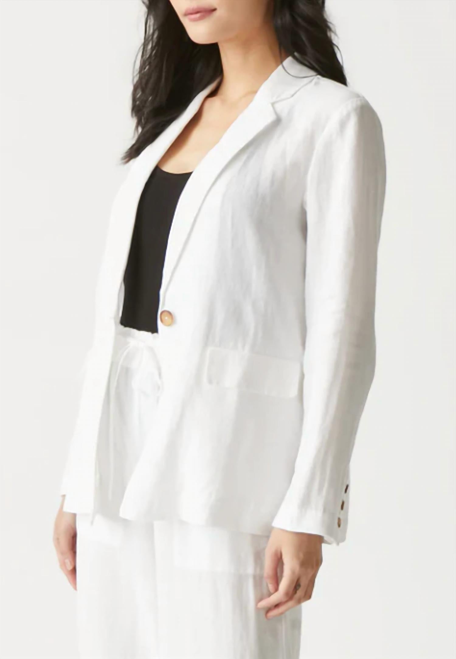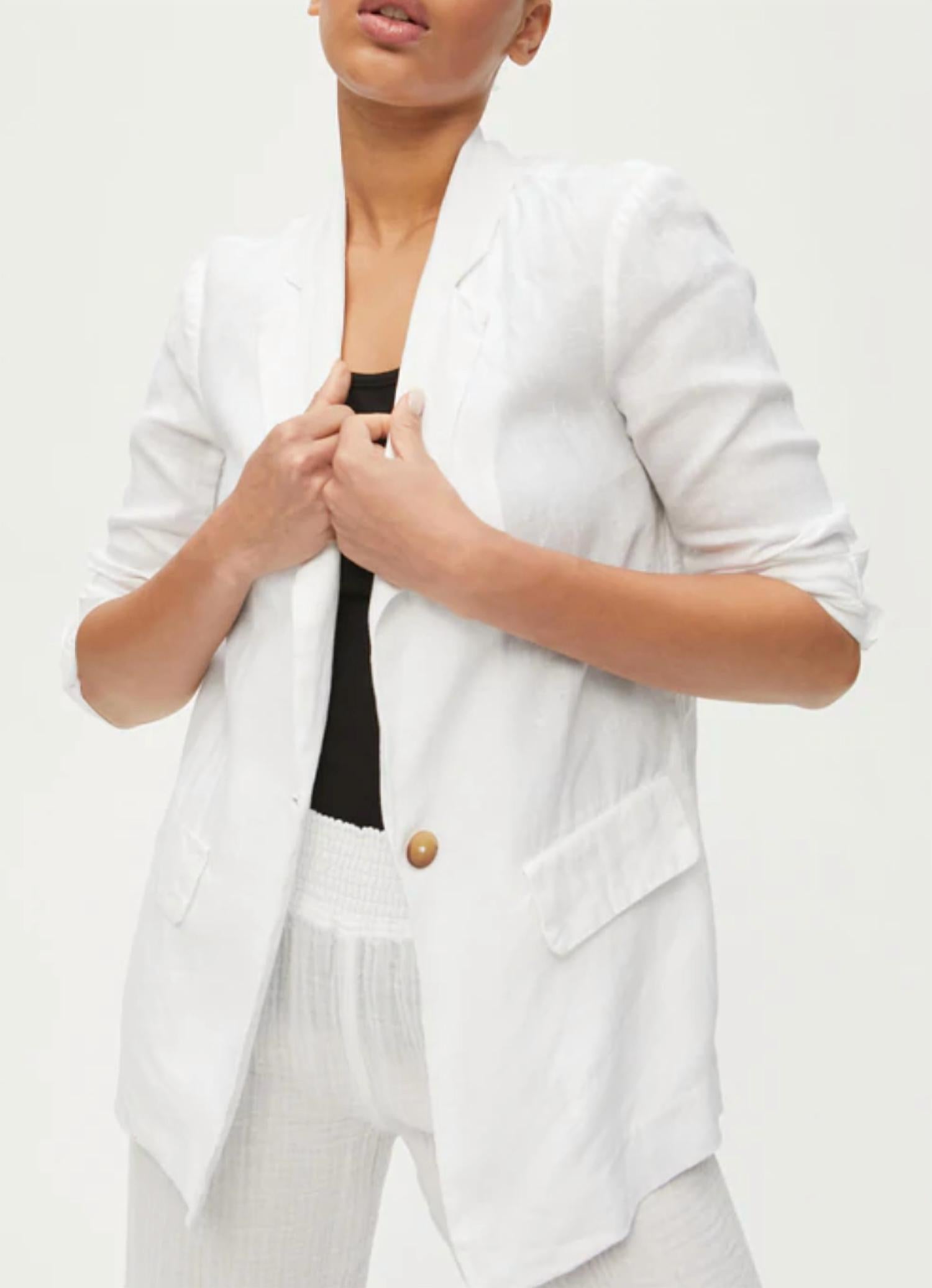 A blazer so versatile you can wear it to the office or pair it with jeans for a more casual look. Elevate your spring wardrobe with the Lottie Linen Long Fit Blazer by Michael Stars, a menswear-inspired piece in crisp white. Crafted entirely from linen, this blazer features long sleeves and a classic long fit with practical front pockets. The button closure adds a sophisticated touch, making it a versatile addition to any outfit from denim to dresses. Ideal for travel and workwear, this blazer is machine washable for easy care.