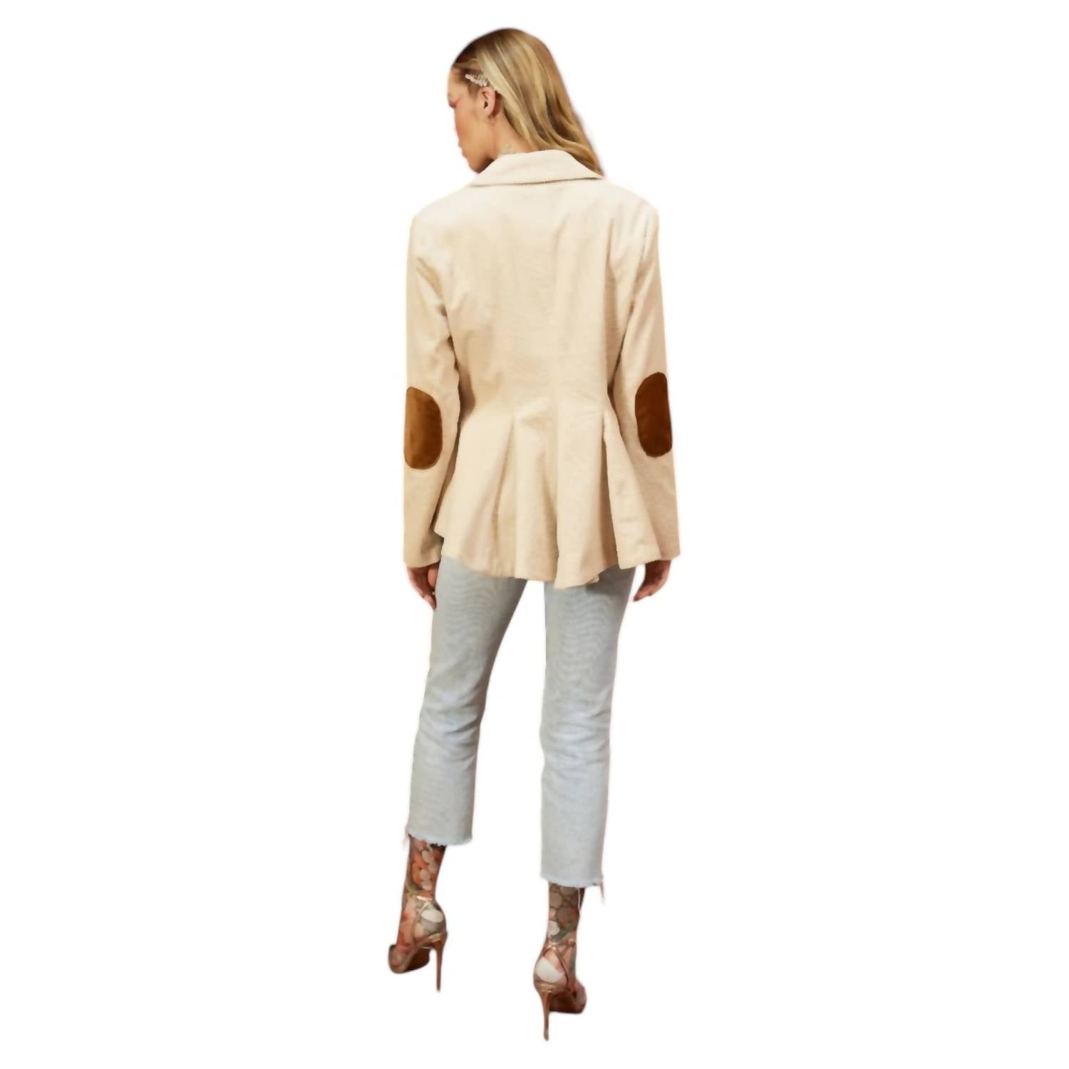 A blazer so versatile you can wear it to the office or pair it with jeans for a more casual look. Elevate your wardrobe with the Carol Corduroy Blazer by Aratta, a chic cream-colored piece that exudes sophistication. This long sleeve blazer is crafted from 100% cotton, featuring a button closure and a stunning leopard-print satin lining for a luxurious touch. Designed with two front flap pockets and enhanced by velvet elbow patches and a removable crystal brooch, it ensures both style and practicality. The asymmetric hem adds a unique twist to this solid-patterned blazer, making it a standout addition to any collection.