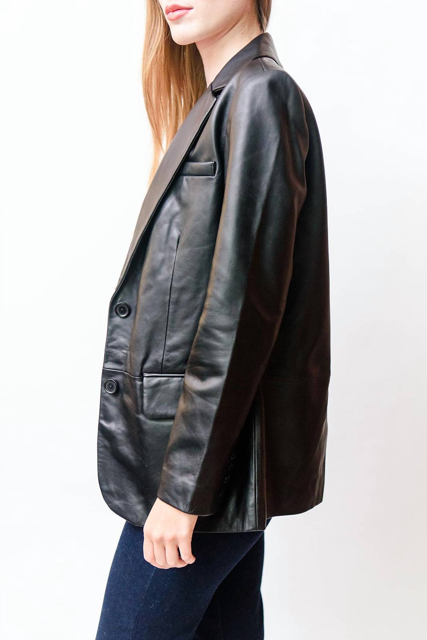 Elevate your wardrobe with the Keeley Leather Blazer by Walter Baker, a perfect blend of sophistication and ease. This black blazer features long sleeves and a classic notched collar, embodying timeless elegance. Crafted from 100% genuine leather, it offers a longline relaxed fit with a single-breasted two-button closure and flap pockets for convenience. Fully lined for comfort, this piece should be dry cleaned to maintain its quality. Model is 5'9" and wears size XS, which fits true to size with a slightly relaxed fit.