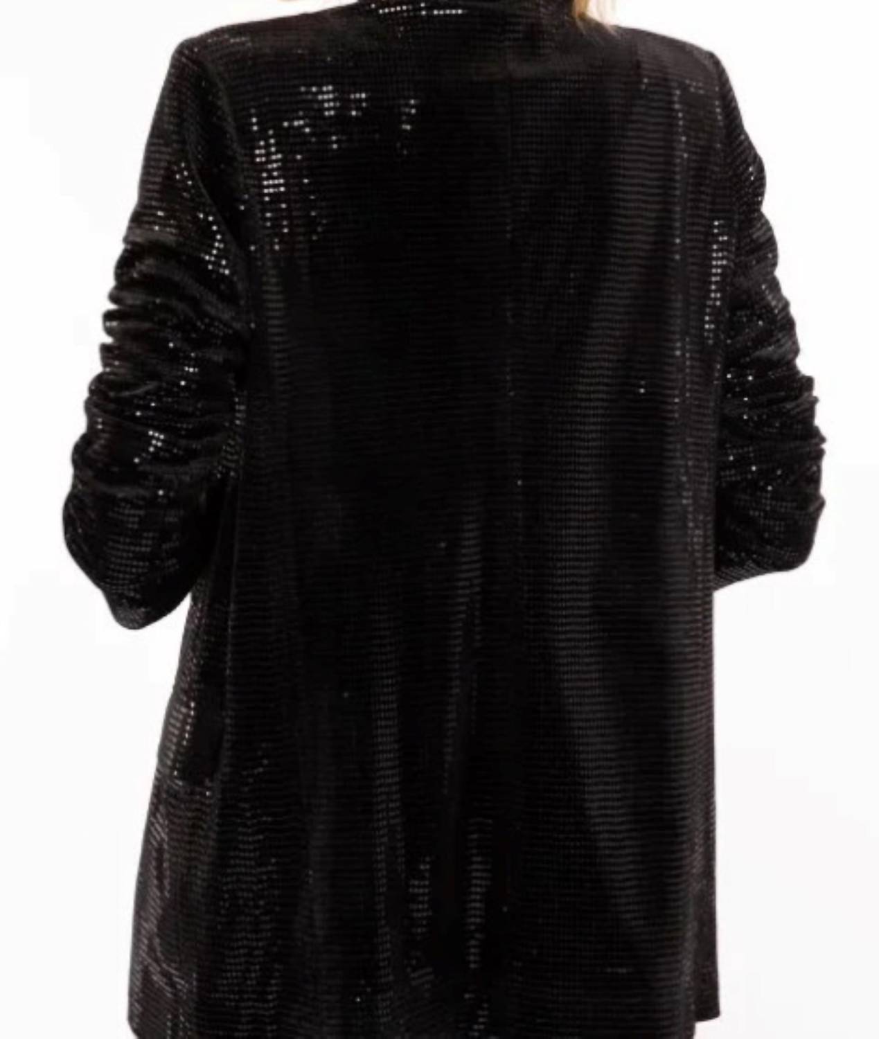 3/4 Sleeves. Sequin Blazer. Collared V-neckline. True To Size. 95% Polyester, 5% Spandex.