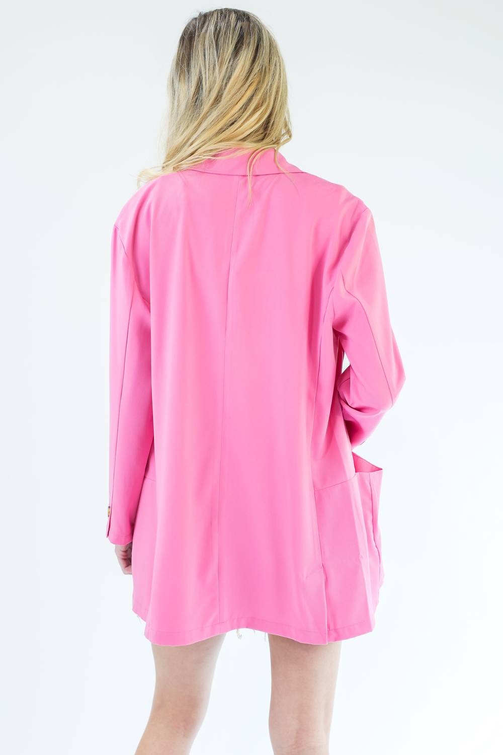 This blazer features lightweight satin material, a collared neckline, long loose sleeves, low side pockets, and a relaxed open front silhouette. 95% Polyester, 5% Spandex. Model is a US size Small. Height: 5'11". Bust: 31". Waist: 26". Hips: 37".