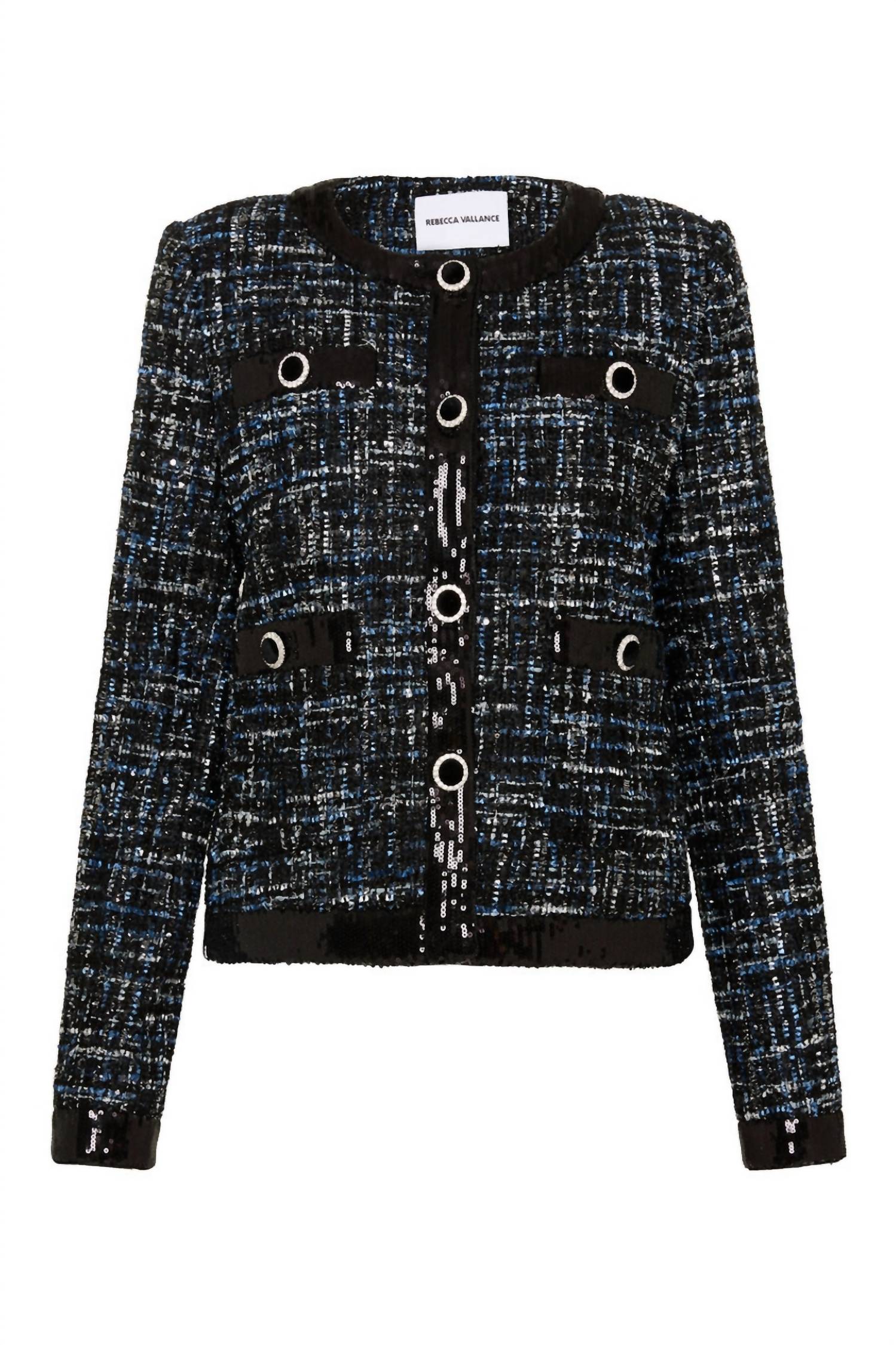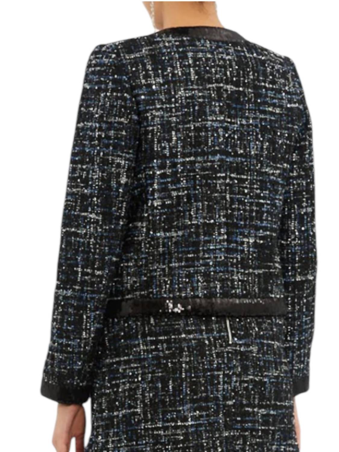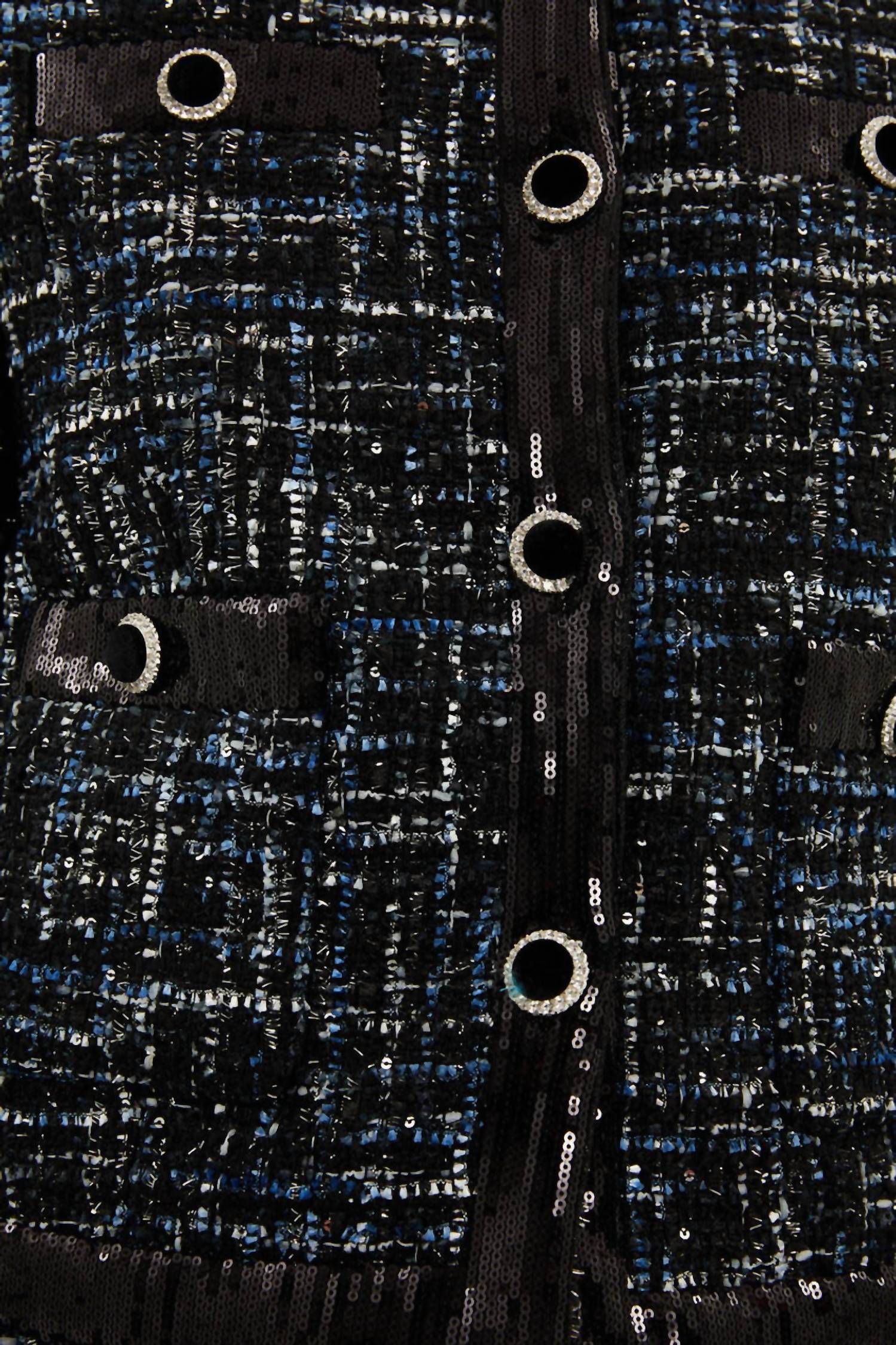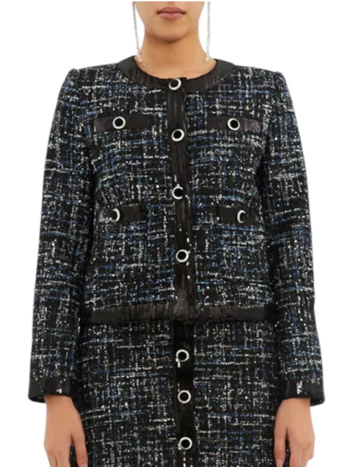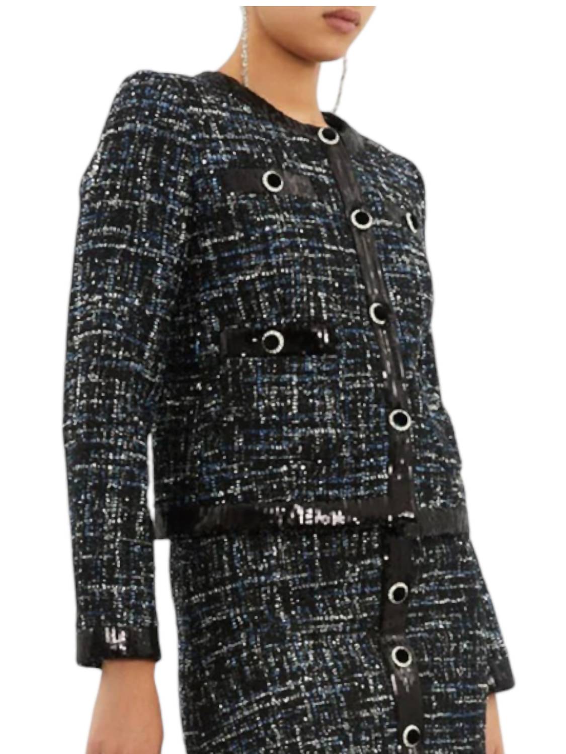 Heavy-weight bonded boucle and sequin fabrication. Boxy silhouette. Front pocket with velvet-covered diamante buttons at the center front. Lined. Fits true to size. 100% Polyester.