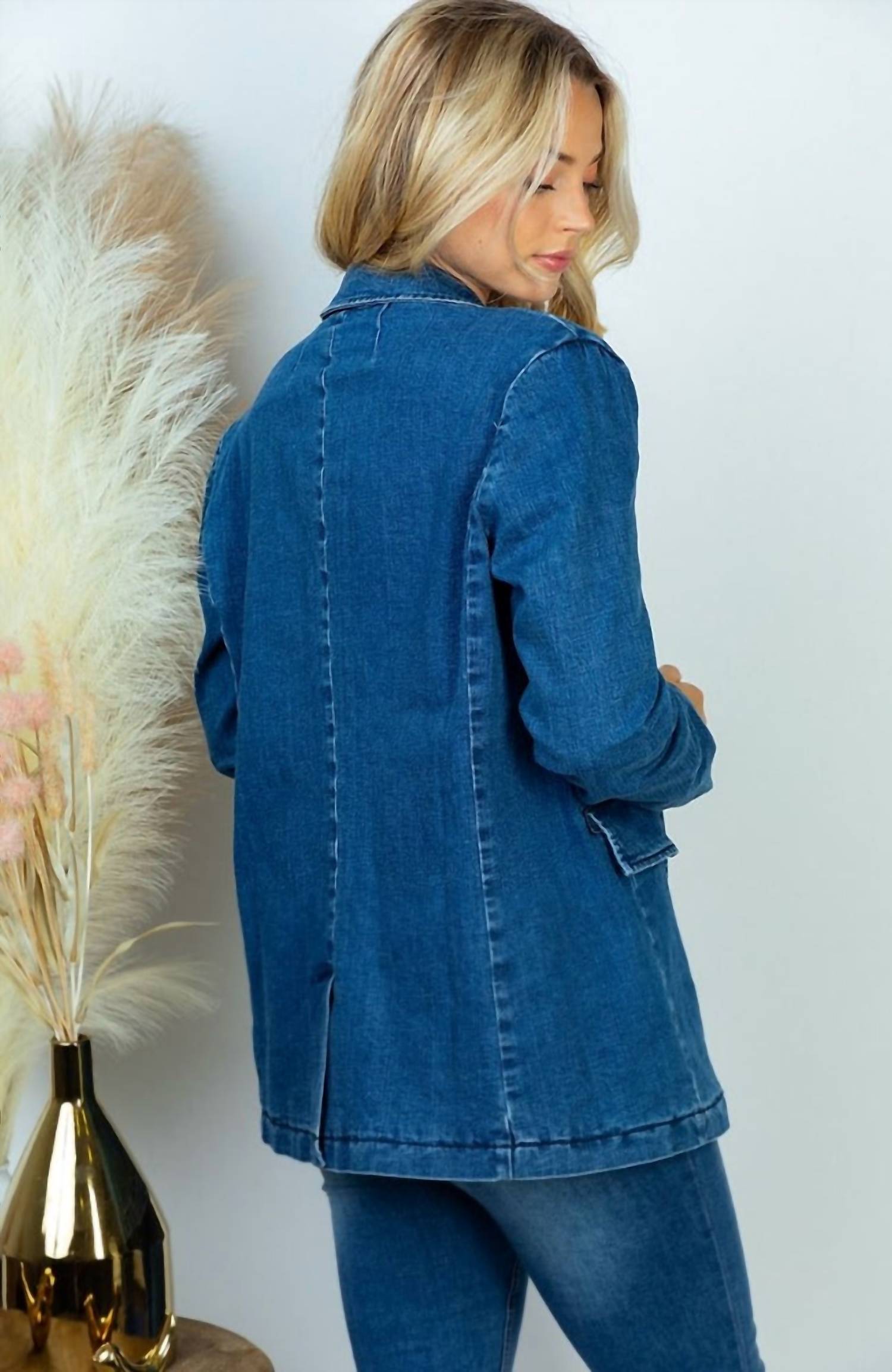 Tailored to perfection, this blazer will be your go-to jacket for years to come. Embrace the 90s fashion trend with the White Birch Denim Blazer, a staple piece for your Fall wardrobe. This solid blue blazer features long sleeves and a classic collared neckline, crafted from medium-weight denim for a structured look. With functional buttons and side pockets, it offers both style and practicality, perfect for travel or a festive New Year's Eve gathering. Made from 100% cotton, this blazer is imported and combines timeless style with a modern twist.