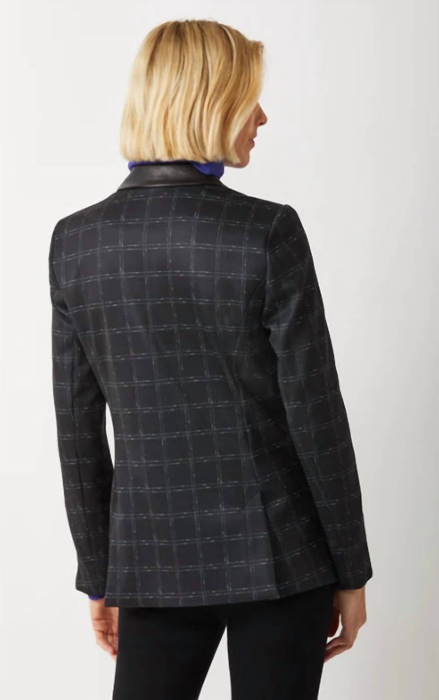 Tailored to perfection, this blazer will be your go-to jacket for years to come. Elevate your wardrobe with the Women's Blazer by Ecru in a sophisticated Black Windowpane pattern. This long sleeve blazer features Park Avenue Stretch fabric, accented with luxurious soft lamb leather at the collar, pockets, and zipper closure cuffs. Crafted from 67% Rayon, 28% Nylon, and 5% Spandex with 100% Leather piping, it's designed with single button front closure for a sleek silhouette. Tailored to perfection with princess seaming and double vents, this blazer is both office-appropriate and effortlessly chic with jeans. Care: Dry clean only.