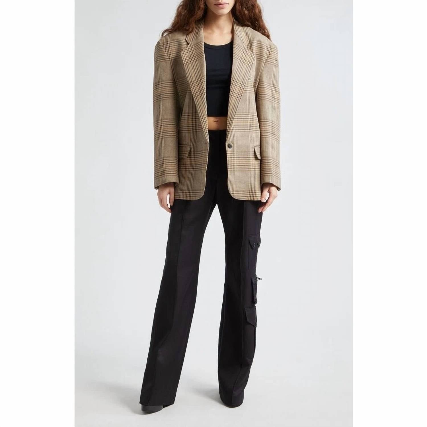 Tailored to perfection, this blazer will be your go-to jacket for years to come. Introducing the Massive One Button Blazer by Smythe, an iconic addition to your wardrobe in a chic brown plaid pattern. This women's blazer showcases long sleeves, a relaxed oversized silhouette with a strong shoulder, and a distinguished dropped notched collar. Crafted with a blend of 56% cotton and 44% linen and lined with 100% Cupro Rayon, this piece is made in Canada. Closure: Button closure. Care: Dry clean only. Model is 5'11" and is wearing a size Extra Small.
