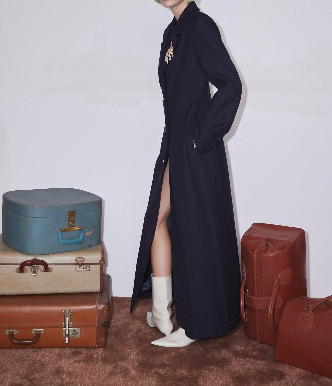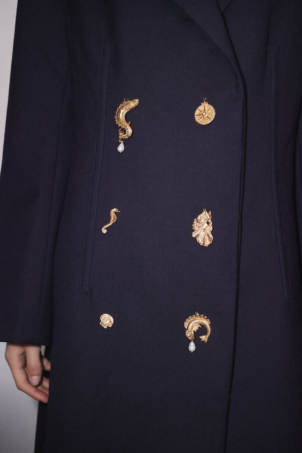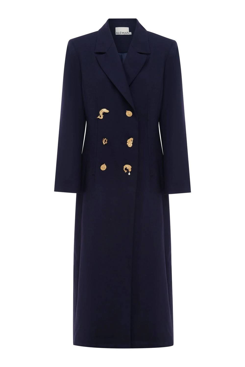The Solaris Double-breasted Coat by ALEMAIS, in a sophisticated ink color, offers a fashion-forward take on evening wear with its long sleeves and full-length silhouette. Crafted entirely from 100% Wool, it features bespoke buttons, padded shoulders, and a notched collar for enhanced elegance. The bespoke button closure ensures a sleek finish, and this coat is fully lined for extra comfort. Care instructions recommend a dry clean approach, ideally at an eco-friendly facility, to preserve the garment's quality and reduce environmental impact.