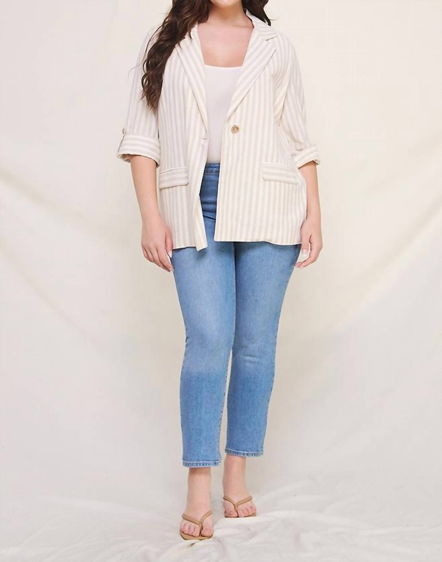 An elevated version of your favorite classic blazer. Meet the Allie Rose Striped 3/4 Roll Tab Sleeve Jacket, a chic addition to your workwear collection. Featuring elegant three-quarter roll-tab sleeves and a button closure, this jacket is crafted from soft natural linen for comfortable wear. Patterned with timeless stripes, it includes practical pockets and a stylish collared neckline. Made in China, this jacket is easy to maintain with machine wash care instructions.