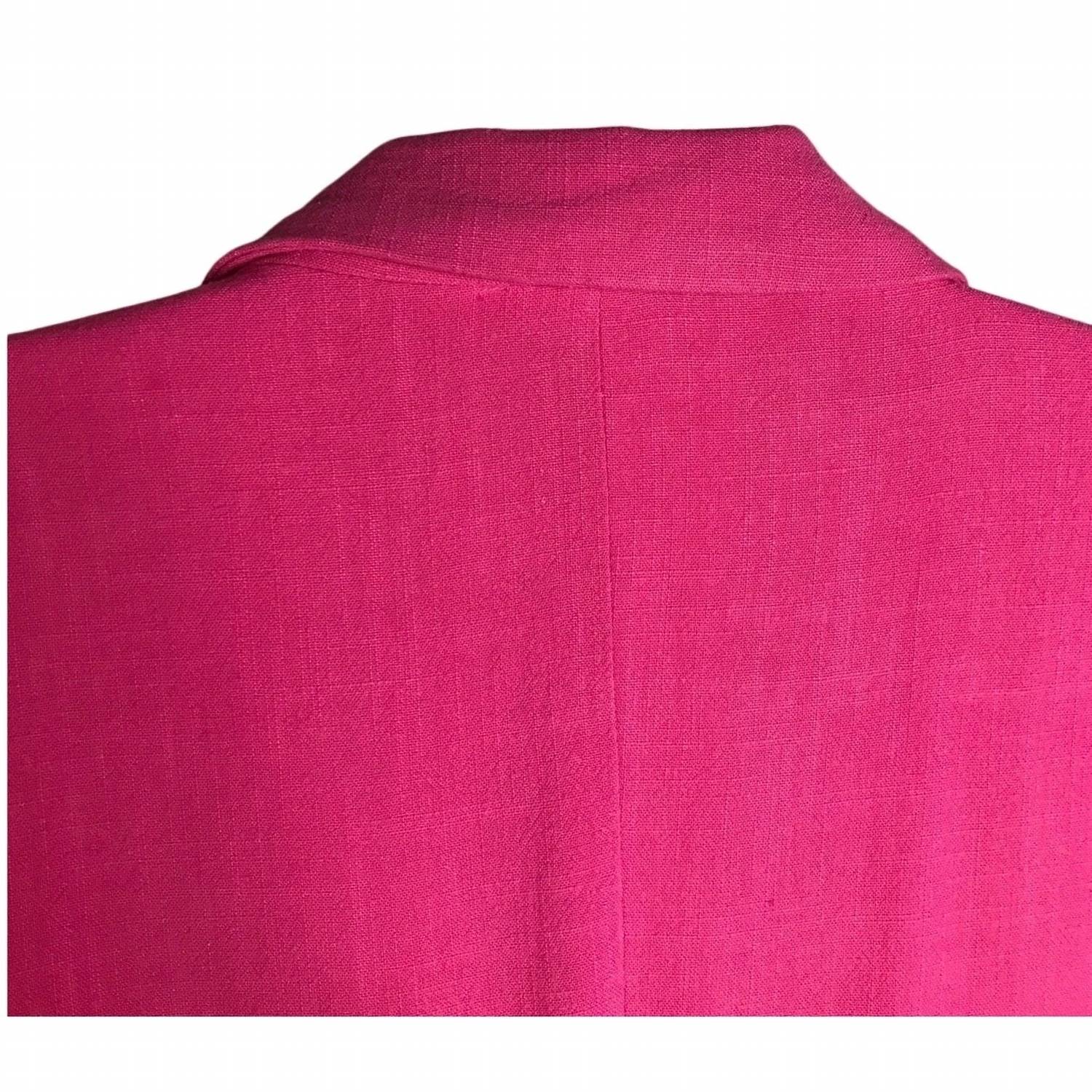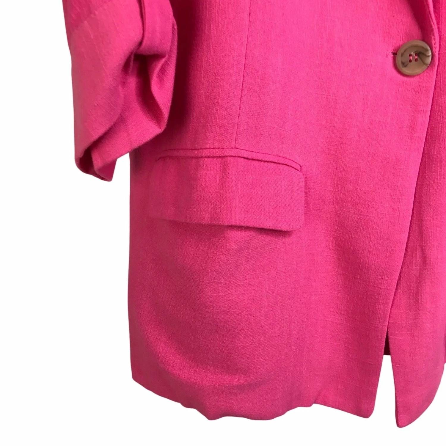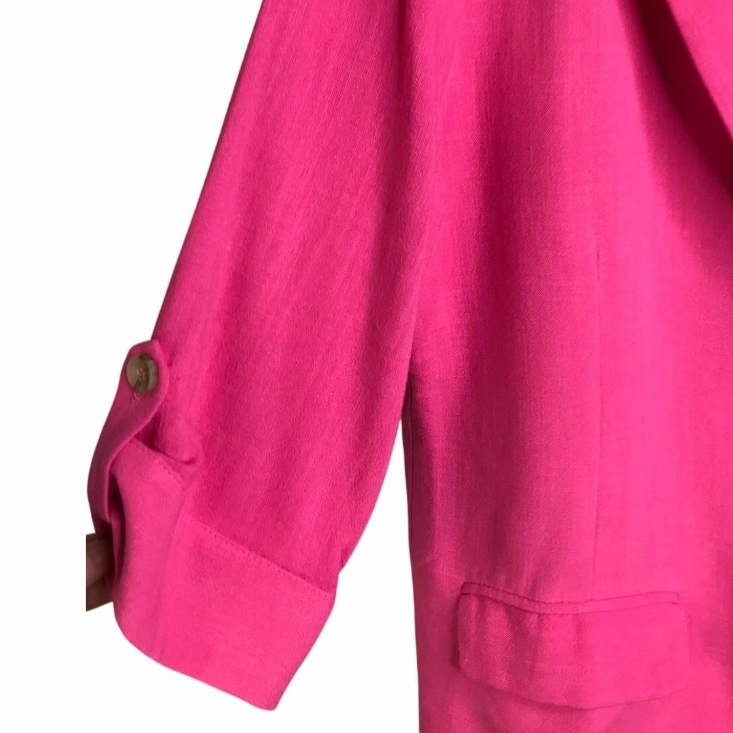 An elevated version of your favorite classic blazer. Introducing the Women's Linen 3/4 Roll-tab Sleeve Jacket by Allie Rose in vibrant Hot Pink, a chic addition to any workwear wardrobe. Crafted with 70% Viscose and 30% Linen, this solid-patterned blazer features convenient roll-tab sleeves and a button closure. Made in China, it is fully lined with 98% Polyester and 2% Spandex for added comfort. Easy to care for, it is machine washable and perfect for spring evening events, complete with pockets and a stylish collar neckline.