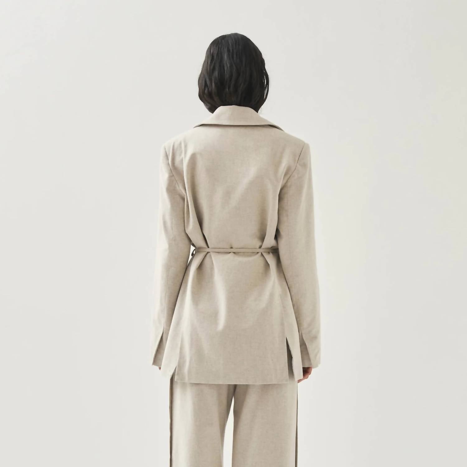 An elevated version of your favorite classic blazer. Introducing the Oversized Belted Blazer by ALOHAS, crafted for the modern woman who appreciates both style and sustainability. This chic piece features long sleeves, and a composition of 60% recycled cotton and 40% cotton, with a 100% polyester lining for added comfort. Made in Spain, it boasts a button closure and self-tie belt to accentuate the waist, and includes functional slash pockets for convenience. Perfect for fall travel and Thanksgiving gatherings, this beige blazer offers a refined vintage vibe.