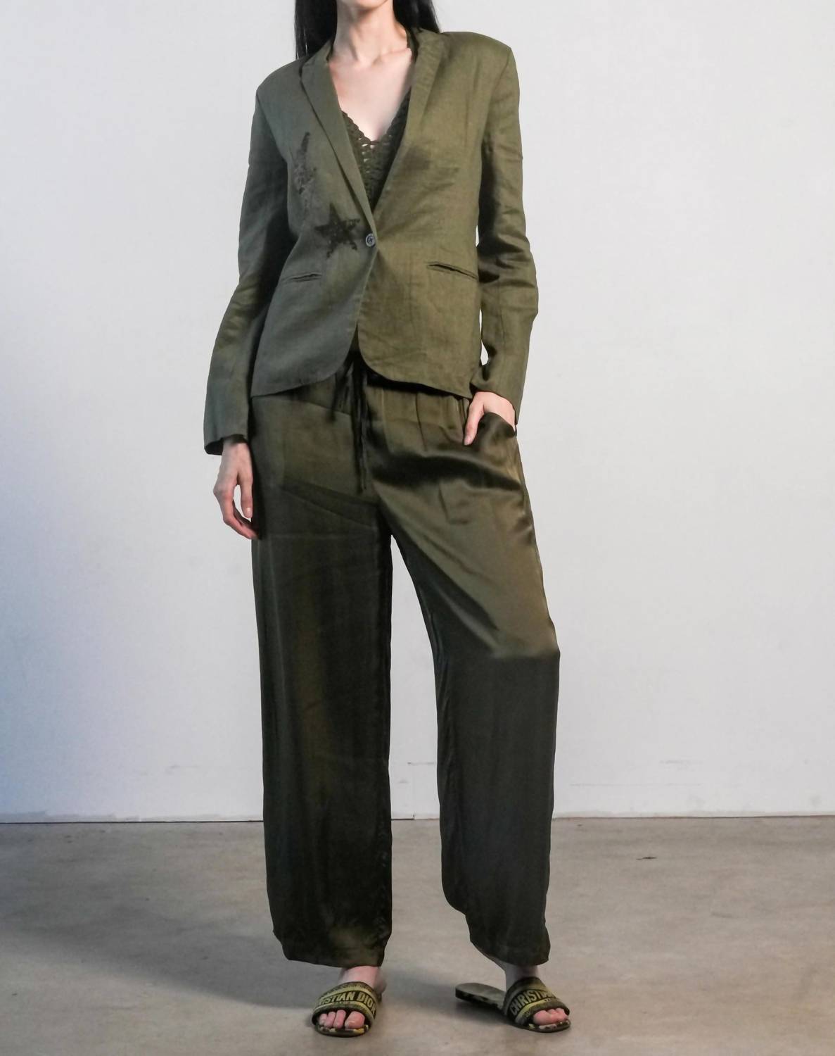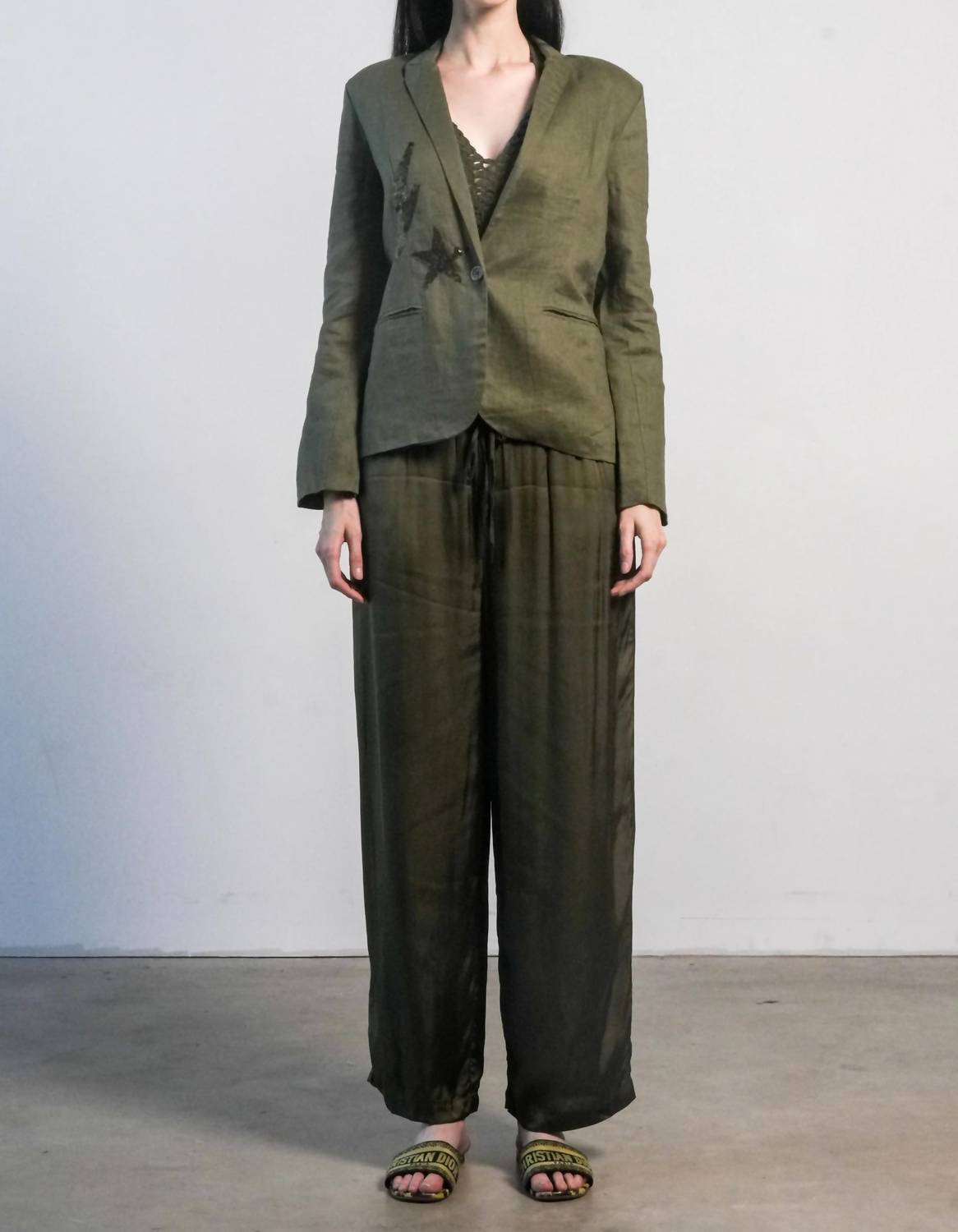 An elevated version of your favorite classic blazer. The Paris Linen Jacket Blazer by Angel Wings by Lucy is a stunning choice for refined, elegant style with unique artistic flair. Crafted from 100% linen, blazer promises a lightweight, breathable feel, ideal for fall occasions. Featuring long sleeves and a button closure, the piece is adorned with hand-beaded STAR and ZIGZAG details on the front and “LOVE” on the back. Designed with a classic collar and pockets, its single-breasted structure ensures a tailored fit to elevate any ensemble effortlessly.