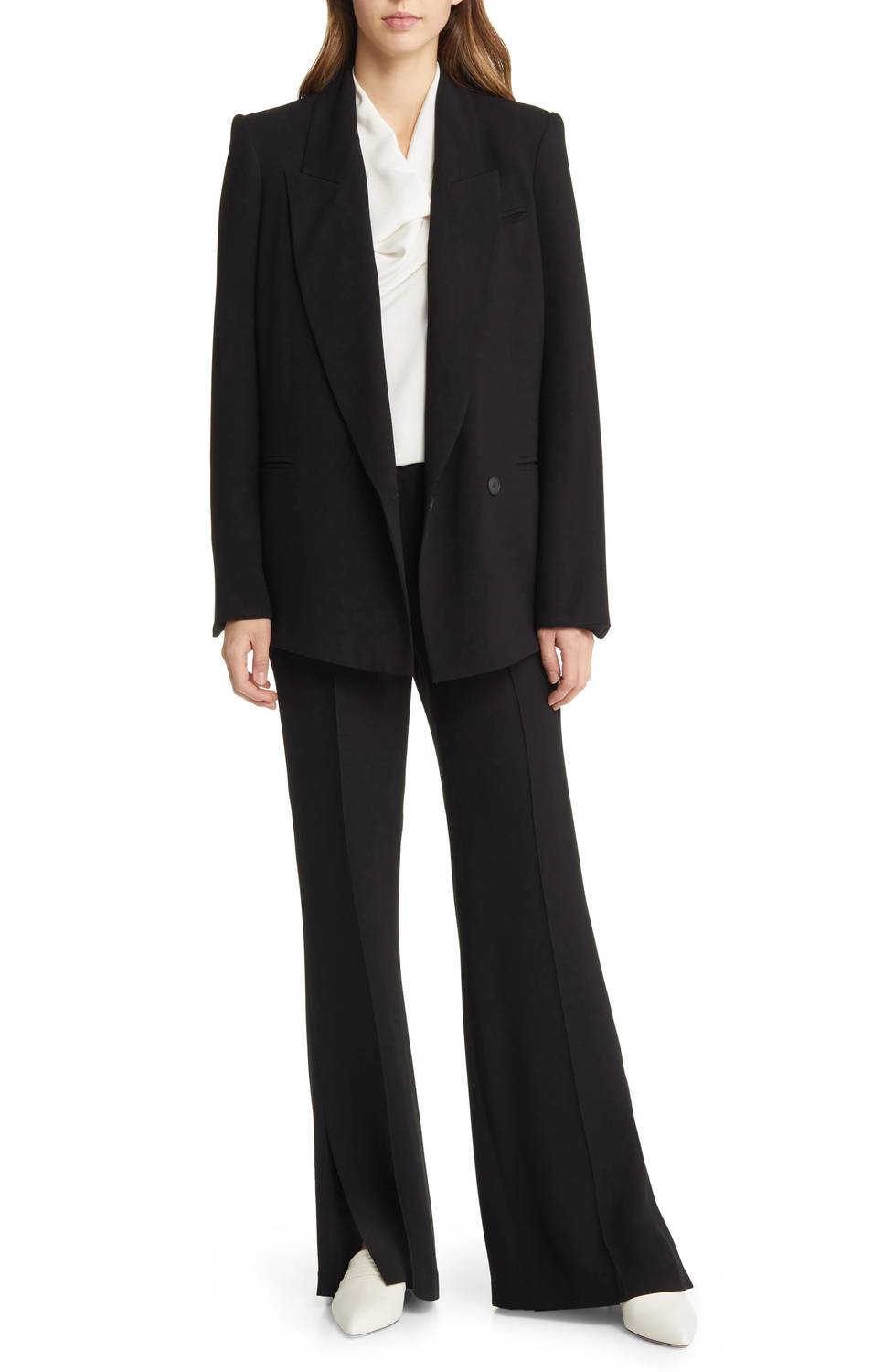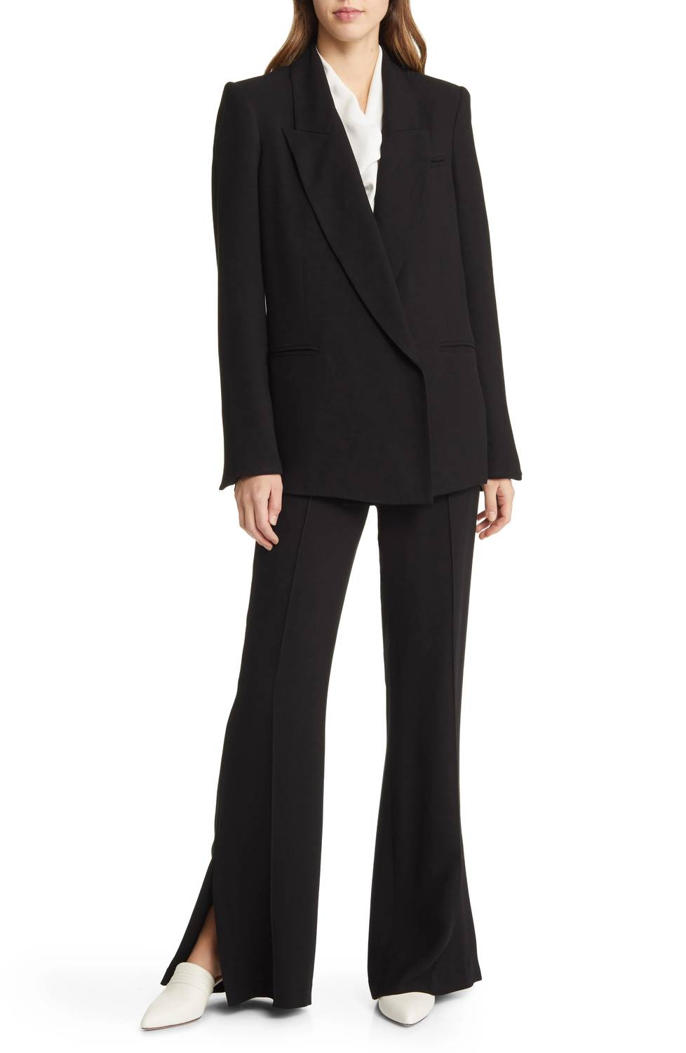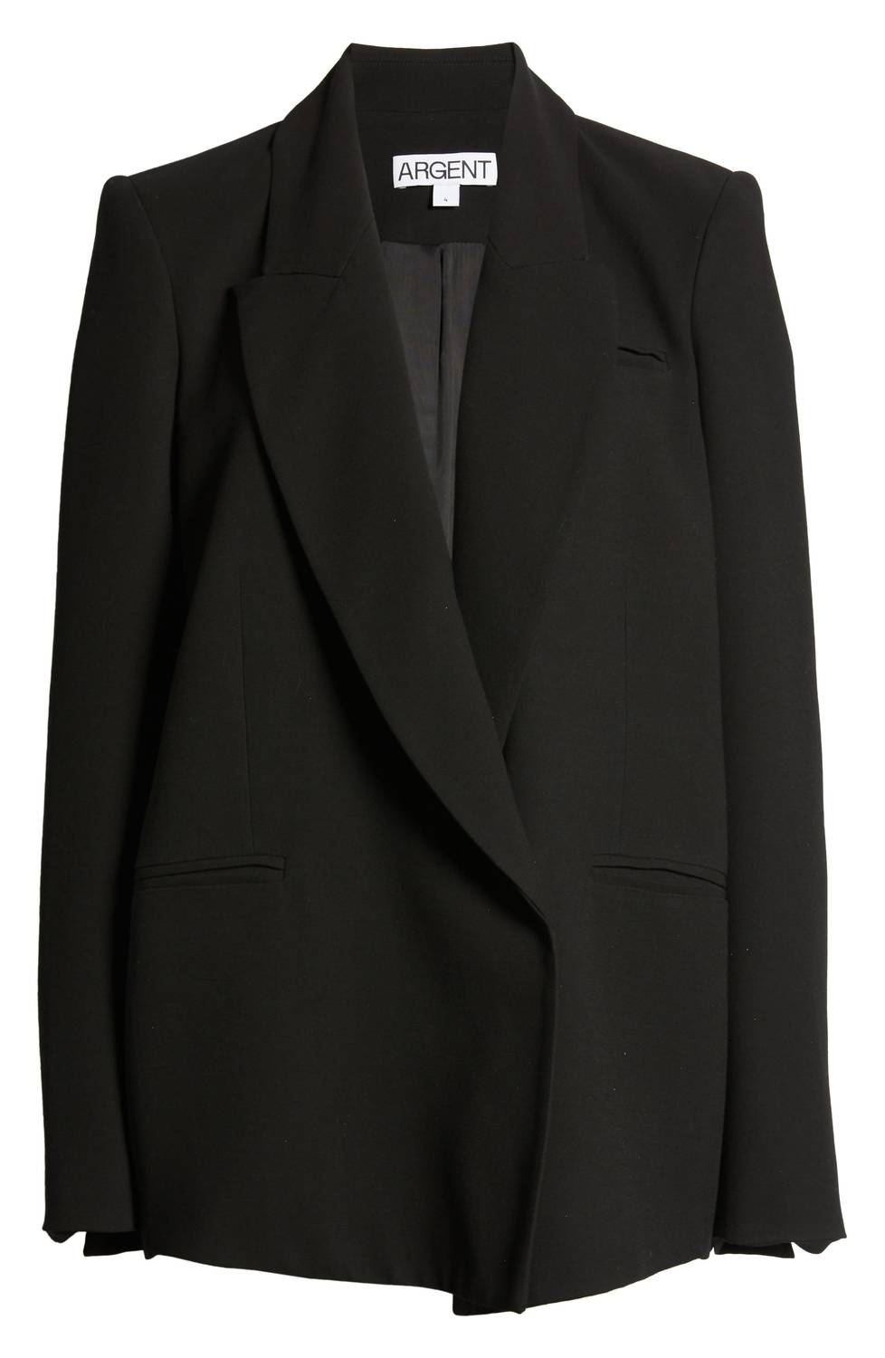 Tailored to perfection, this blazer will be your go-to jacket for years to come. Experience the sleek elegance of the Madison Viscose Wool Crepe Blazer by Argent, crafted for the modern woman. With long sleeves and a 28.5" length, this black blazer features versatile slit sleeves and peaked lapels for a chic touch. Made in China from a sophisticated blend of 88% viscose and 12% wool, it ensures comfort and style for evening events. Closure is achieved with a button, and care requires dry cleaning.
