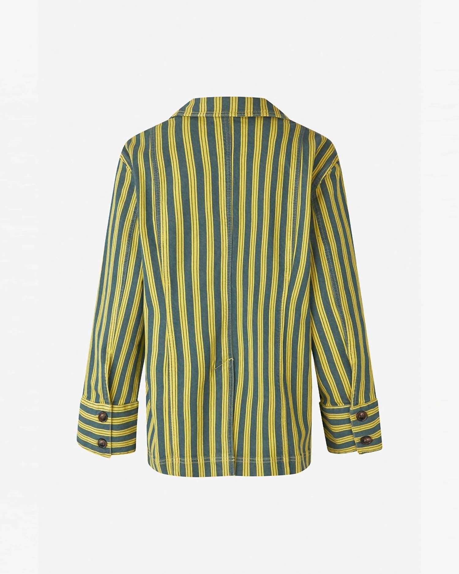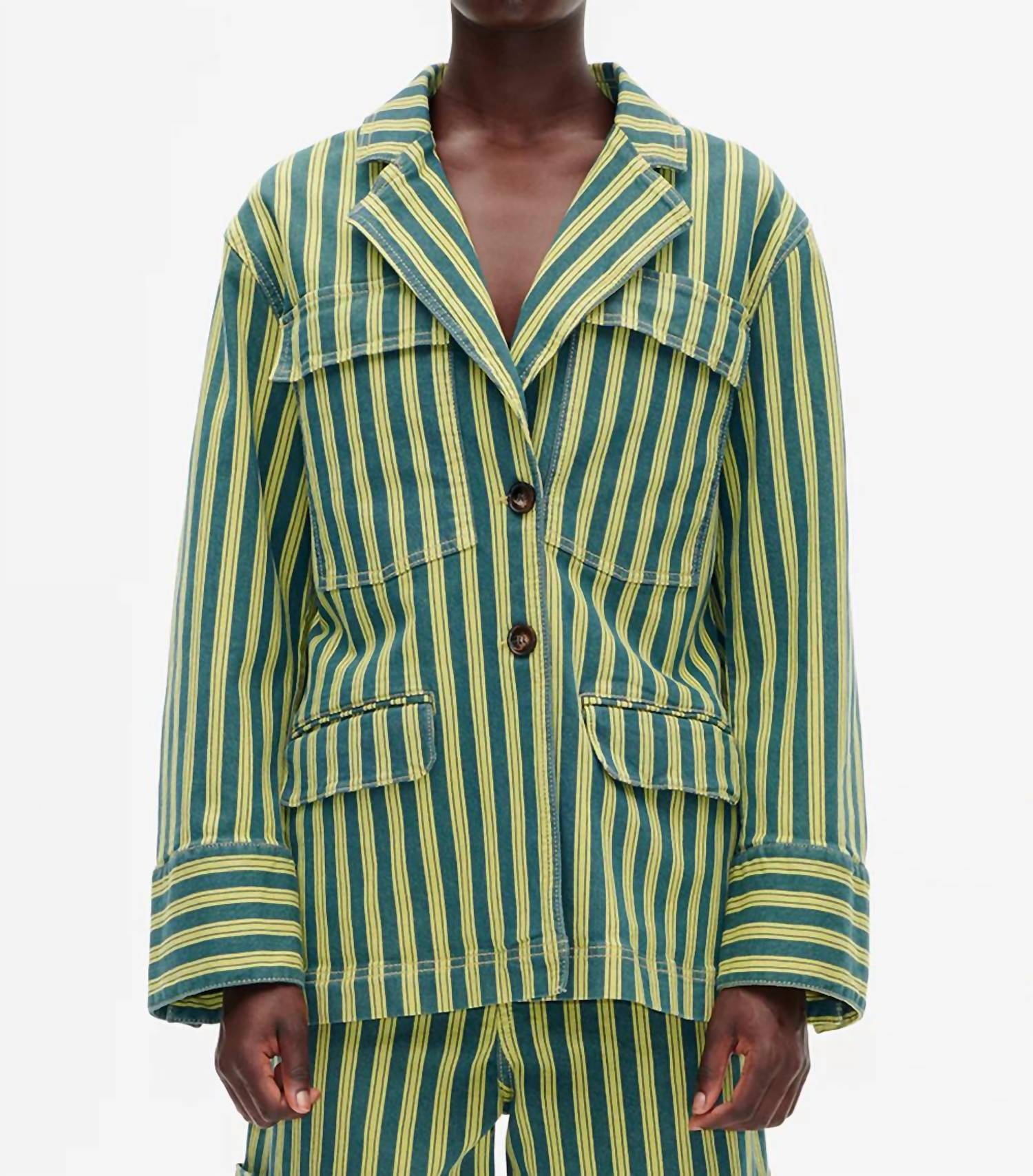 An elevated version of your favorite classic blazer. Elevate your wardrobe with the Bina Jacket by BAUM UND PFERDGARTEN, a must-have for the preppy season. This long-sleeve denim blazer jacket in Snake Eye Stripe offers a relaxed fit and features a collar neckline and button closure. Crafted from a cotton blend of 97% organic cotton and 3% elasthane, this unlined piece is perfect for casual, housewarming occasions. Its stylish stripe pattern, along with functional pockets, underscores its vintage casual look.