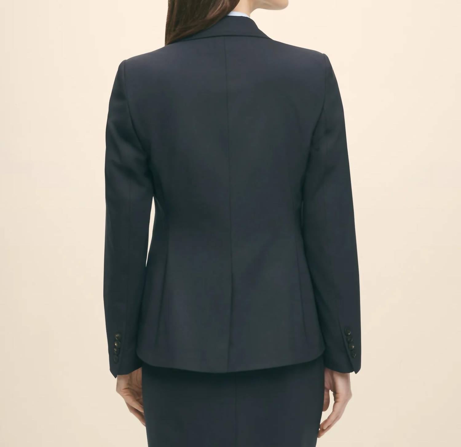 A blazer so versatile you can wear it to the office or pair it with jeans for a more casual look. Introducing the Stretch Wool Jacket by Brooks Brothers, a refined piece in classic navy designed for the modern wardrobe. This blazer features long sleeves and a collar neckline, cut from a luxurious wool blend with 96% Wool and 4% Elastane to ensure comfortable flexibility. Made in Portugal with a 25" length, this jacket includes a consistent color guarantee for seamless pairings across purchased pieces. It also features a button closure and practical pockets, while requiring dry cleaning for care.