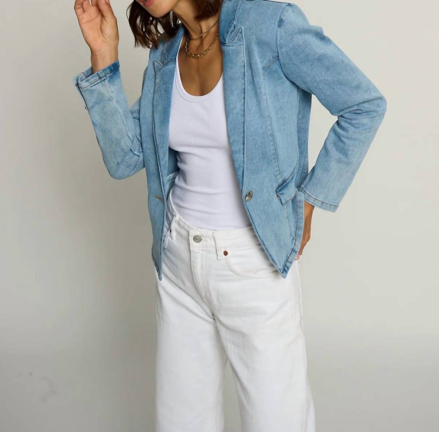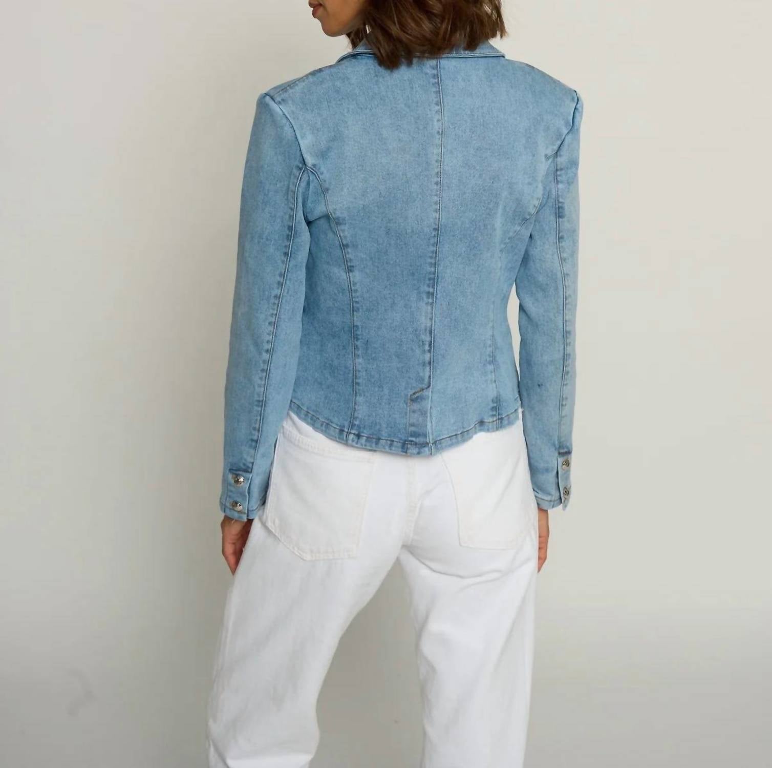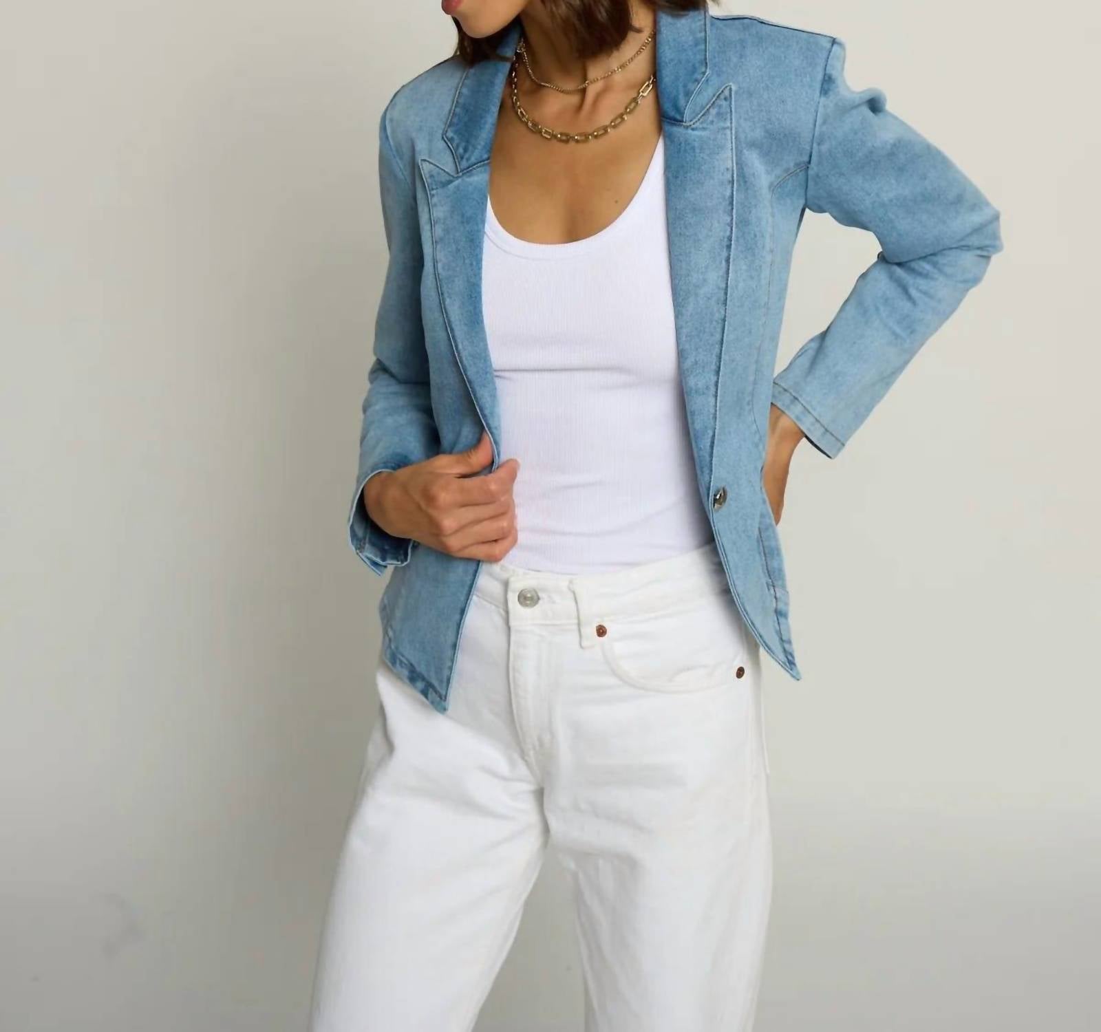 A blazer so versatile you can wear it to the office or pair it with jeans for a more casual look. Introducing the Denim Blazer by Central Park West, a chic addition to any wardrobe that embraces both timeless and modern styles. This long-sleeve blazer is crafted from 70% cotton, 29% polyester, and 1% spandex, providing comfort with a structured fit and a touch of stretch. Made from denim with a solid pattern, it features a collar neckline and a classic button closure, enhanced by metallic button accents and sharp lapels. Imported for quality, this piece is suitable for machine wash and line dry. Model is 5'9" and wears a size small.