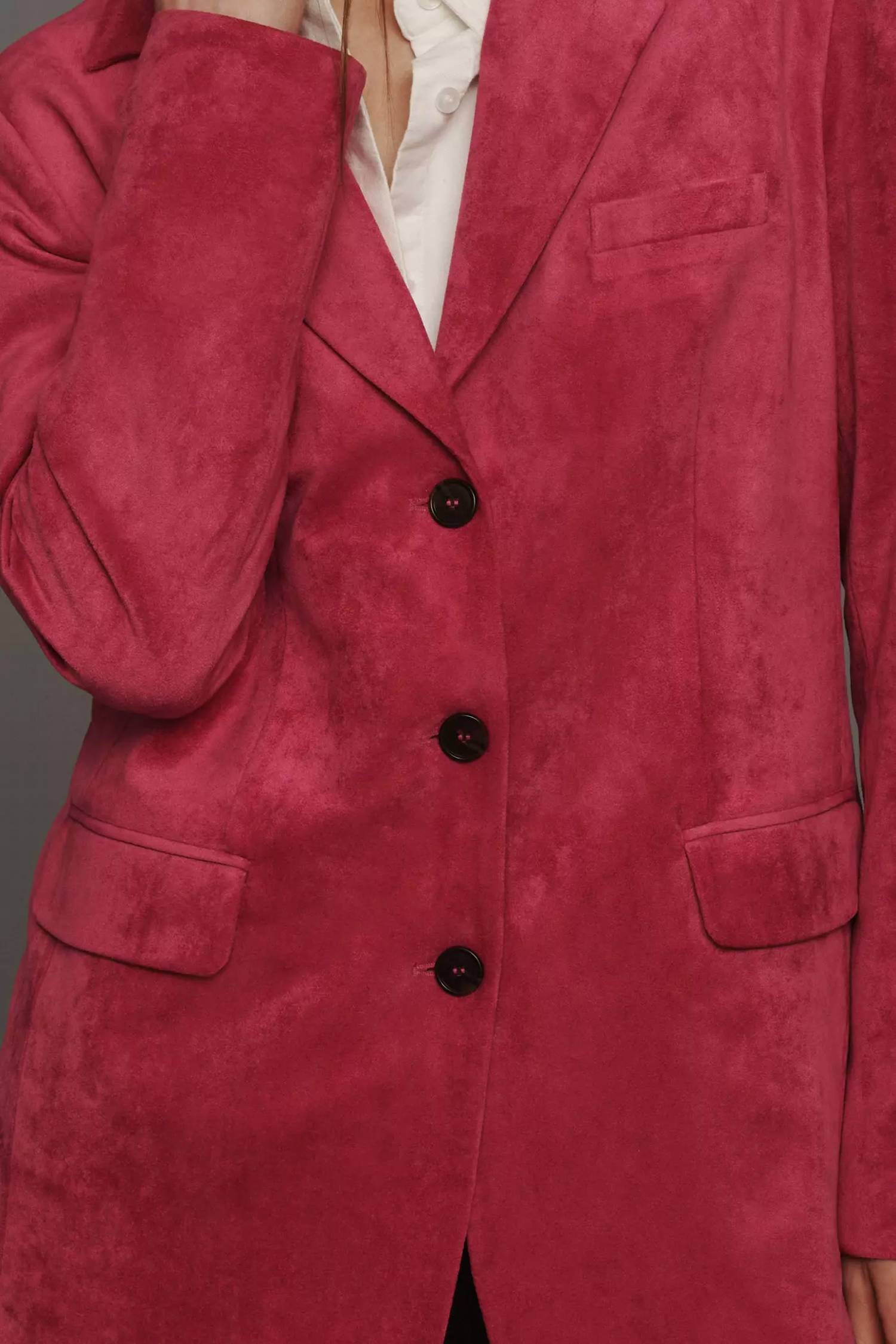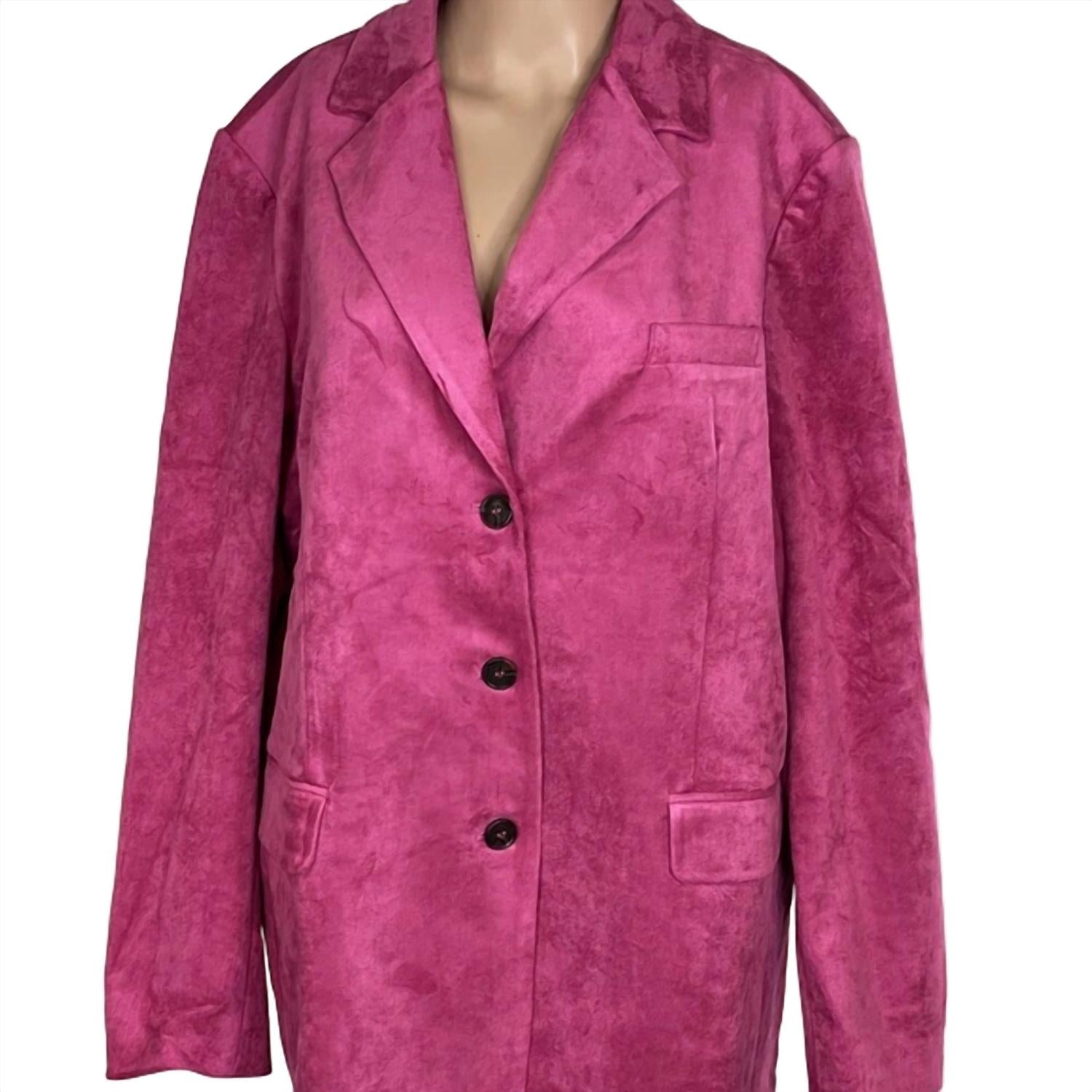 Tailored to perfection, this blazer will be your go-to jacket for years to come. Introducing the Dolan Left Coast Faux-suede Boyfriend Blazer in a charming pink hue, perfect for elevating your workwear collection. This long-sleeve blazer is crafted from faux suede with a composition of polyester and elastane, offering a comfortable and oversized fit. It features a notched lapel collar, chest welt pocket, and practical front flap pockets with a 31" length — a stylish choice for evening events. The button closure adds a classic touch, while the dry clean care ensures its upkeep throughout the fall season.