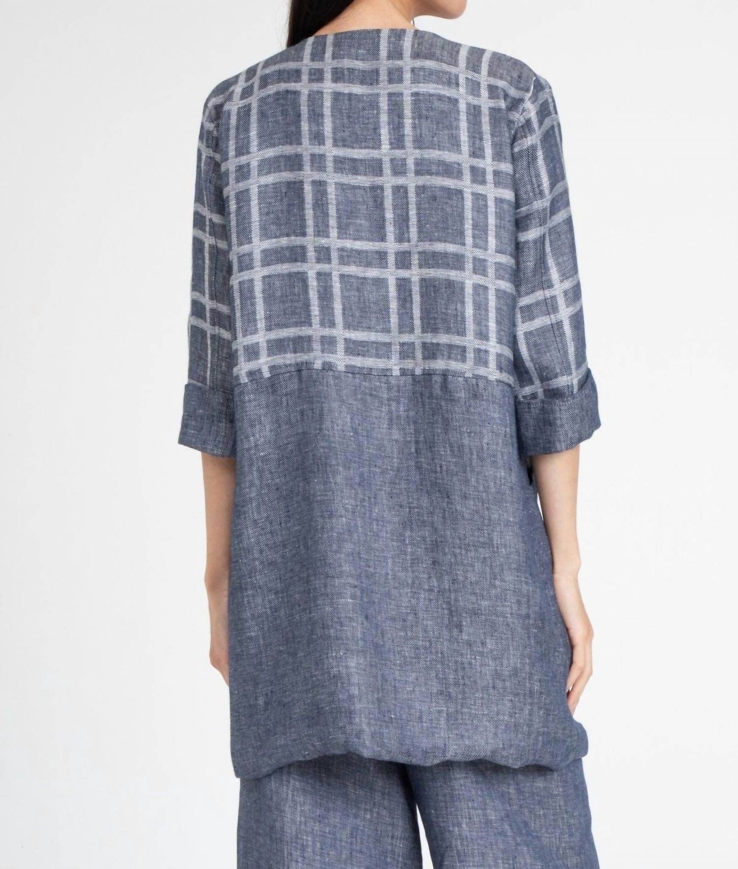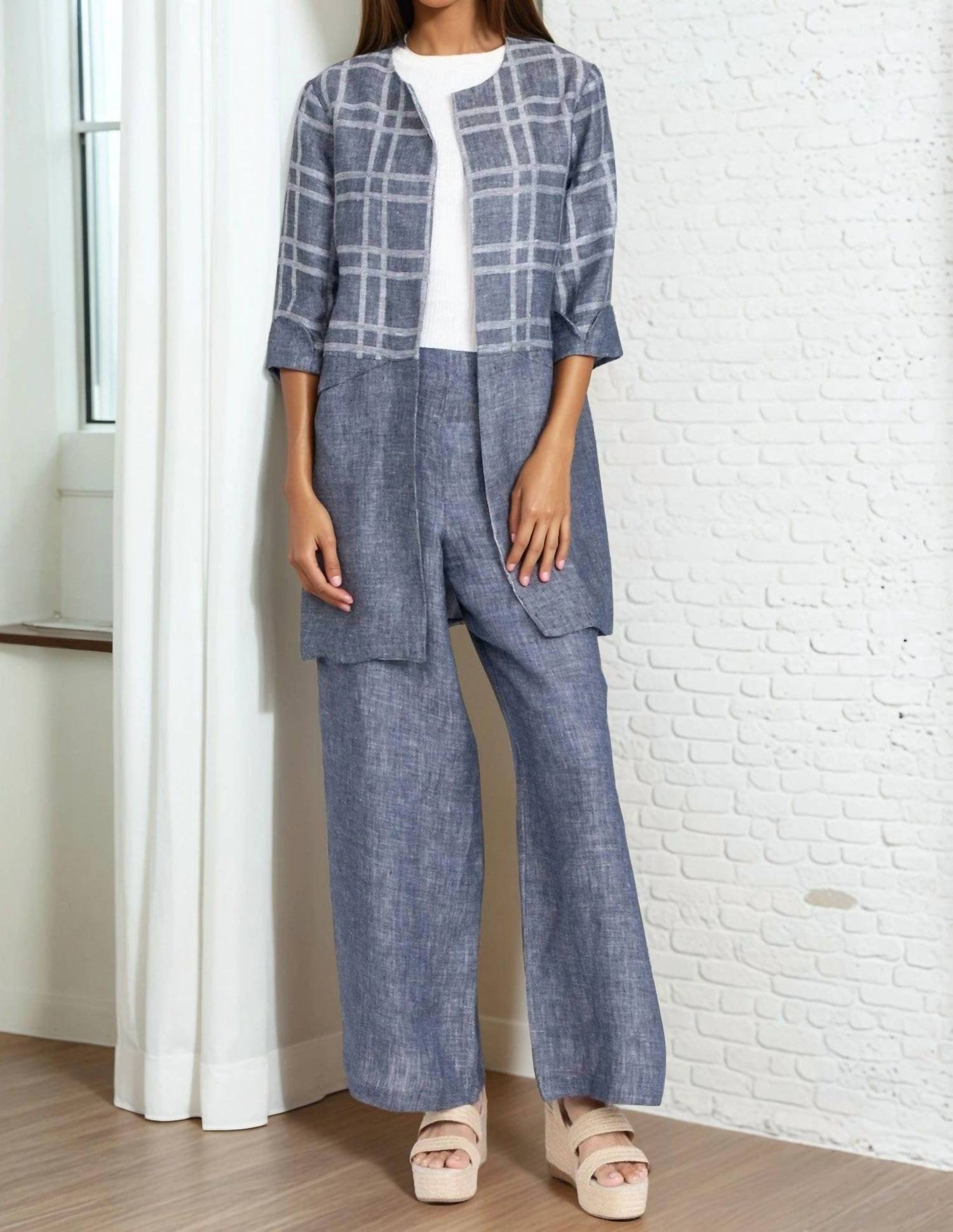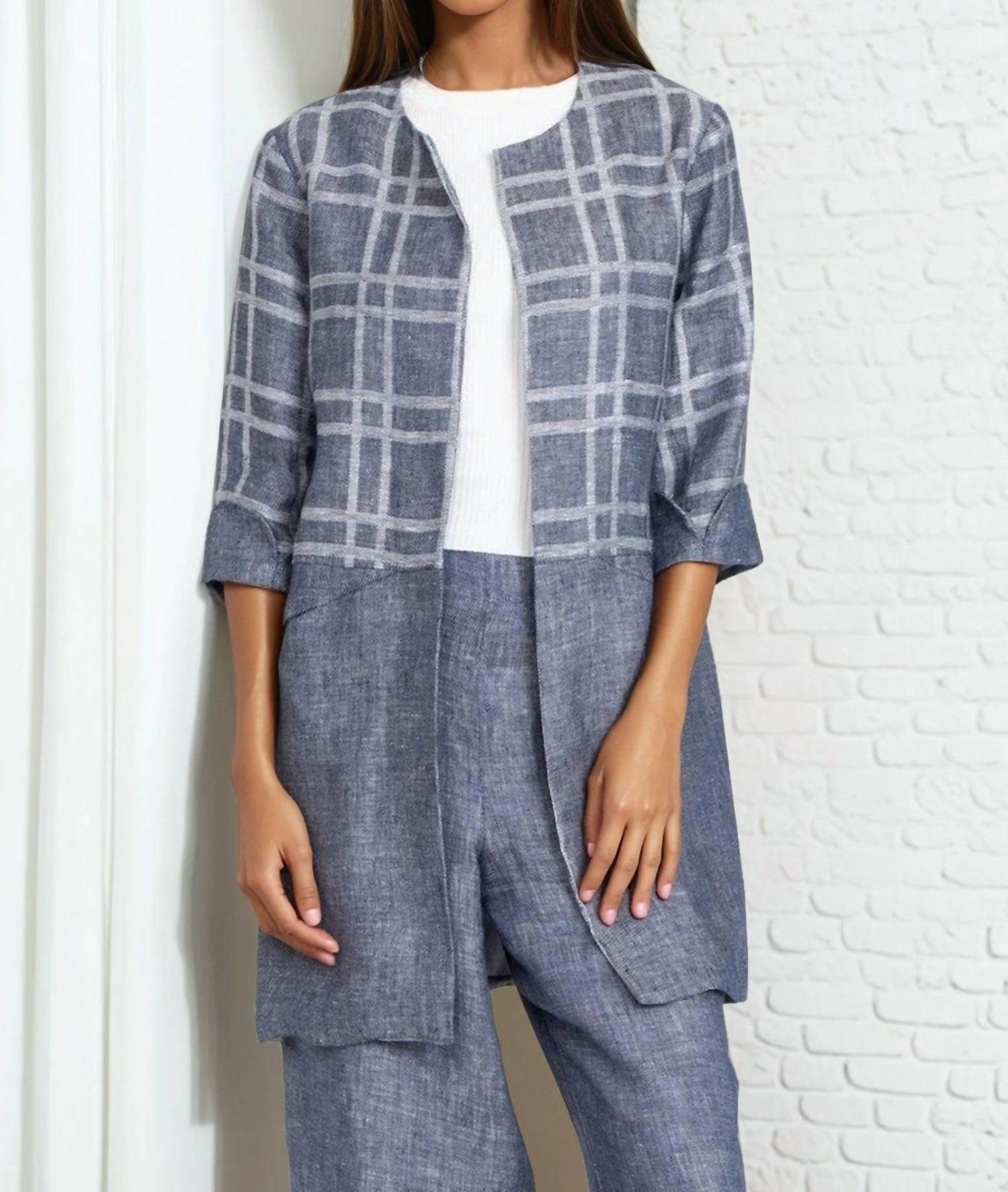 A blazer so versatile you can wear it to the office or pair it with jeans for a more casual look. Meet the Carrie Car Coat by EVA FRANCO, an indigo plaid delight that's perfect for travel. This lightweight linen piece features elbow sleeves and hidden pockets for practicality. Made proudly in the USA, its pull-on design ensures convenience without compromising style. Perfect for the fall season and those Thanksgiving get-togethers, this coat is an embodiment of vintage charm and versatility.