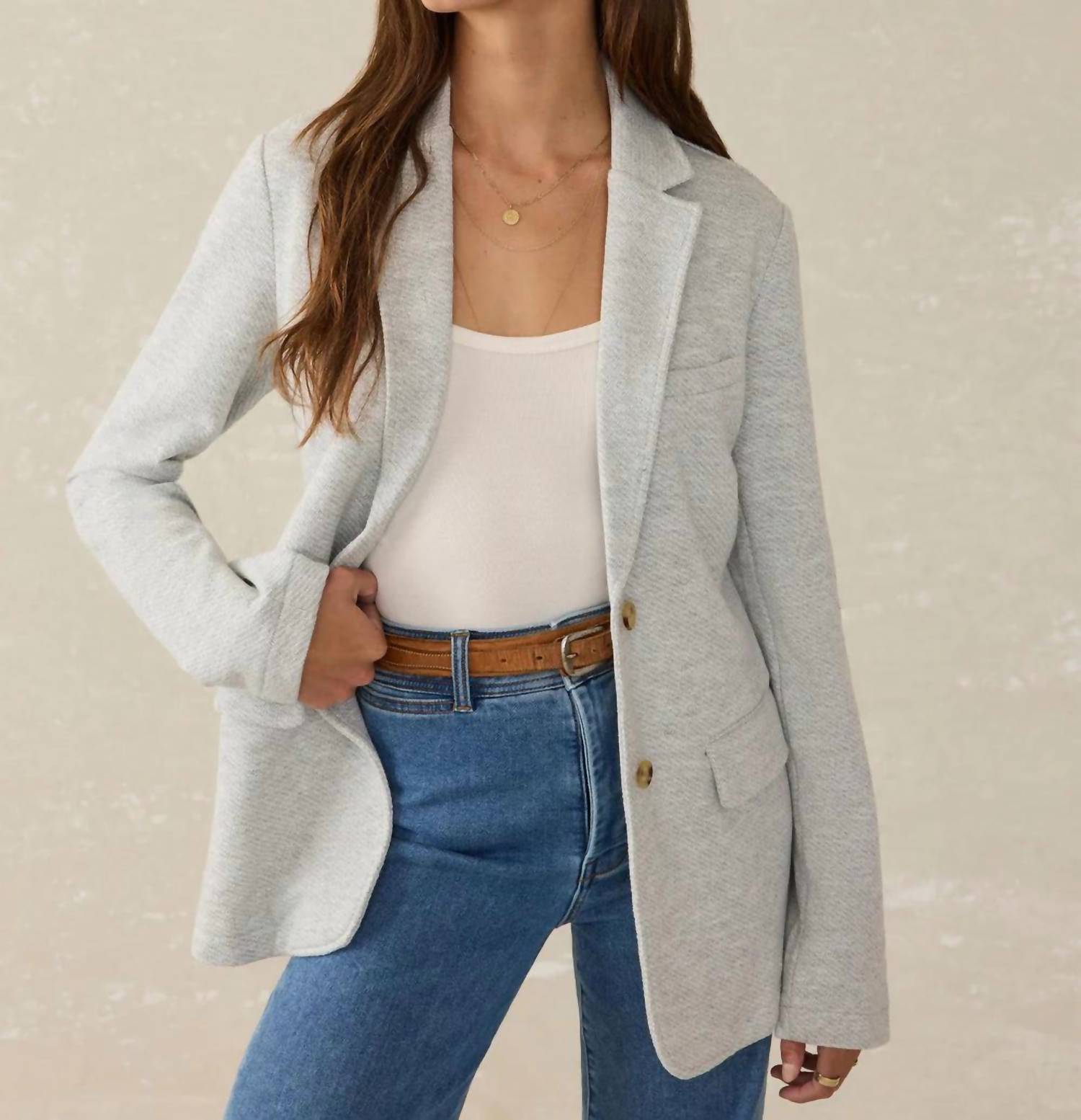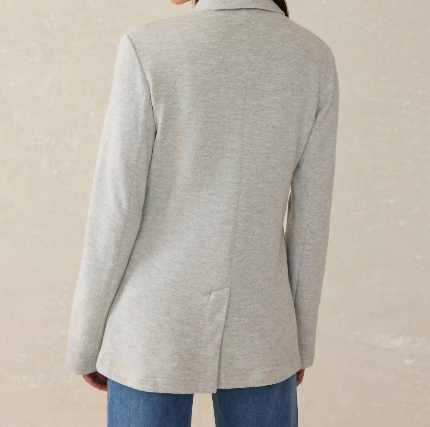 Tailored to perfection, this blazer will be your go-to jacket for years to come. The Faherty Inlet Knit Blazer in Heather Grey is where sweater, cardigan, and blazer meet for a versatile addition to any wardrobe. This classic fit garment boasts long sleeves and measures 28½" in length, crafted from a super soft blend of 85% Organic Cotton and 15% Recycled Polyester. It features an unlined blazer construction with exterior double welt pockets and a welt chest pocket, finished with a sophisticated button closure. For best care, dry clean is recommended, or machine wash cold on a delicate cycle and tumble dry low.
