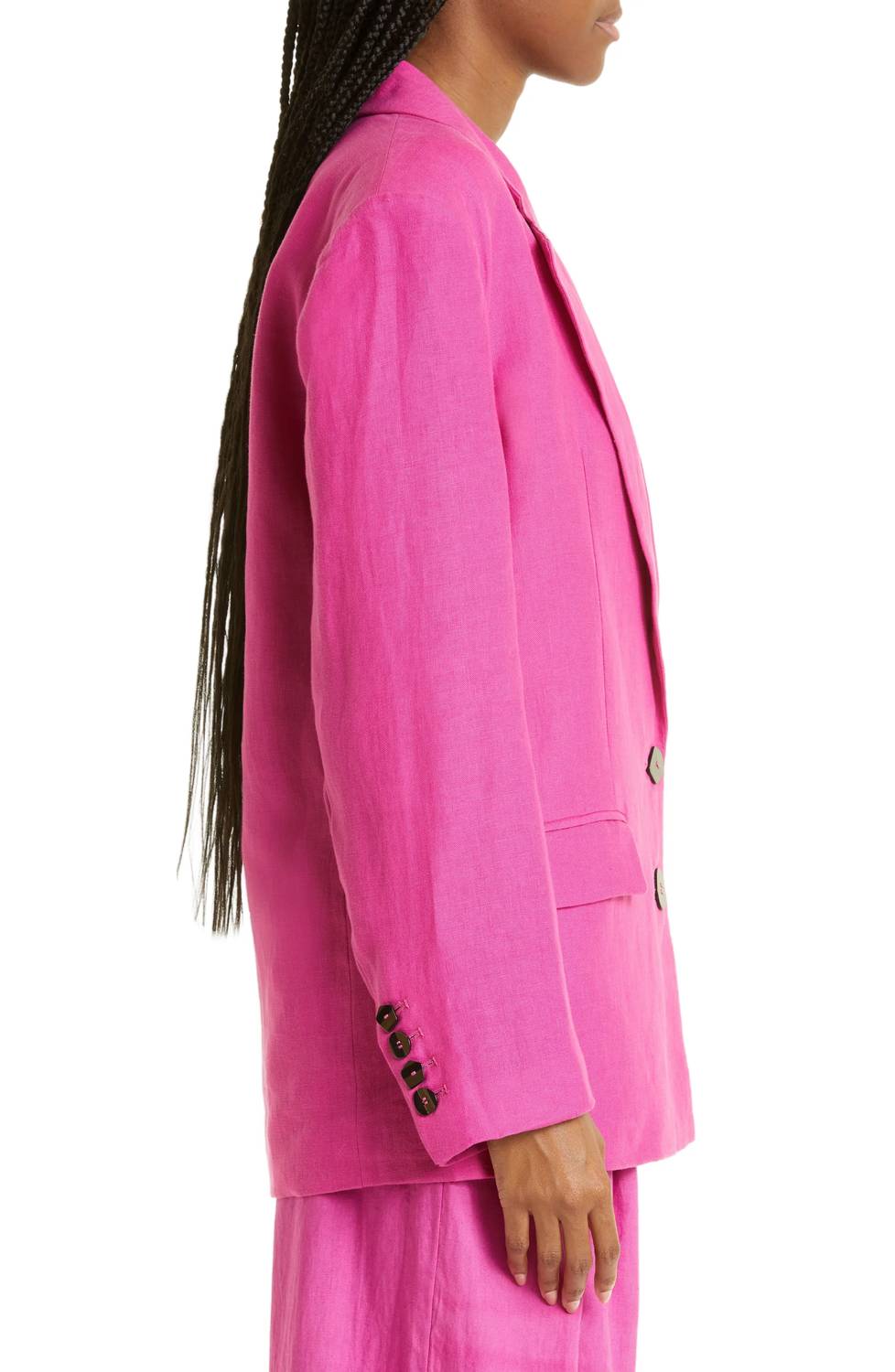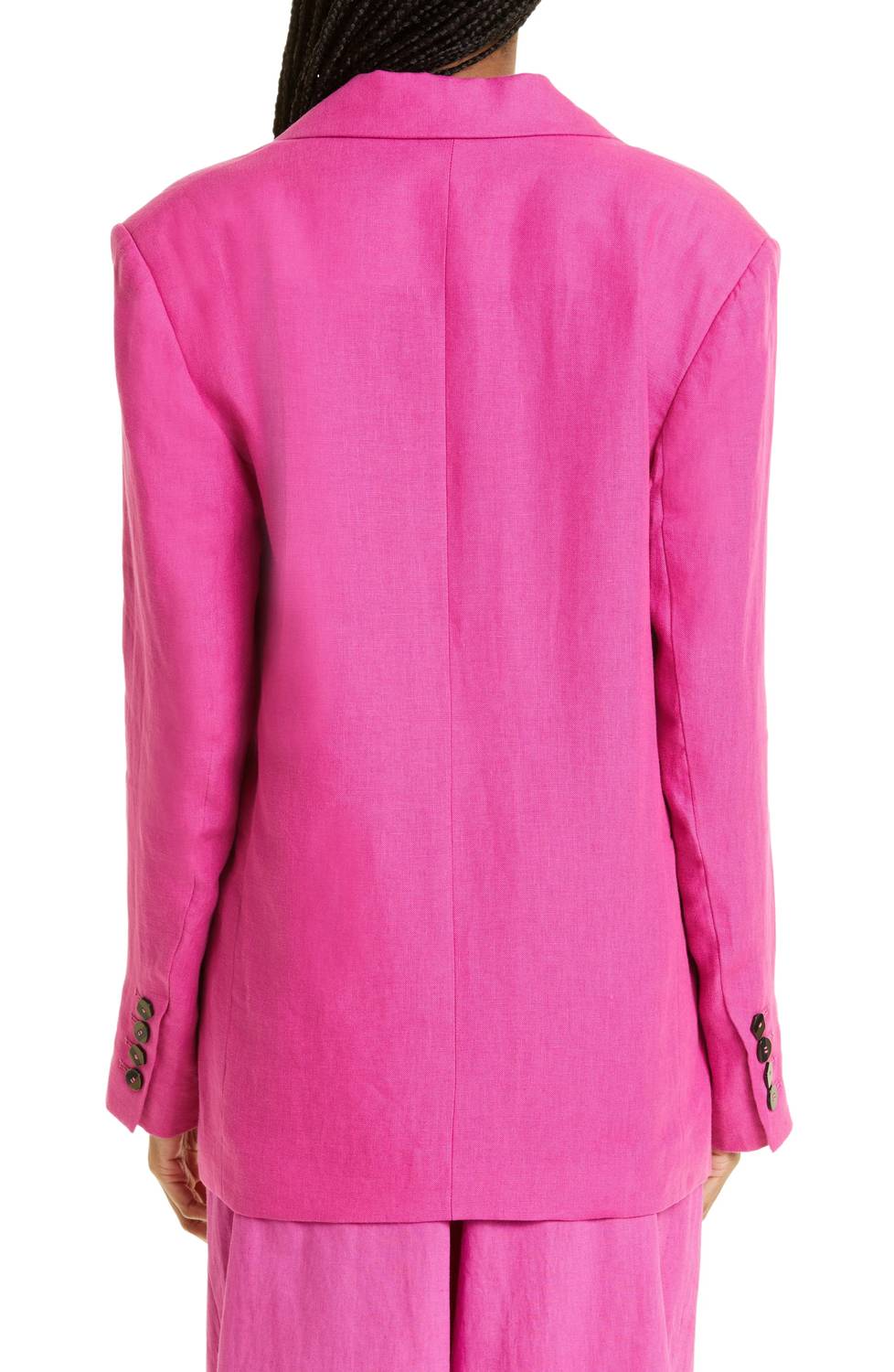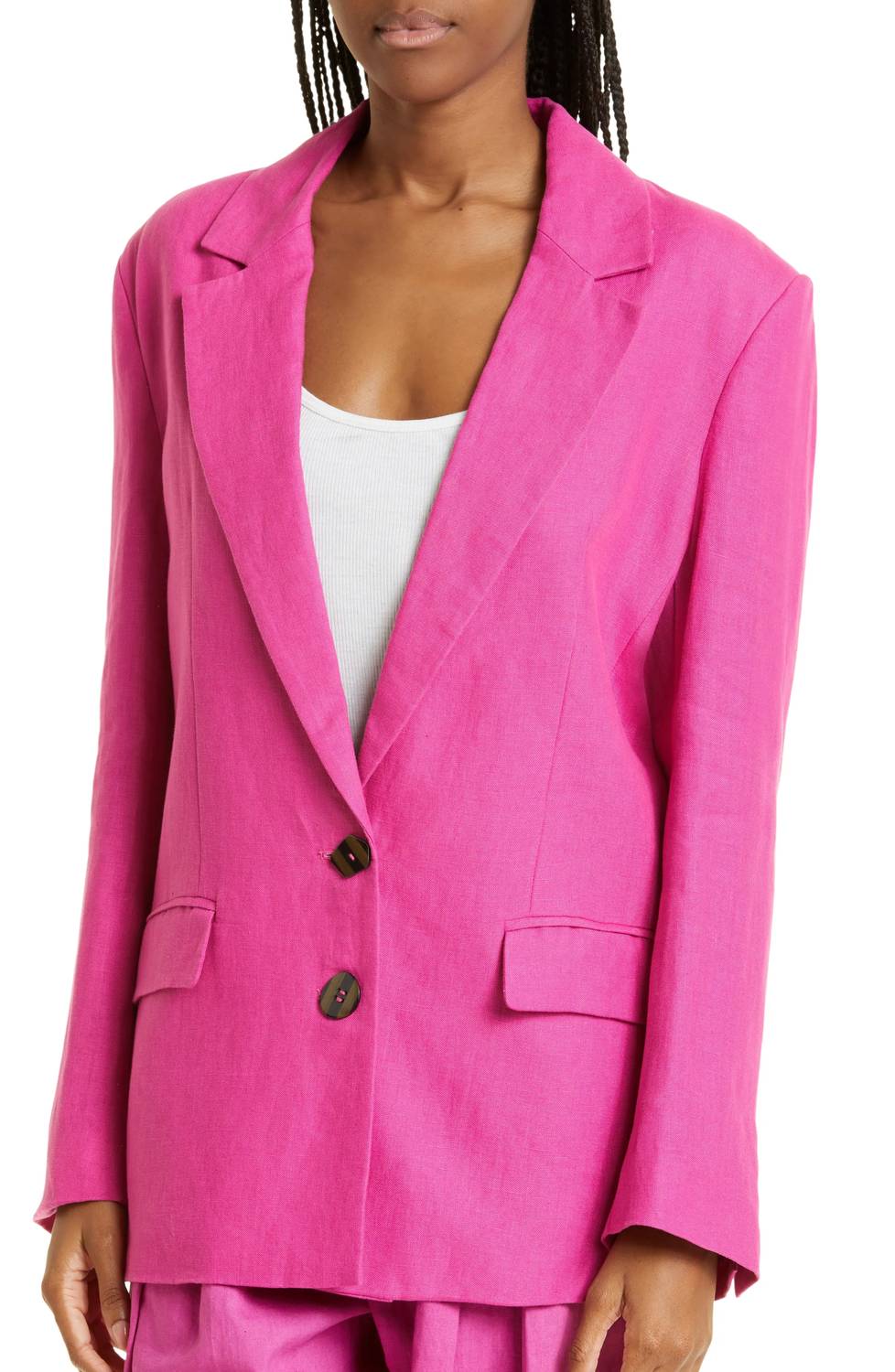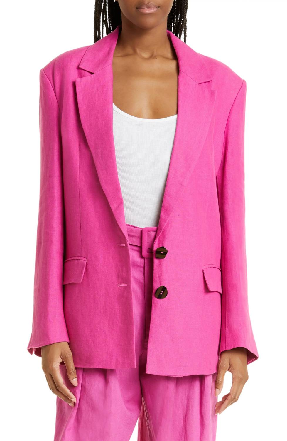An elevated version of your favorite classic blazer. Elevate your style with the FARM RIO Pink Linen Oversized Blazer, a perfect blend of flair and sophistication. This dazzling blazer boasts an oversized silhouette with a notched collar for a chic, modern look. Crafted from 100% linen, it features a length of 28.5", shoulder width of 18.5", chest of 22.5", and sleeve length of 24". The double button closure, convenient pockets, and buttoned cuffs complete its stylish and functional design.