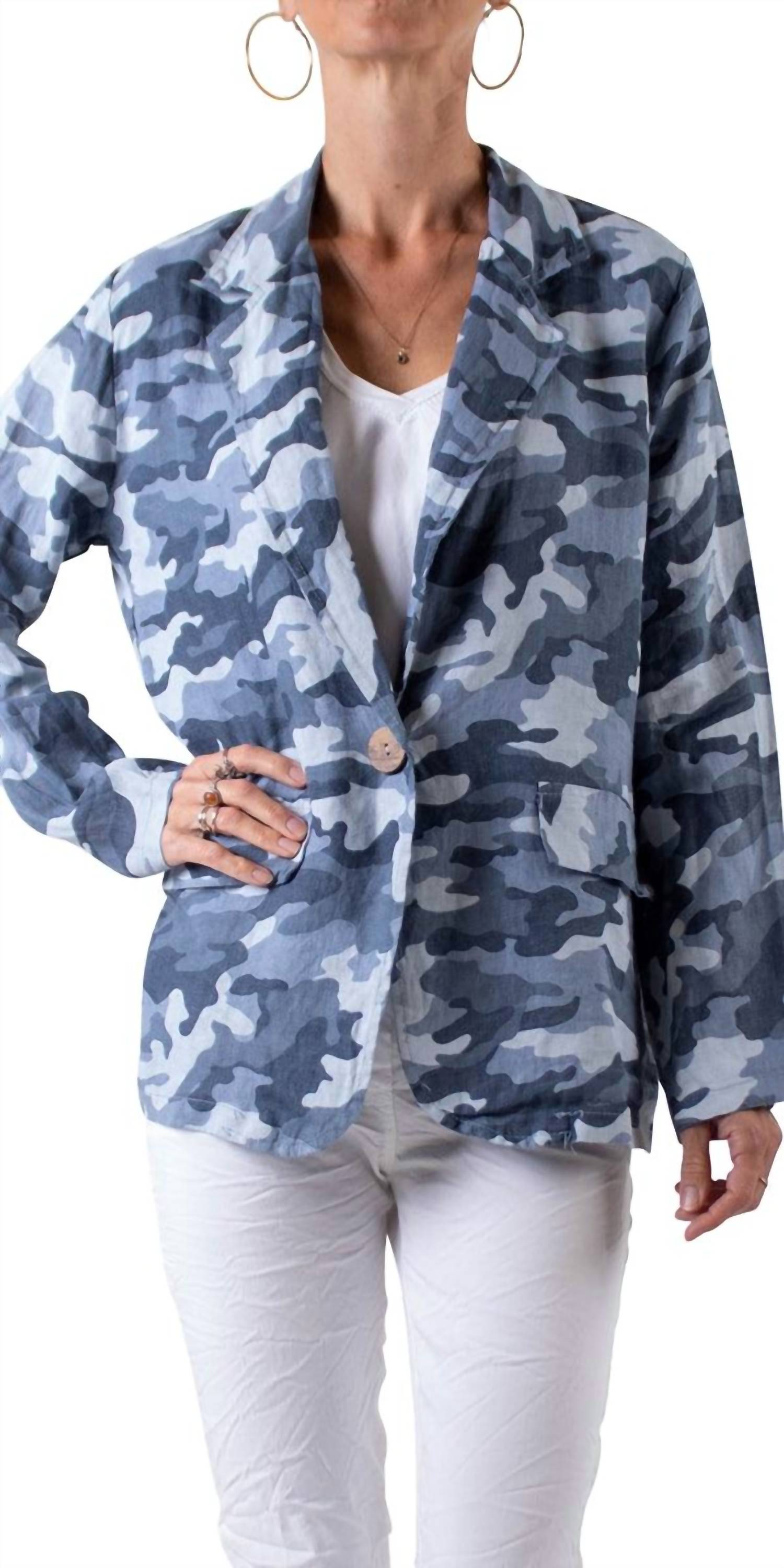 A blazer so versatile you can wear it to the office or pair it with jeans for a more casual look. Elevate your travel wardrobe with the Sabrina Camo Linen Blazer from GIGI MODA, featuring a stylish camouflage pattern in blue and a classic collar. Crafted from 100% linen, this long sleeve blazer is an Italian masterpiece with a pull-on closure and wooden front button. Perfect for fall, it effortlessly combines preppy trends with a practical design, complete with faux pockets for a sleek look. Care instructions: Hand wash and lay flat to dry. Model is 5'8".