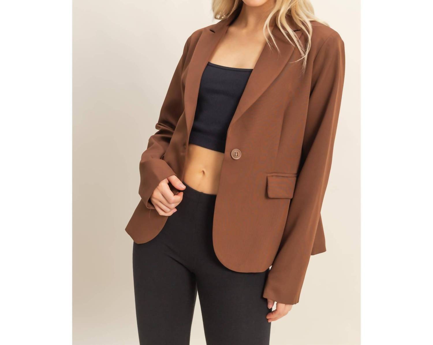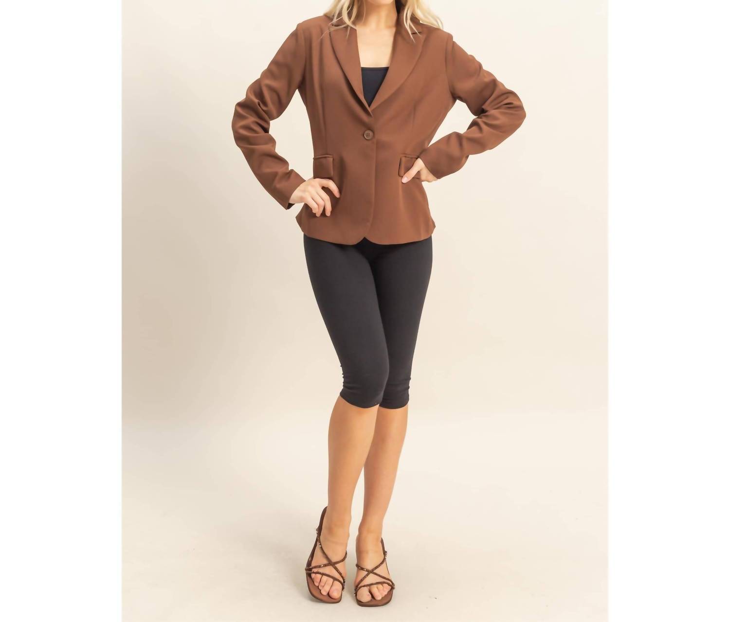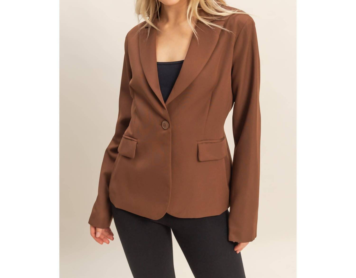 Tailored to perfection, this blazer will be your go-to jacket for years to come. Elevate your wardrobe with the HYFVE Single Button Blazer in classic black, perfect for any workwear occasion. This modern blazer features long sleeves, crisp notched lapels, and a single button closure, exuding sophistication in its solid design. Crafted from a durable blend of 92% polyester and 8% spandex, it guarantees comfort and a flattering fit. Designed in the USA, it's accentuated with practical flap pockets for a timeless look. Model is 5'9" with a 34" chest, 24" waist, and 35" hips, wearing a size small.