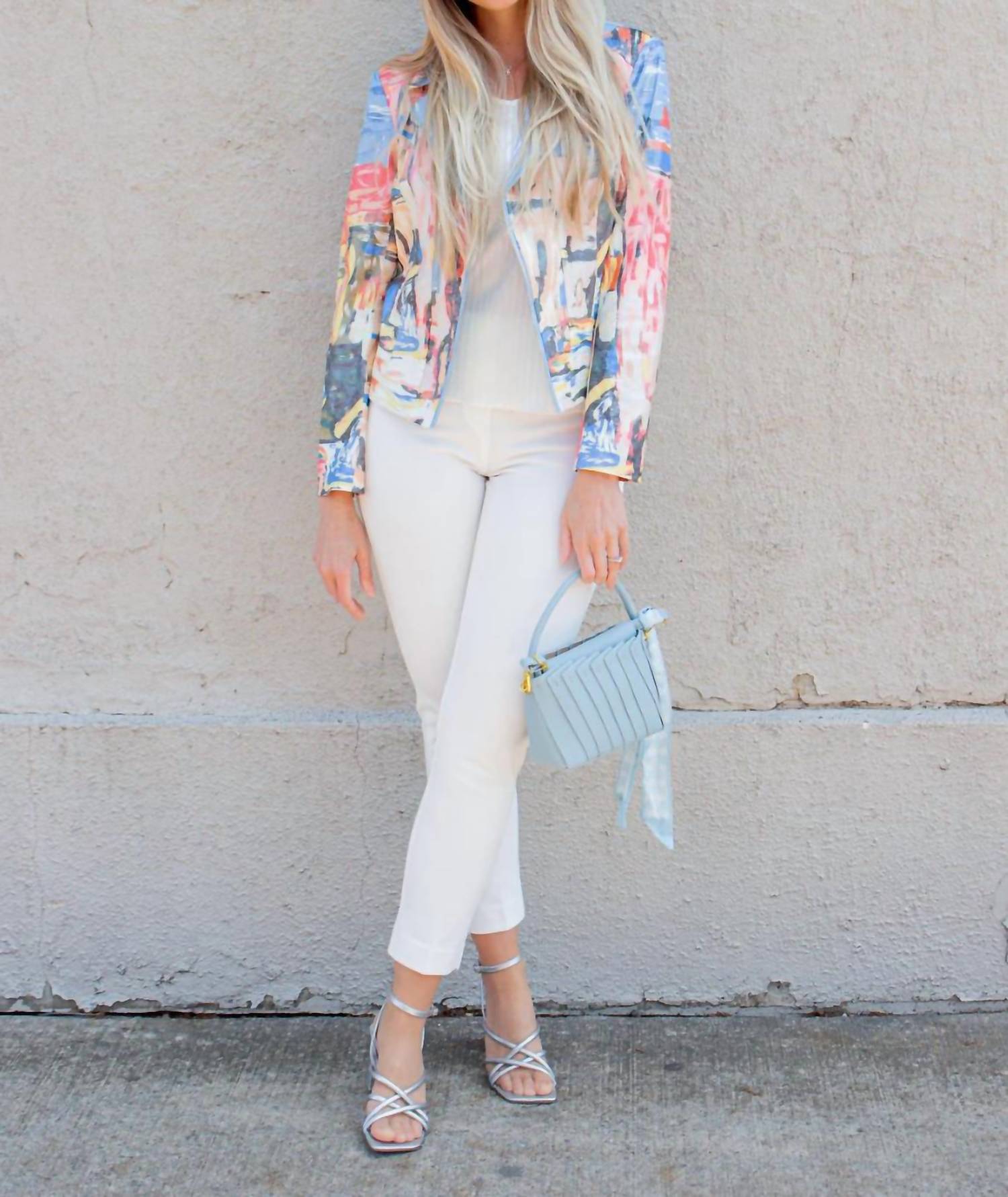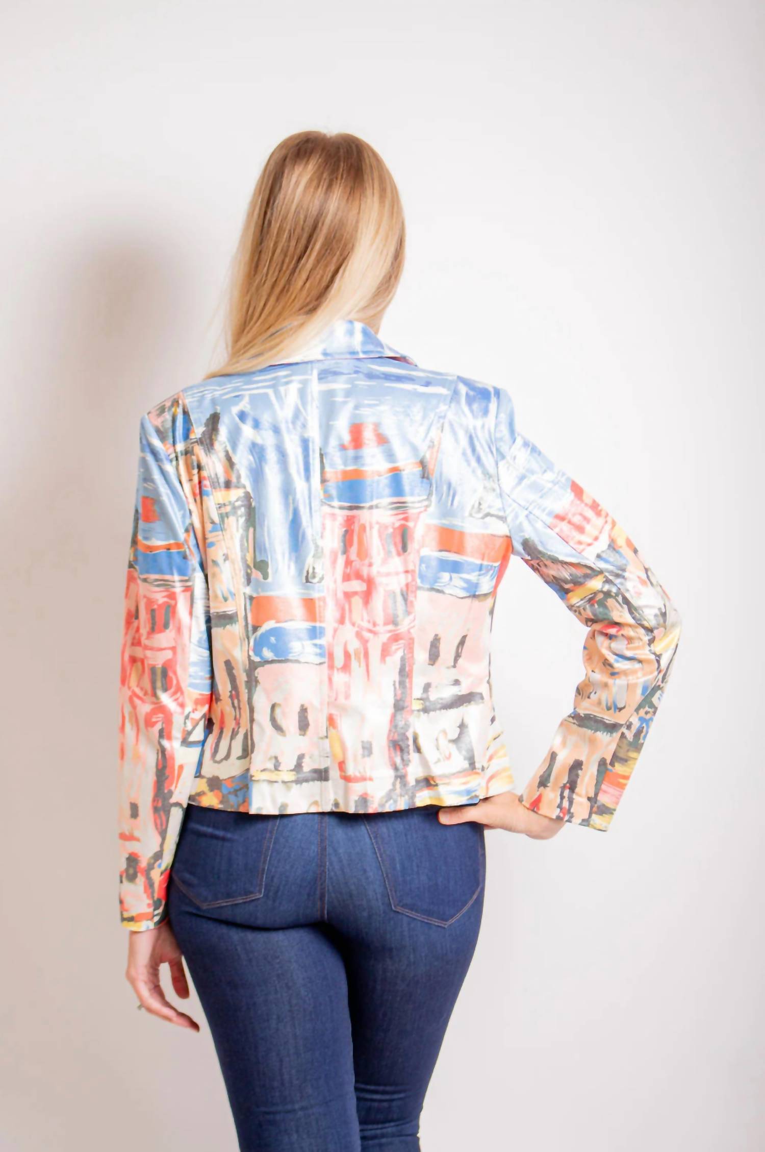 A blazer so versatile you can wear it to the office or pair it with jeans for a more casual look. Metallic Vegan Moto Leather Jacket. Hook and eye closure. Zipper trim. Dry clean only. 90% Polyester, 10% Spandex
