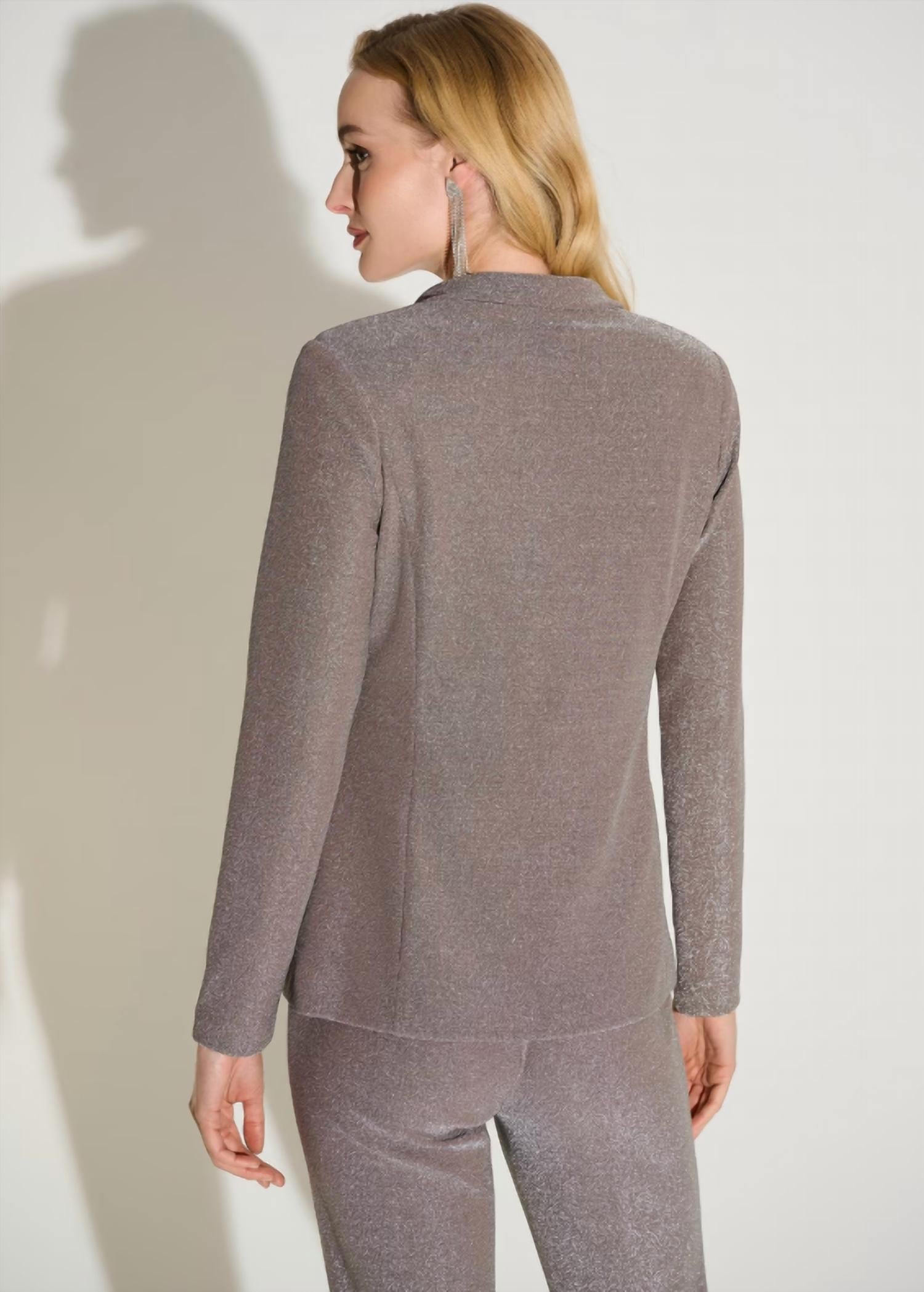An elevated version of your favorite classic blazer. Introducing this elegant blazer that seamlessly blends business polish with feminine style. Designed with a hip-length silhouette and a comfortable regular fit, it features a collared neckline, long straight sleeves, and an open-front design accented with subtle shimmer and decorative buttons. Perfect for formal occasions, office wear, or evening outings, this versatile piece adds refined sophistication to any look. Crafted from a luxe blend of 75% nylon, 20% metal fibre, and 5% spandex, it’s finished with a clean design and no pockets or zipper.